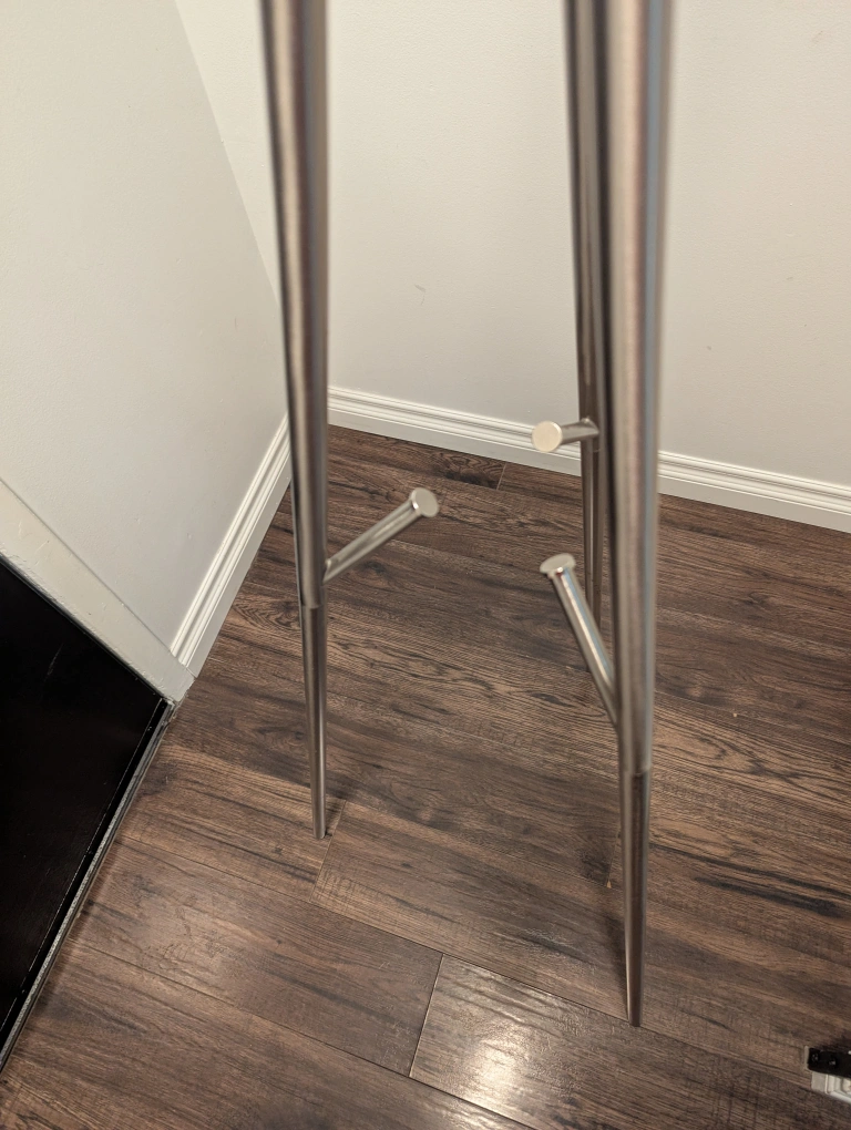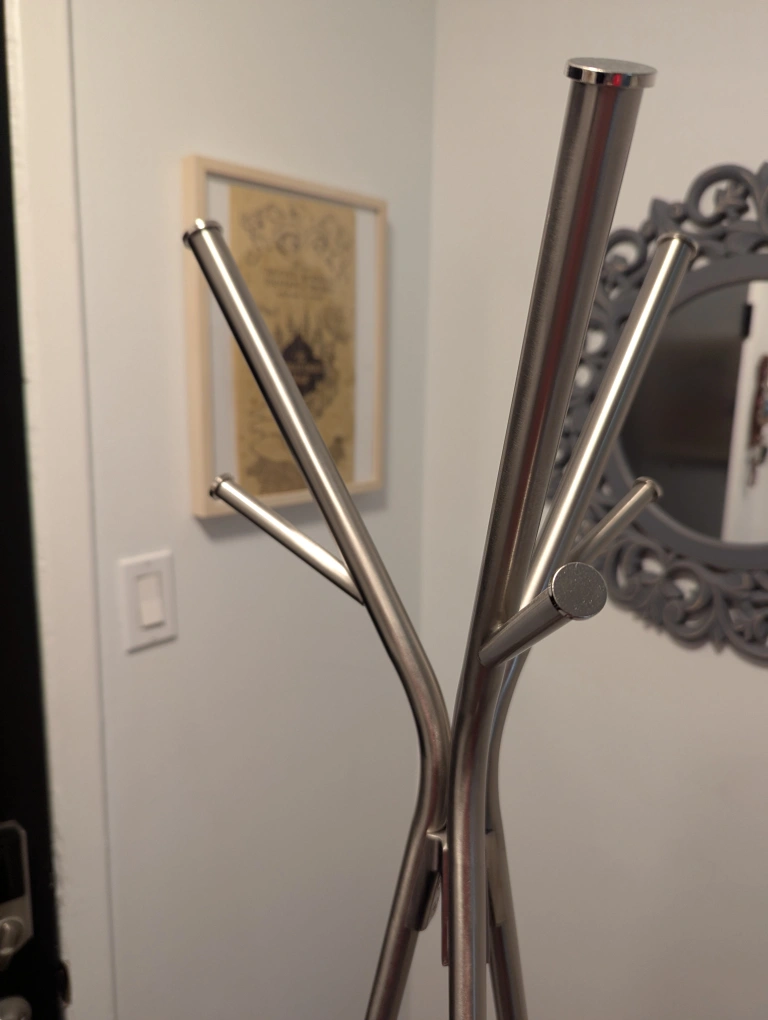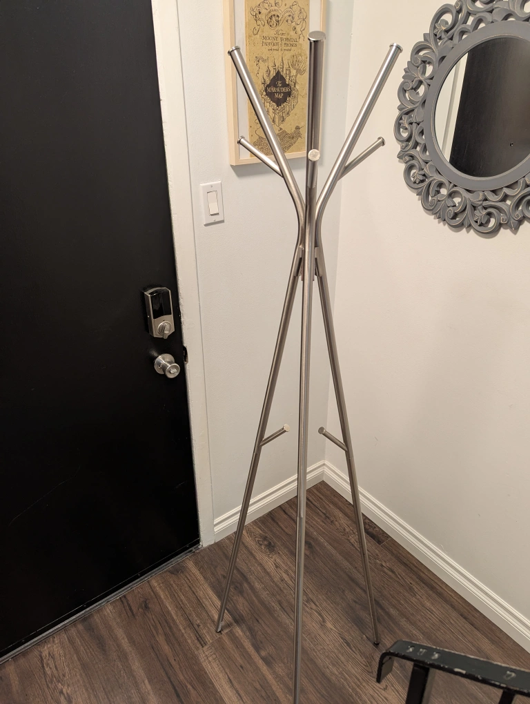 A sleek coat rack. Made of silver metal. Features multiple hooks for hanging. Great for decluttering your entryway so you can relax after a long day. IKEA: https://www.ikea.com/ca/en/p/ekrar-hat-and-coat-stand-white-10415594/?utm_source=google&utm_medium=surfaces&utm_campaign=shopping_feed&utm_content=free_google_shopping_clicks_Bedroomfurniture&gad_source=1&gad_campaignid=15835029354&gclid=CjwKCAjwpMTCBhA-EiwA_-MsmWZ8XpiUiZ5vopbrJaK5tIOLRqjX7BjF3xXjeUR-F4gCjbqdT-0z6BoCOo0QAvD_BwE
