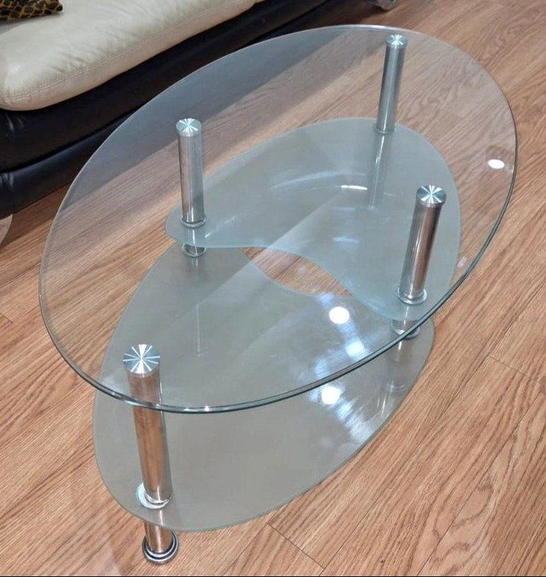 Upgrade your living room with this elegant glass coffee table that blends modern design with everyday practicality. Its unique oval shape and combination of clear and frosted glass surfaces make it a standout piece in any contemporary space. Features: - Clear glass top with smooth edges – perfect for displaying décor or serving drinks - Two frosted glass shelves below for extra storage – ideal for books, remotes, or magazines - Sturdy metallic legs with a polished finish for a clean, modern look - Compact yet spacious – fits beautifully in condos, apartments, or cozy living rooms - Gently used and in excellent condition Dimensions: Height - 16.5" x Length -39" x Width - 23.5" Asking Price: $150.00