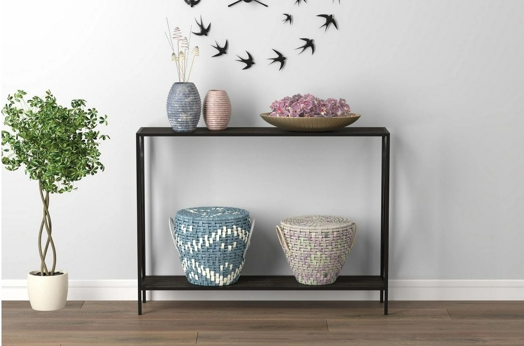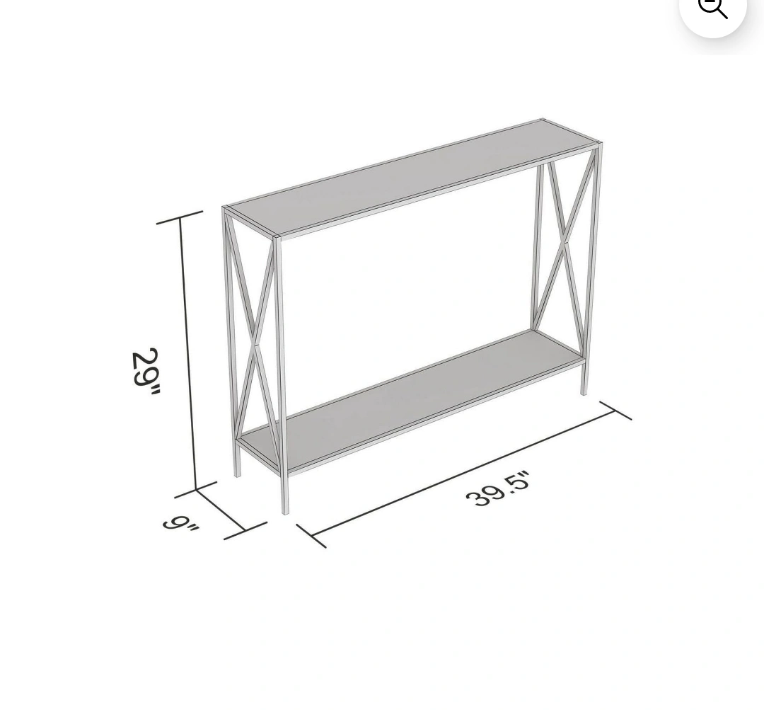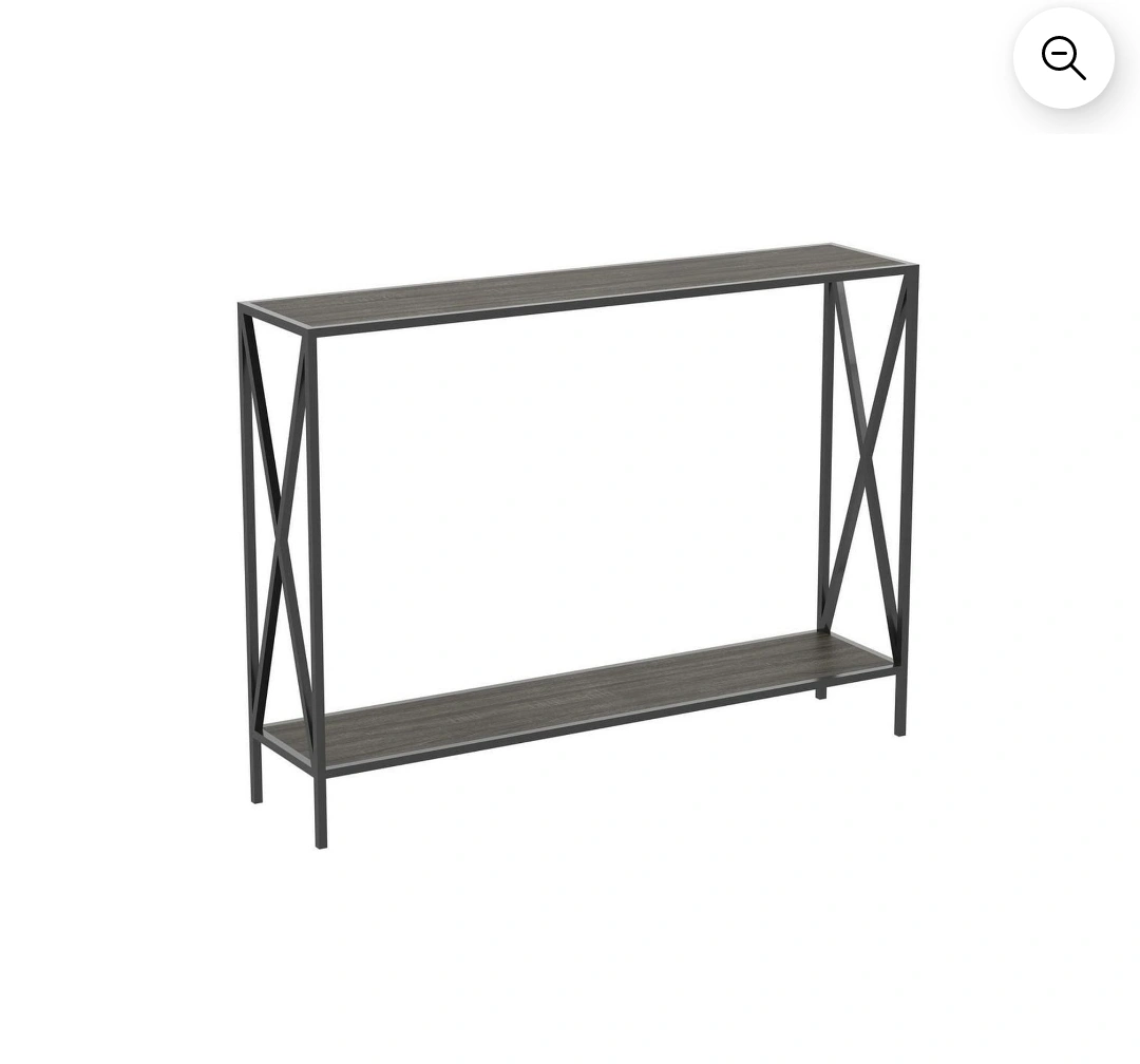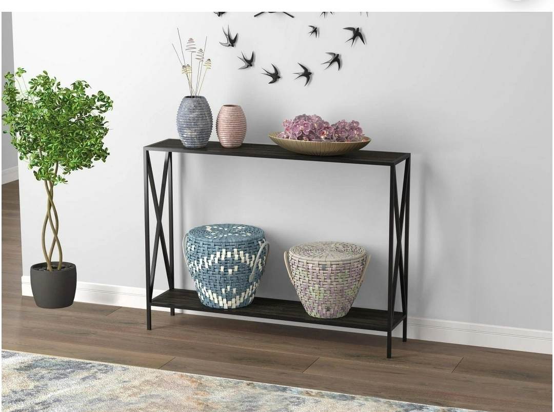 brand new Sealed Stylish console table, features a dark wood grain top and lower shelf. Black metal frame with an X-shaped design. Perfect for entryway or living room. Dimensions: 39.5" W x 9" D x 29" H.