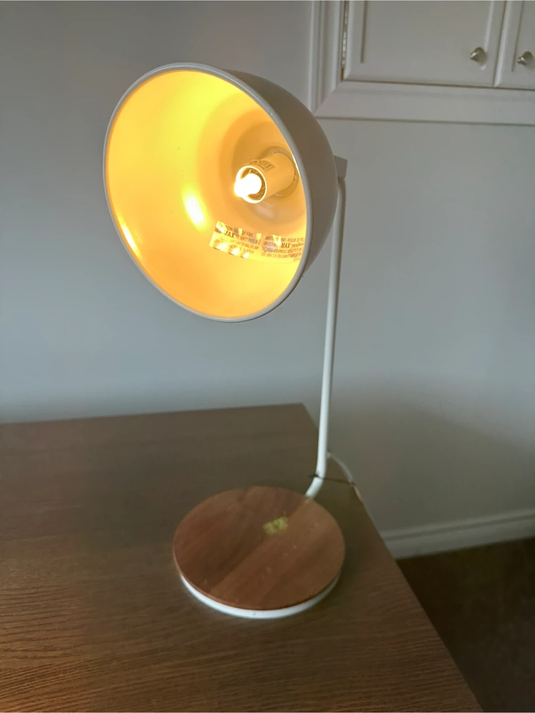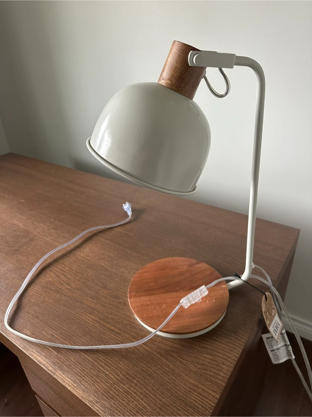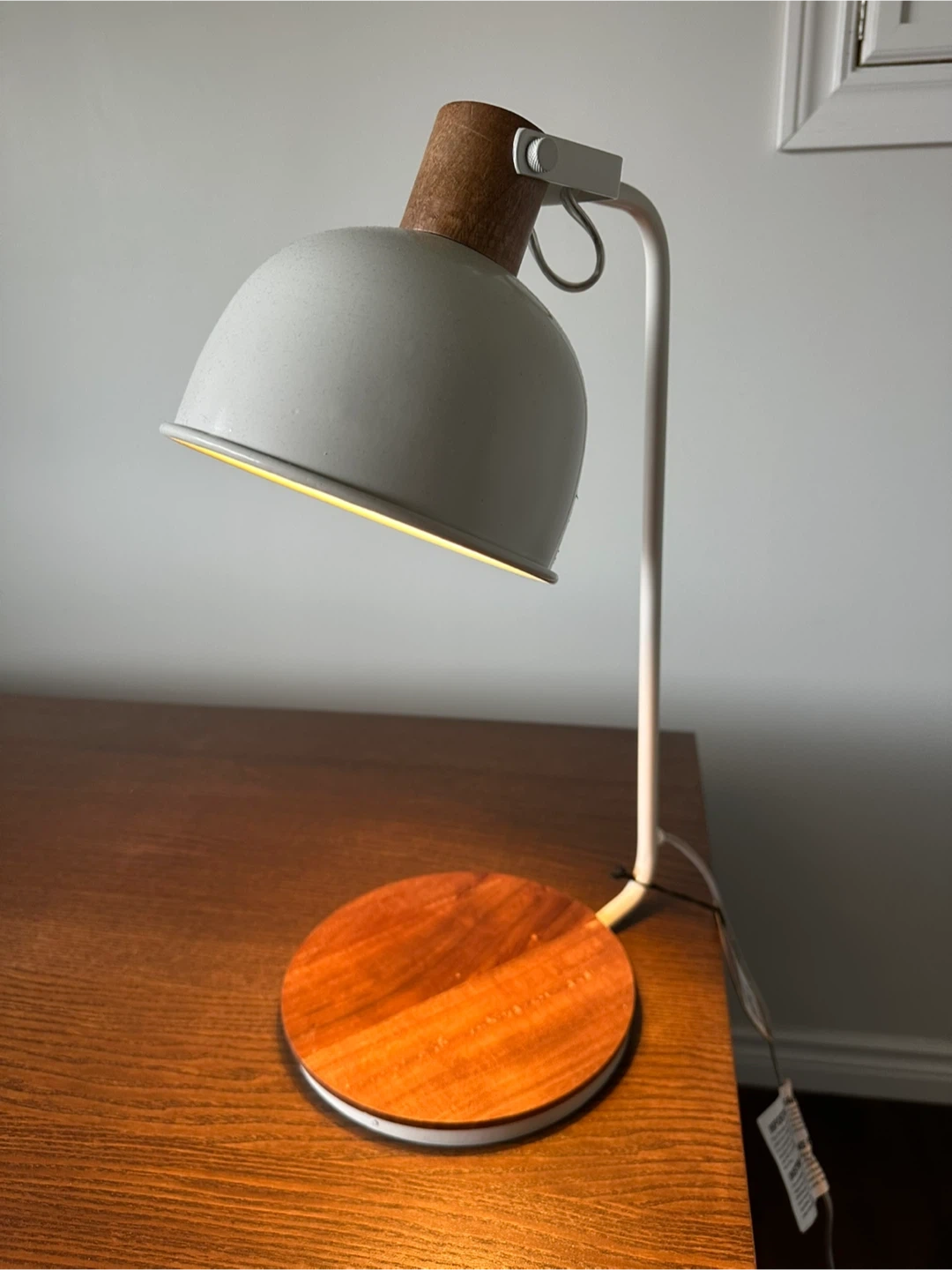 This modern desk lamp has a lovely wood and white finish! It's perfect for adding a touch of style to your workspace or bedside table. It's in great condition and provides a warm, inviting light