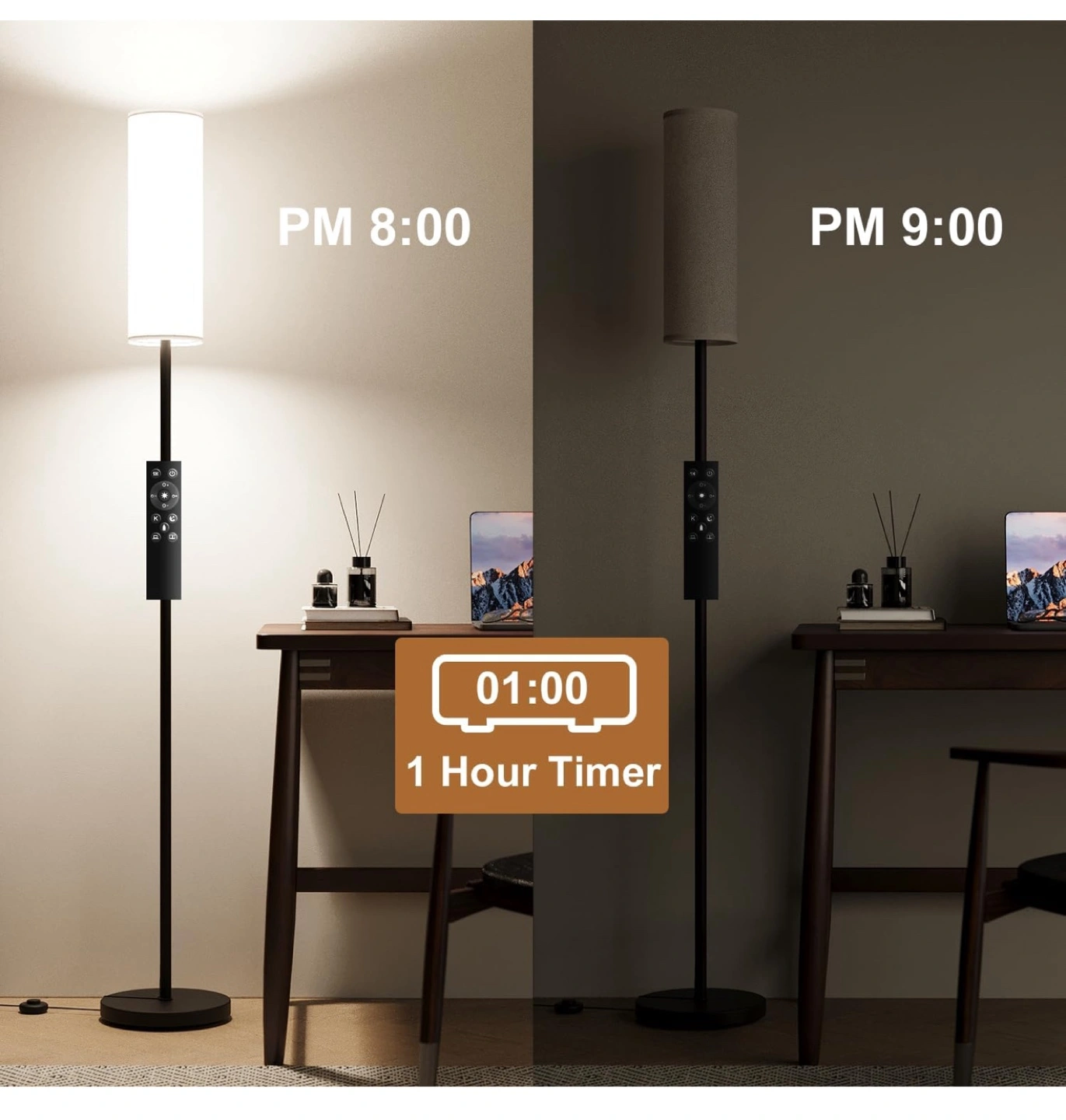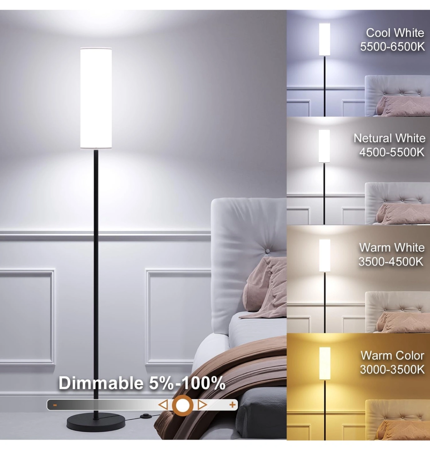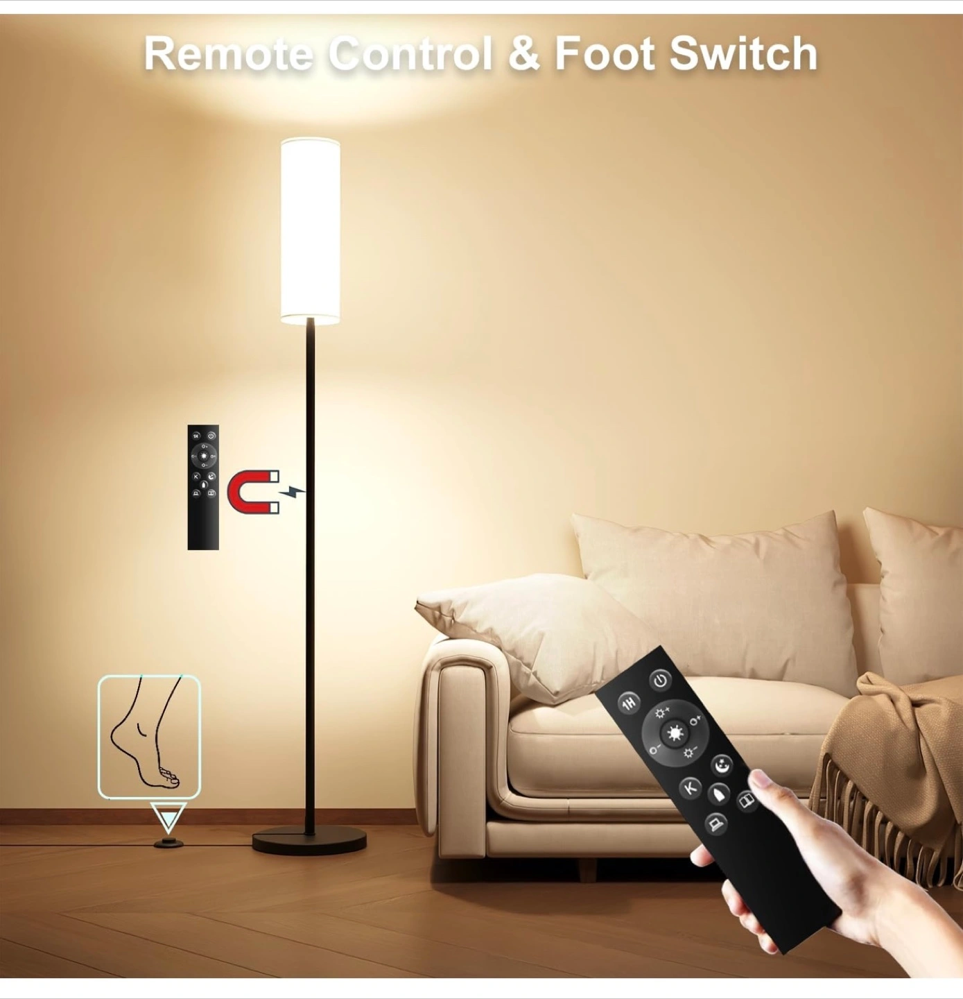 Looking to brighten up your space? This modern LED floor lamp is perfect for adding a touch of elegance to any room! It features: - Dimmable settings from 5% to 100% - Adjustable colour temperatures (Cool White, Neutral White, Warm White, Warm Colour) - A convenient remote control and foot switch for easy operation - A built-in 1-hour timer function It's lightweight and easy to move around at only 1.9kg. The lamp stands at 67 inches (170 cm) tall and has a base diameter of 7.1 inches (18 cm)