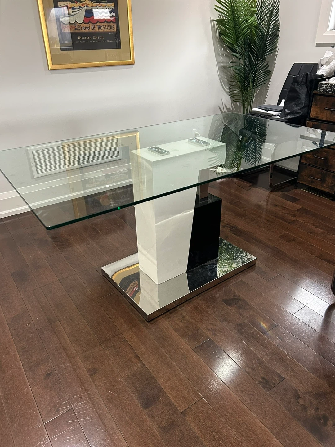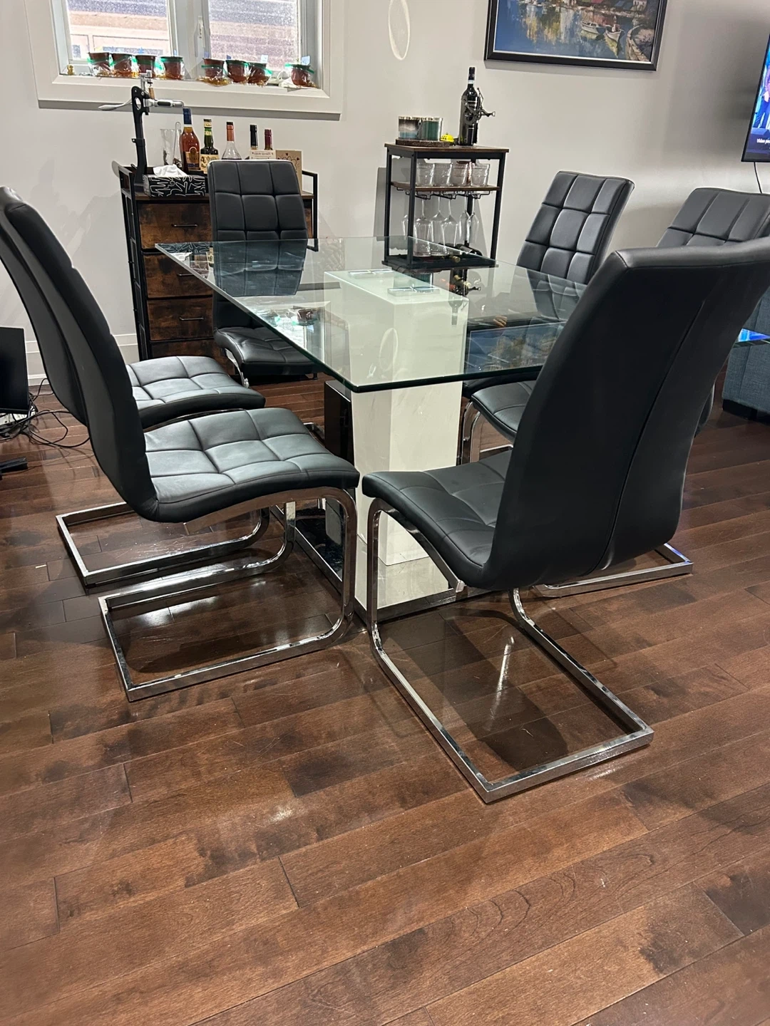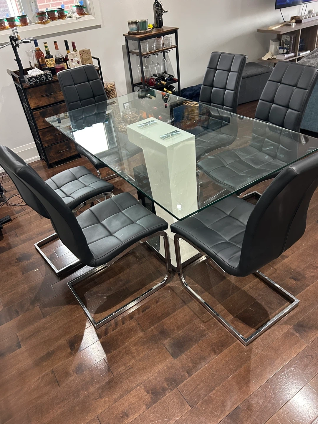 Sleek and stylish dining set in excellent condition! Includes: ✔️ Tempered glass tabletop ✔️ Unique modern base with high-gloss white and black finish + chrome accent ✔️ 6 brown faux leather chairs with chrome cantilever frames Perfect for a modern dining room, kitchen, or office meeting space. No chips, cracks, or major wear — gently used in a pet-free, smoke-free home. 📐 Dimensions (Approx.): Table: 60” L x 35.5” W x 30” H 🛻 Pickup only — will need 2 people to move the glass top.