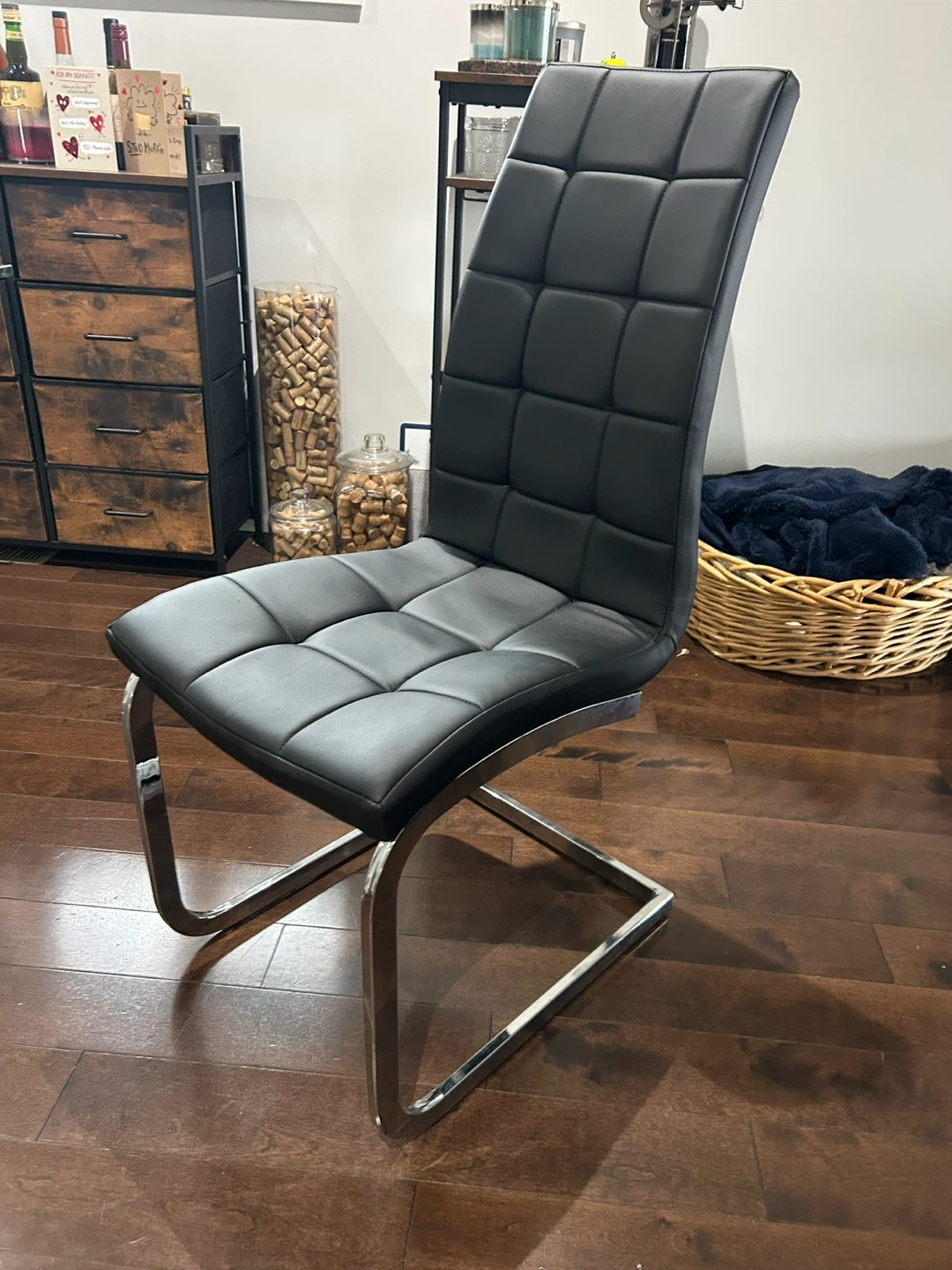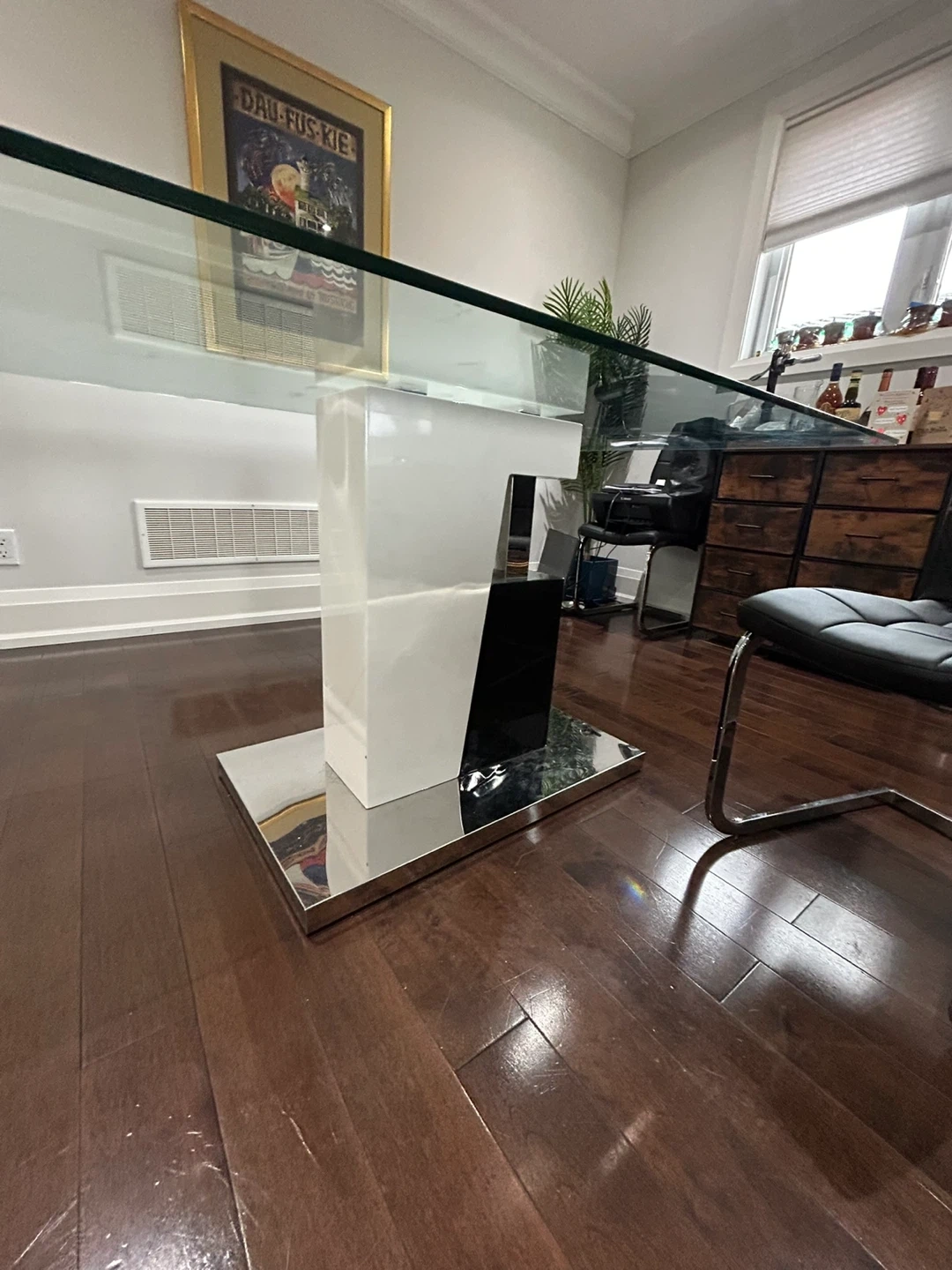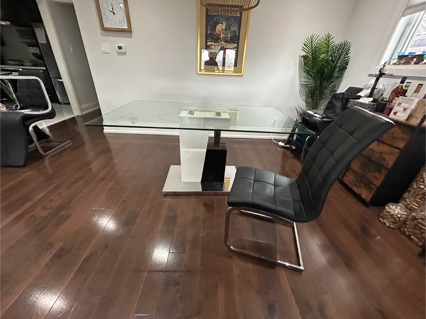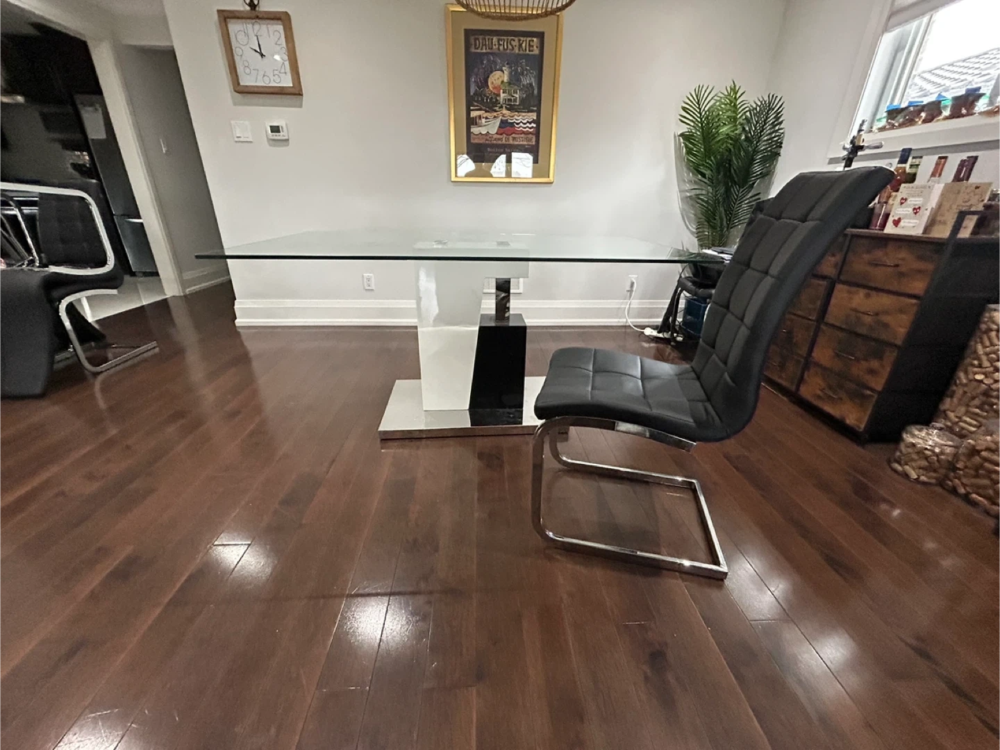 Sleek and stylish dining set in excellent condition! Includes: ✔️ Tempered glass tabletop ✔️ Unique modern base with high-gloss white and black finish + chrome accent ✔️ 6 brown faux leather chairs with chrome cantilever frames Perfect for a modern dining room, kitchen, or office meeting space. No chips, cracks, or major wear — gently used in a pet-free, smoke-free home. 📐 Dimensions (Approx.): Table: 60” L x 35.5” W x 30” H 🛻 Pickup only — will need 2 people to move the glass top.