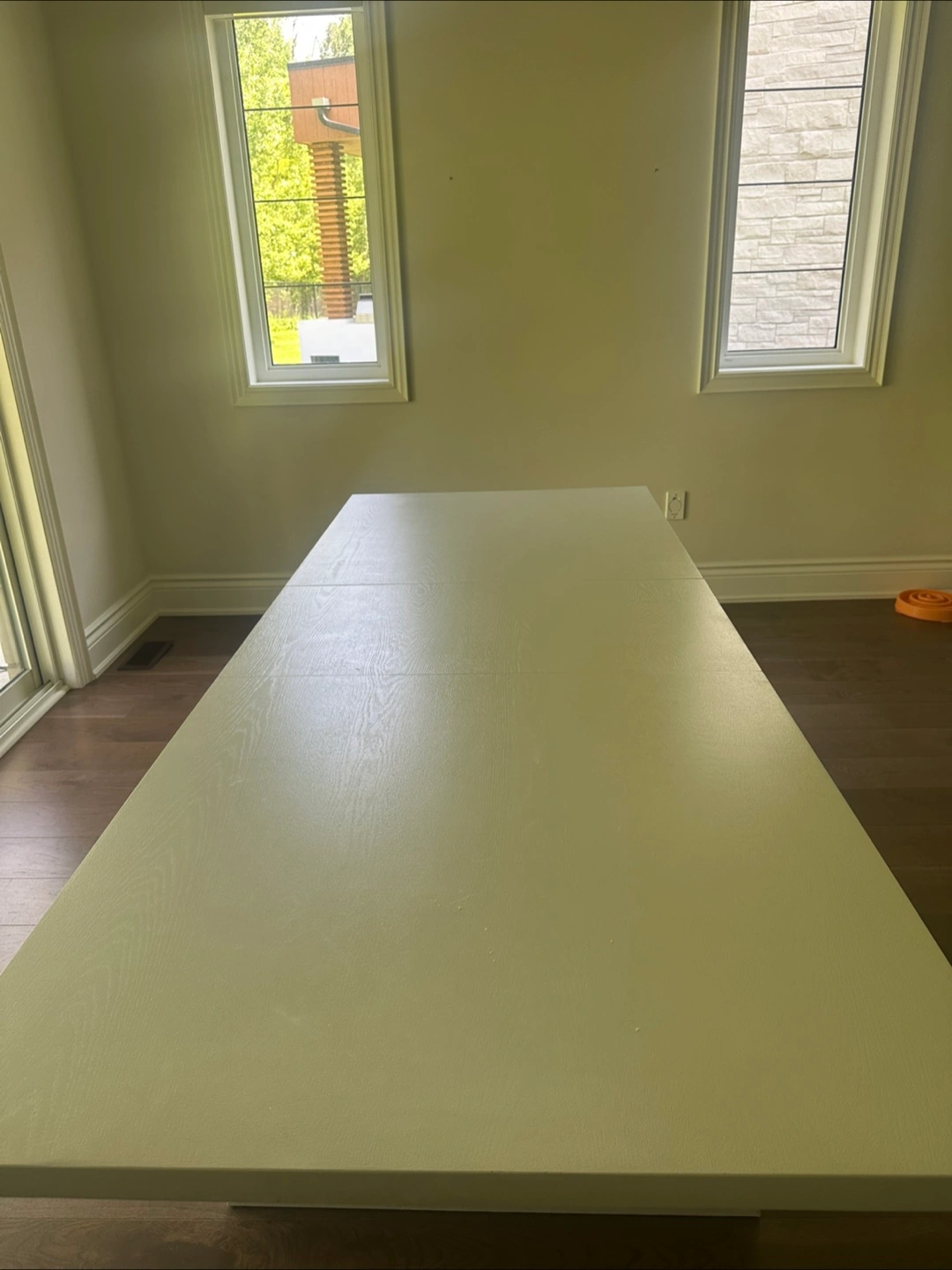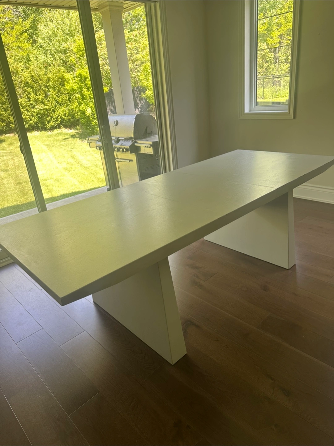 60Large white dining table. Rectangular shape. Two angled supports. Could be a great addition for hosting dinner parties.