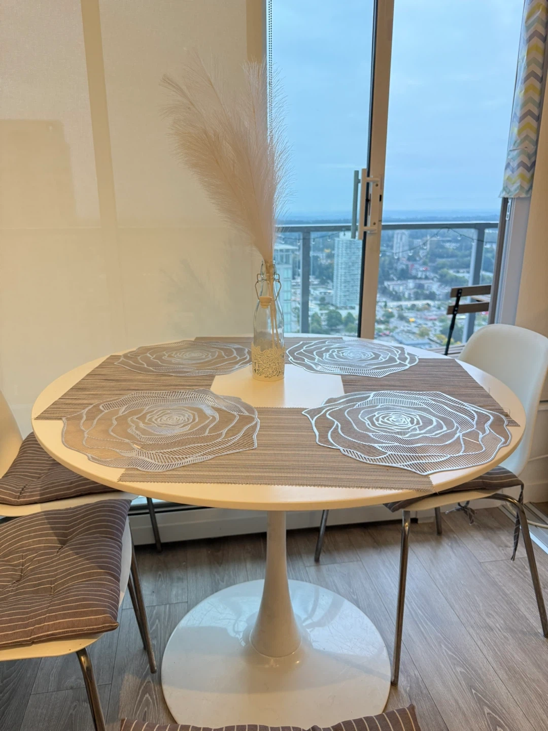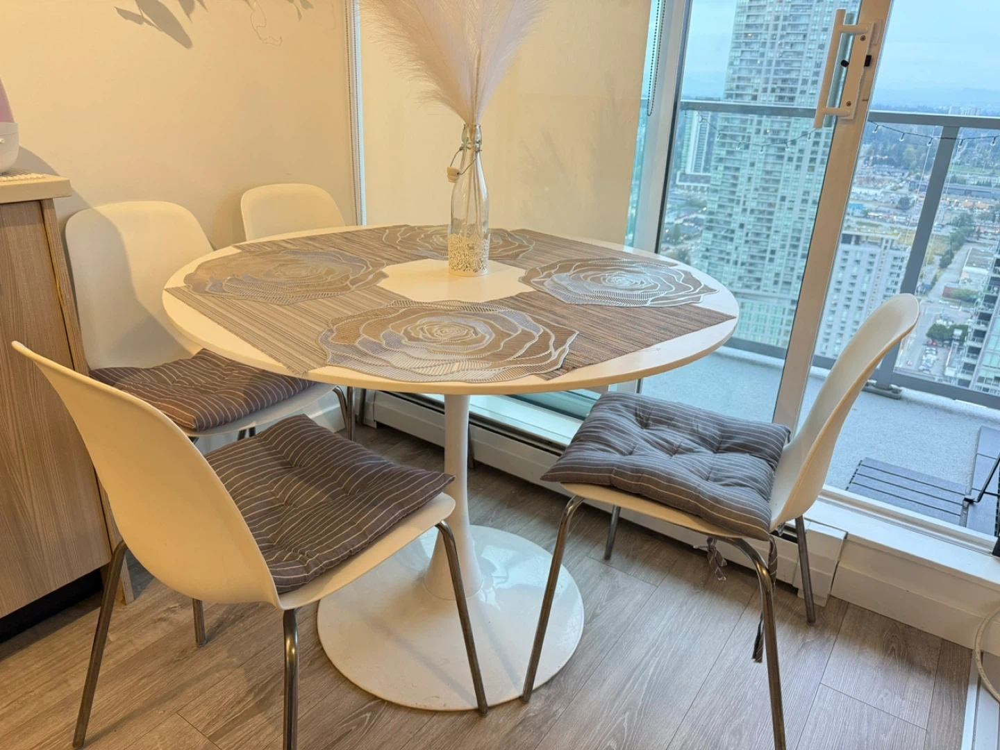 10Upgrade your dining space with this stylish and contemporary dining set โ perfect for apartments, condos, or cozy dining areas! ๐ช Includes: โข 1 round white dining table from Wayfair (sturdy pedestal base, sleek modern design) โข 4 white dining chairs from IKEA (comfortable molded seats with grey striped cushions included) โจ Condition: Excellent โ gently used, well-maintained, and from a smoke-free, pet-free home. ๐๏ธ Style: Minimalist, modern, and perfect for small spaces with a bright, clean look. ๐ Table dimensions: Approx. 40โ (102 cm) diameter