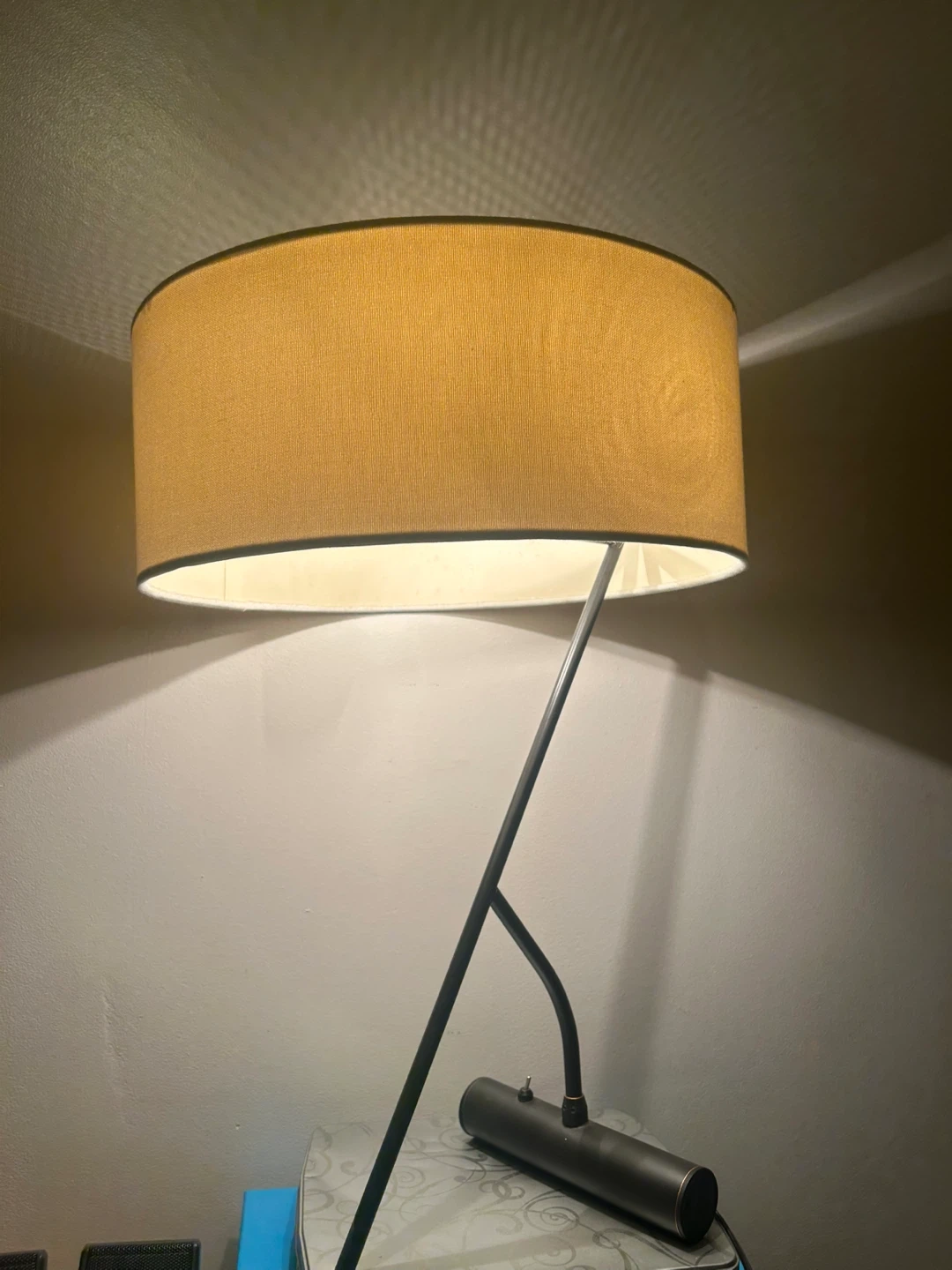 Selling a modern floor lamp in great condition. It features a sleek design and a warm, ambient light, perfect for any living space or bedroom. The lamp has a sturdy base and a stylish lampshade that complements various decor styles. It's a great addition to any home looking for a touch of elegance and functionality