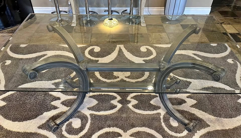 Elegant oversized glass dining table, perfect for family dinners or entertaining. Dimensions: 7 ft (L) x 3 ft 6.5 in (W) x 2 ft 4.5 in (H) Comfortably seats 6-8 people Sleek, timeless glass top design Sturdy base, built for style and durability Good condition. Perfect centerpiece for dining room For Pick-Up