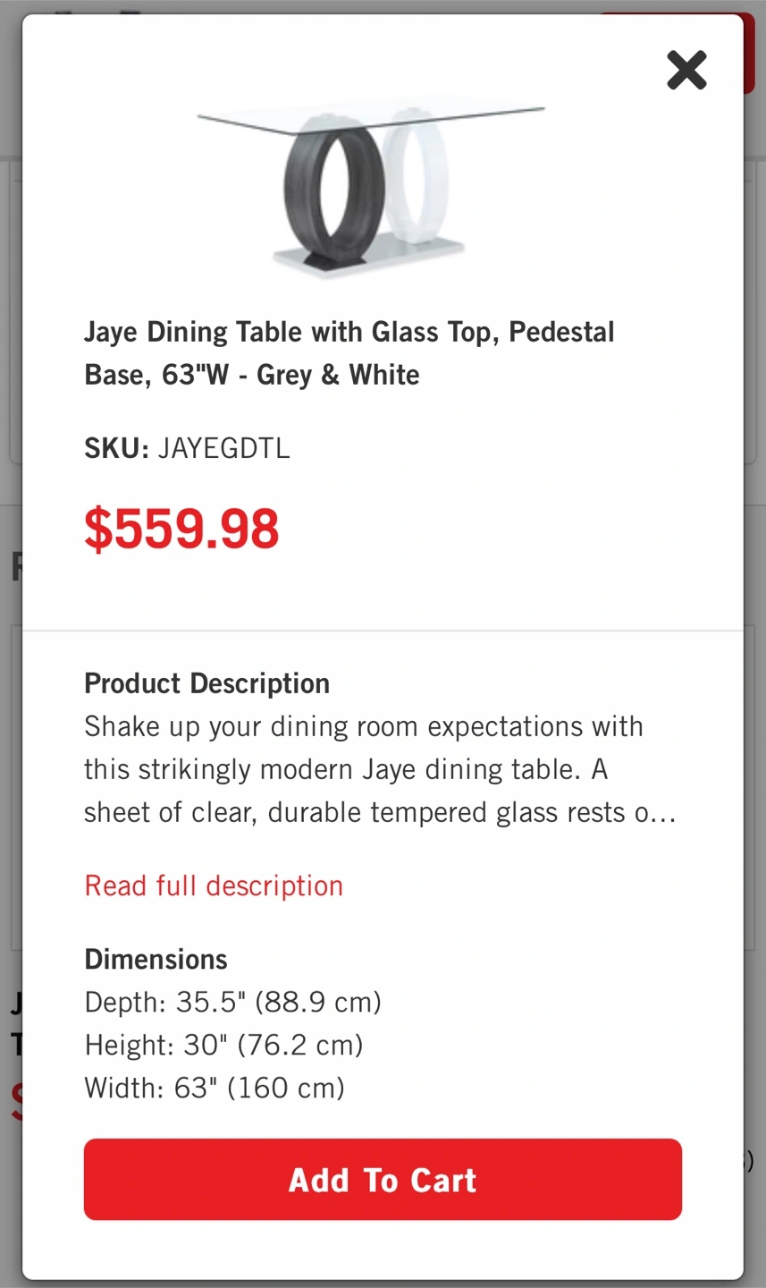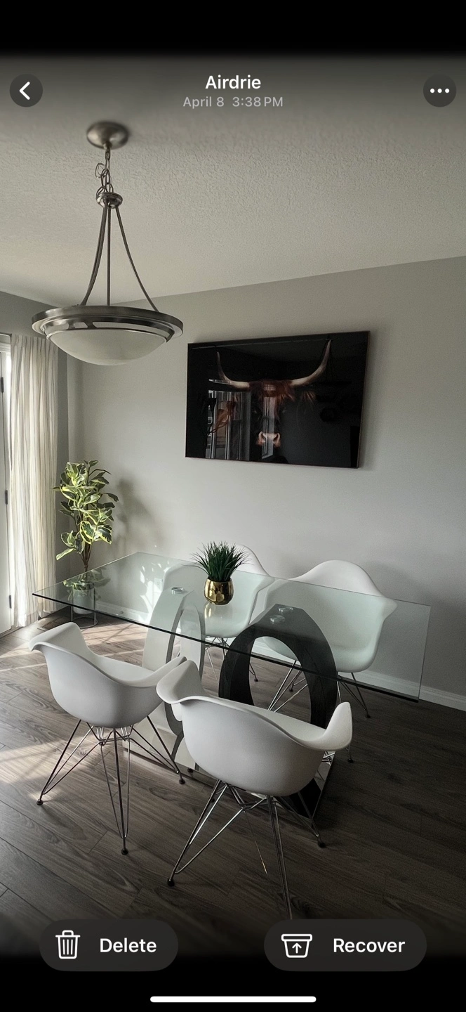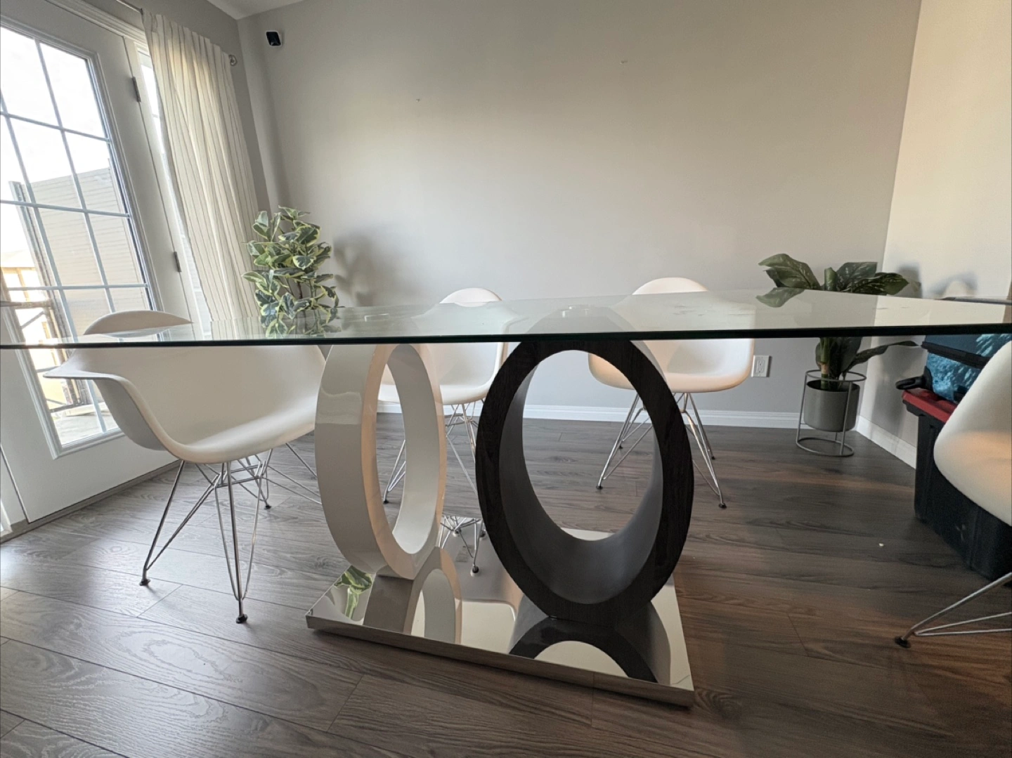 25A sleek, contemporary dining table. Features a clear glass top. A unique base design. The base seems to have two circular pillars in different finishes. Minor imperfections shown in pictures.