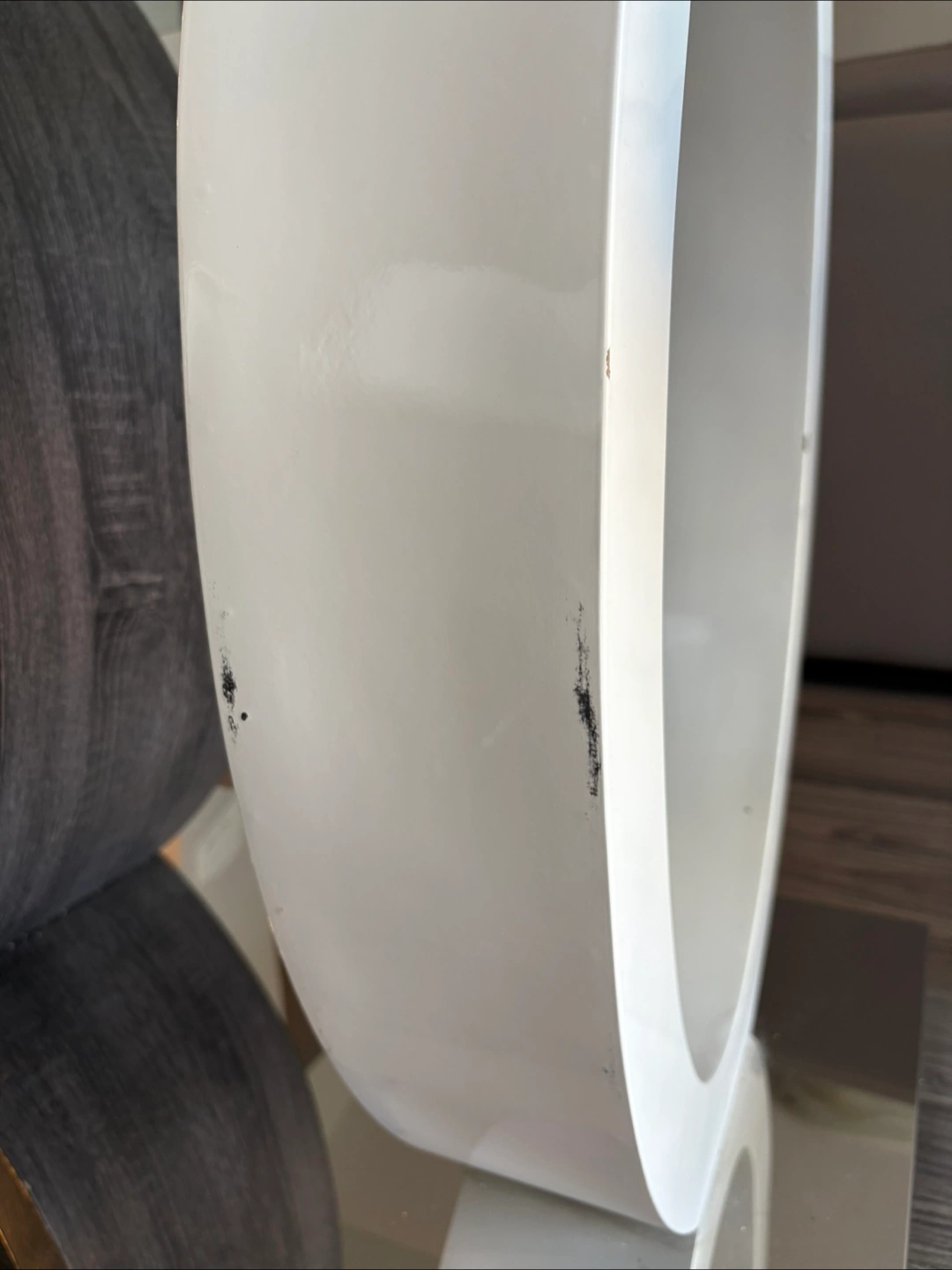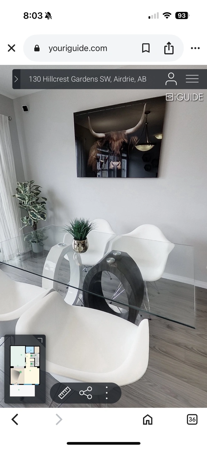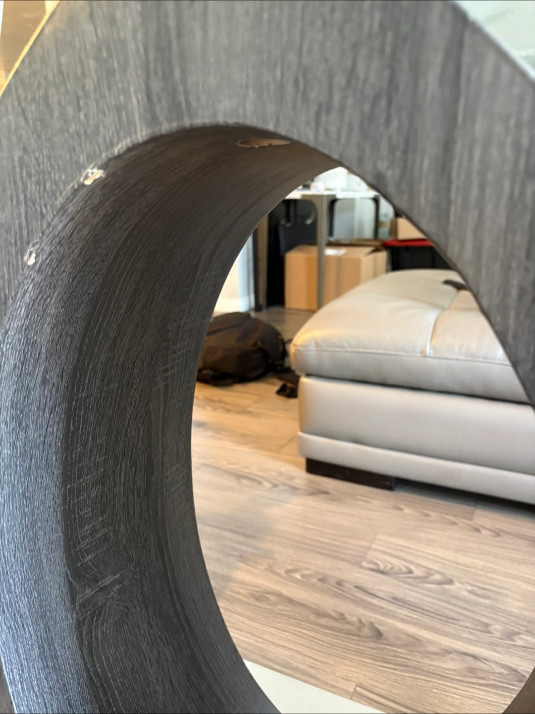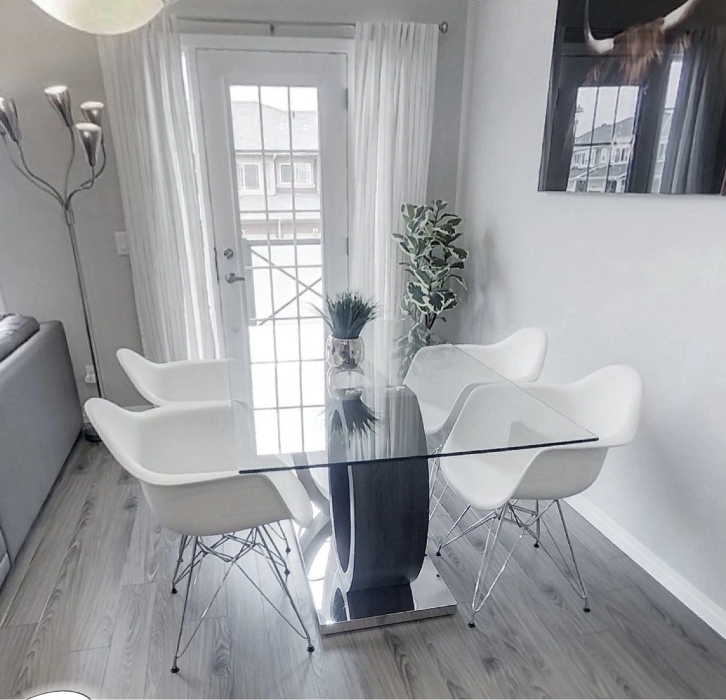 25A sleek, contemporary dining table. Features a clear glass top. A unique base design. The base seems to have two circular pillars in different finishes. Minor imperfections shown in pictures.