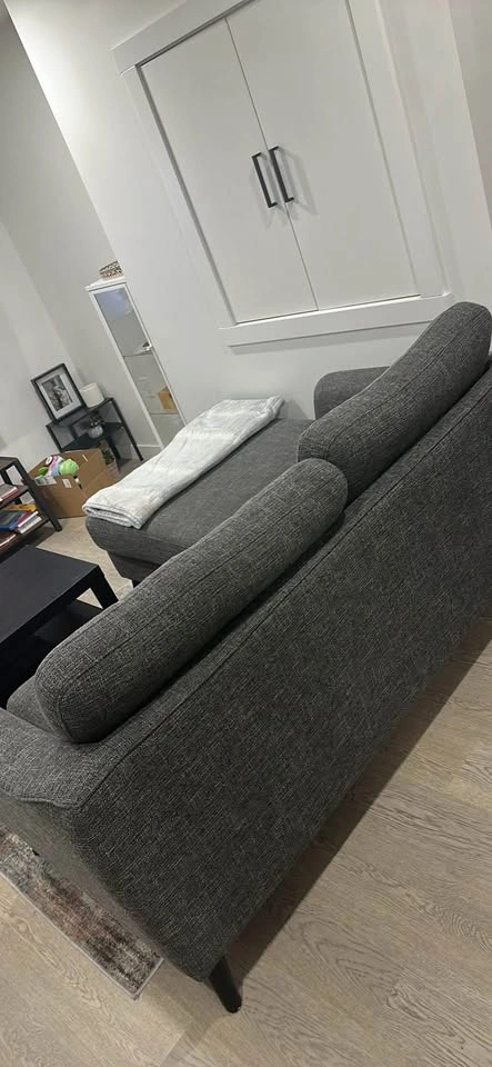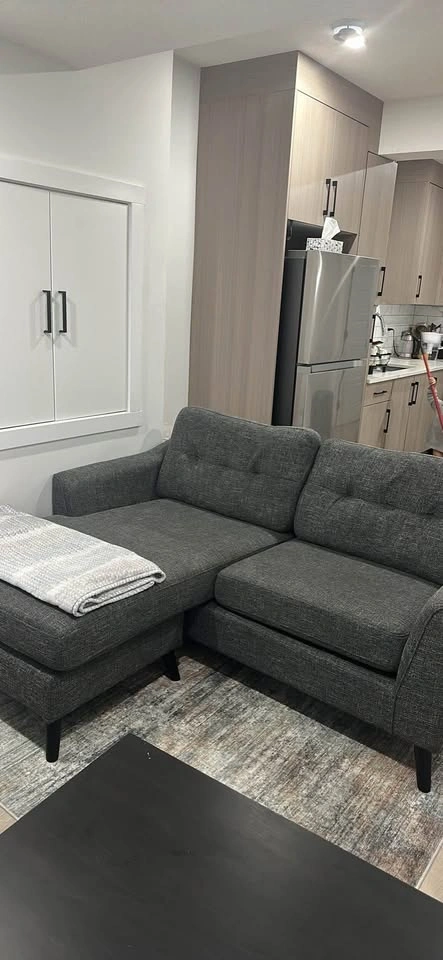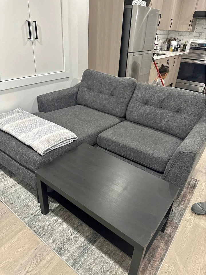10Selling my grey sectional sofa and matching black coffee table, both in like-new condition β bought just 3 months ago. Iβm moving soon, so selling everything together at a great price! Details: β’ Modern 2-piece grey sectional sofa with chaise β’ Used only for 3 months β looks and feels like new β’ Soft fabric with firm, comfortable cushions β’ Smoke-free, pet-free home β’ Solid black coffee table with lower shelf for storage β’ No stains, tears, or damage Everything is in excellent condition and ready to use. Perfect for apartments, condos, or basement suites.