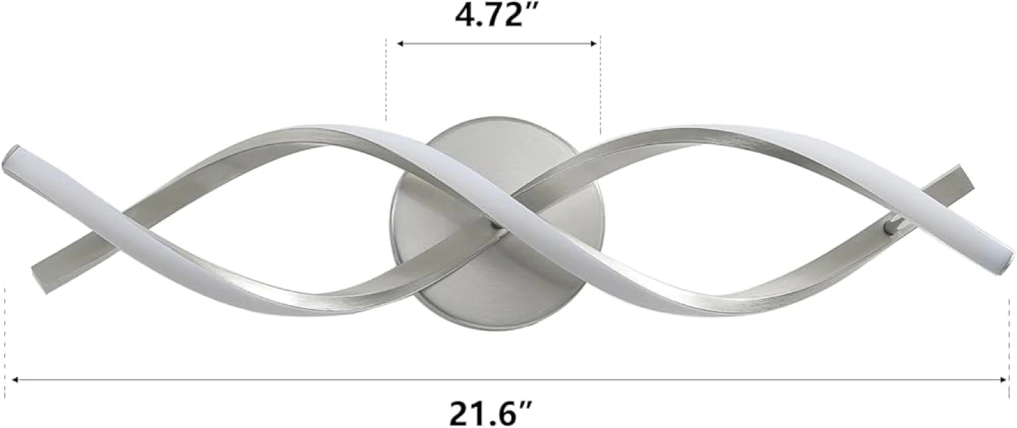227Add a touch of modern elegance to your bathroom with this stylish LED vanity light! The light features a unique twisted design with a sleek silver finish. It measures 21.6 inches in length and 4.72 inches in width. Perfect for adding bright and efficient lighting above your vanity mirror