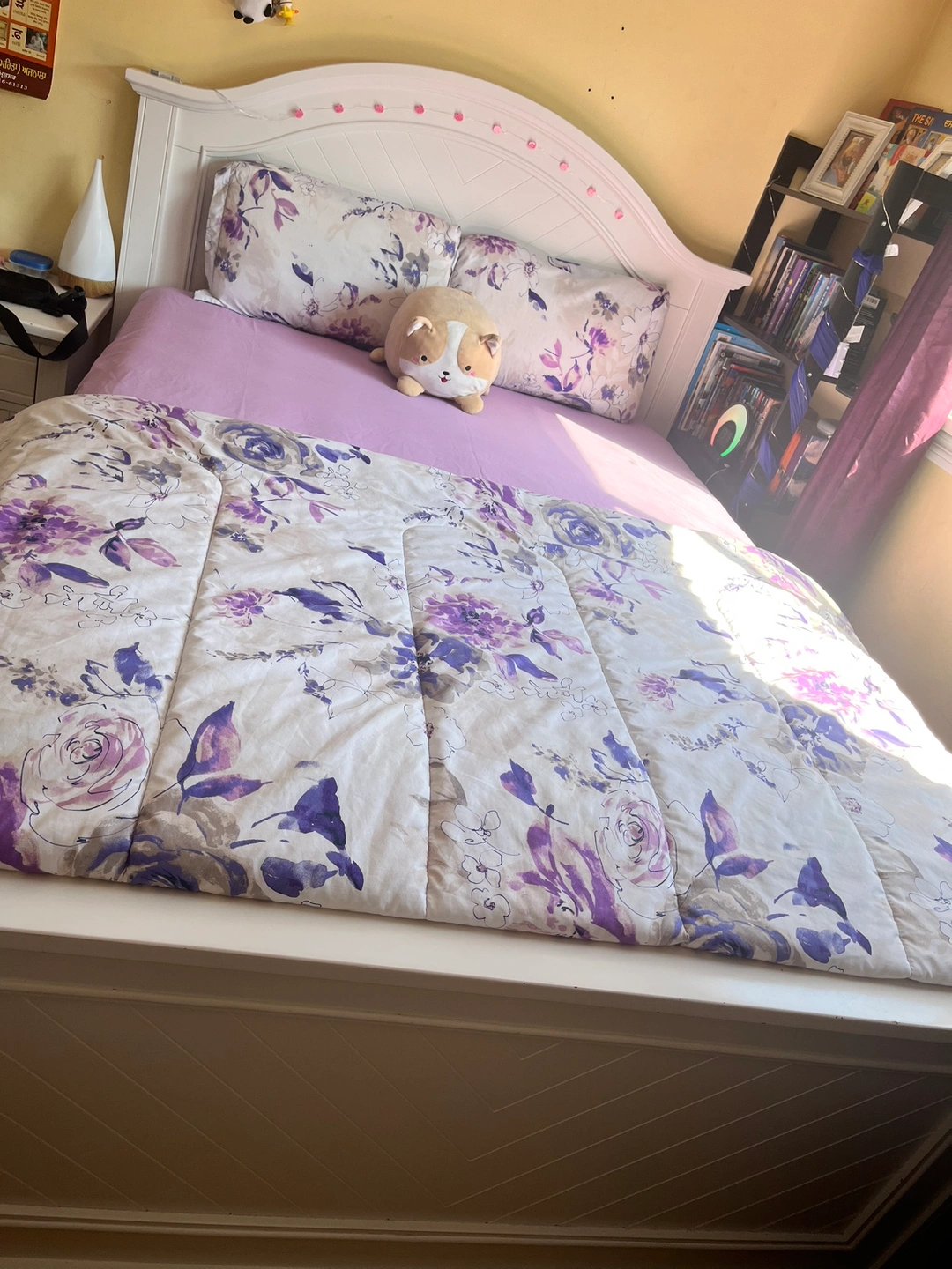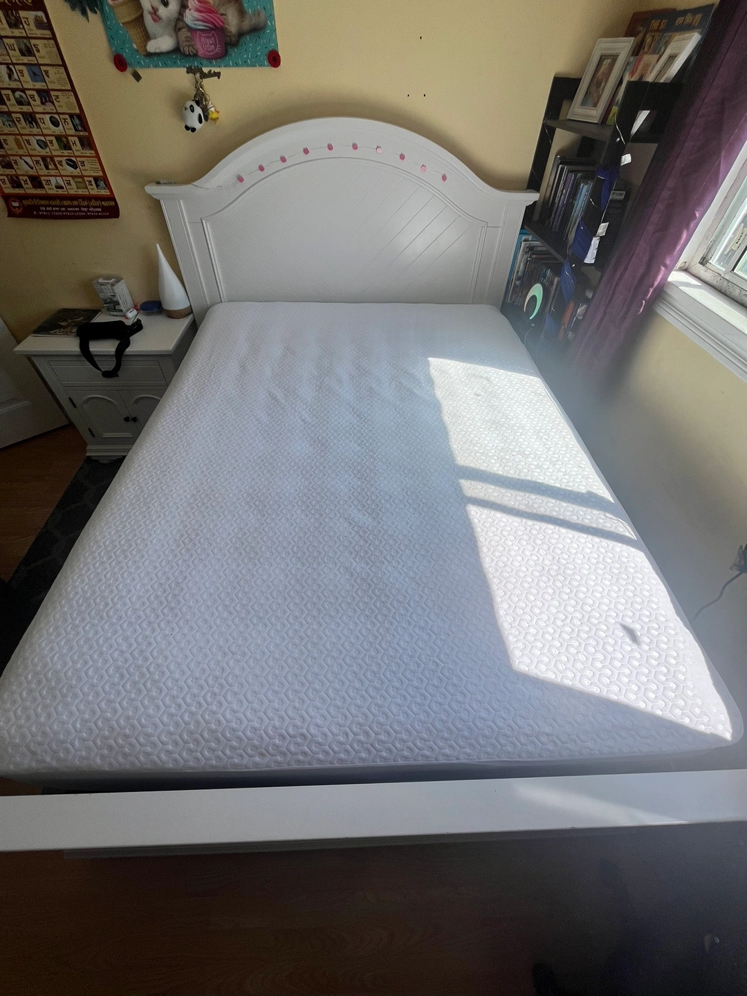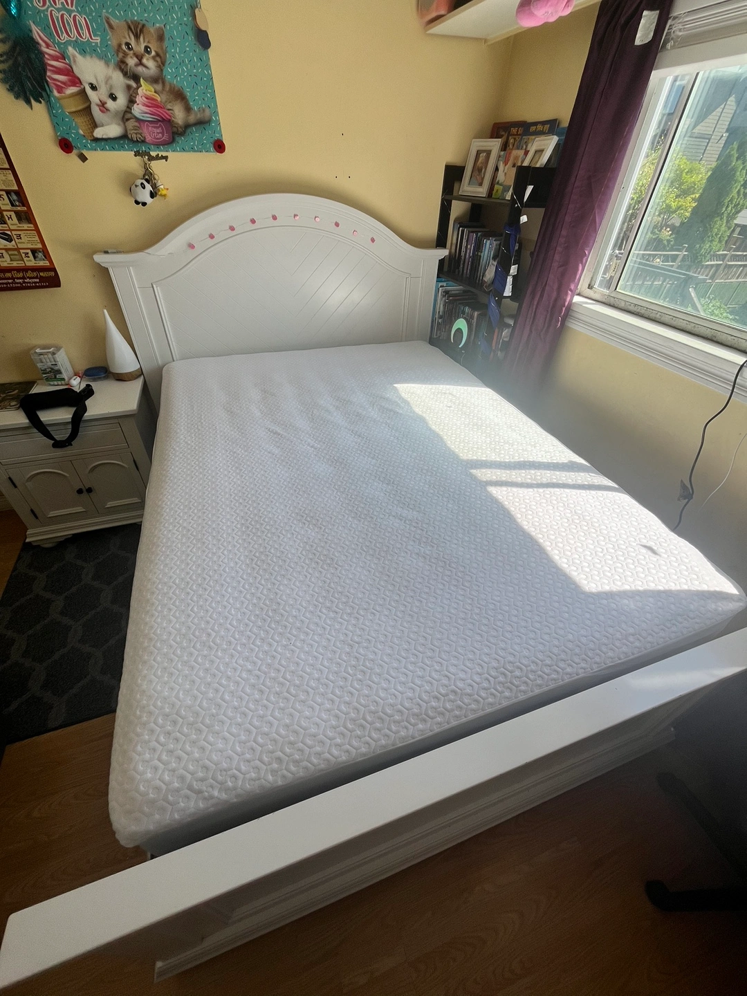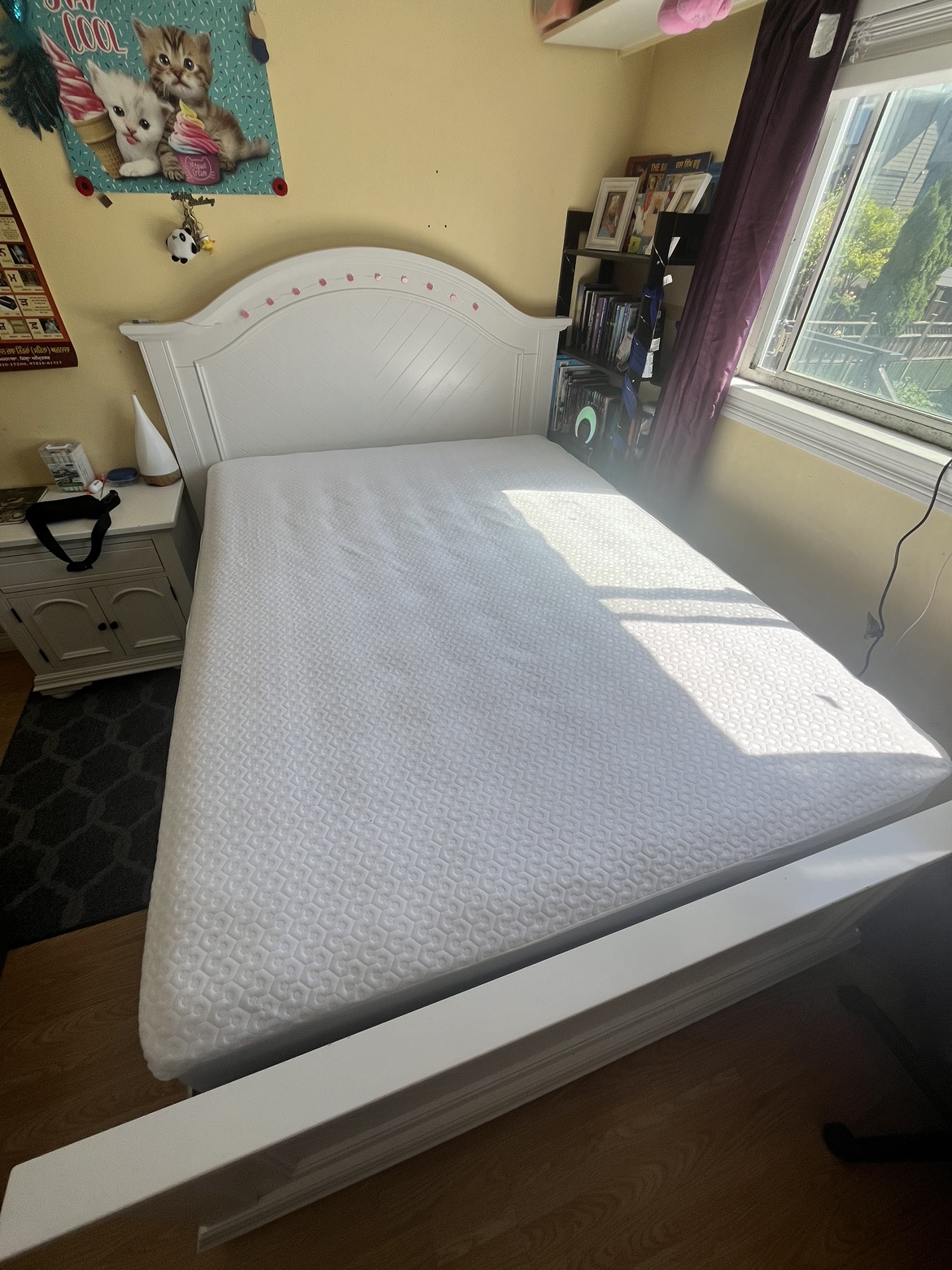 10This bed frame features a white finish and a headboard with a curved design. It is a queen size frame and includes a headboard and footboard. I am selling due to it being too big to fit or move around in my room. - Pink LED lights and Matteress not included