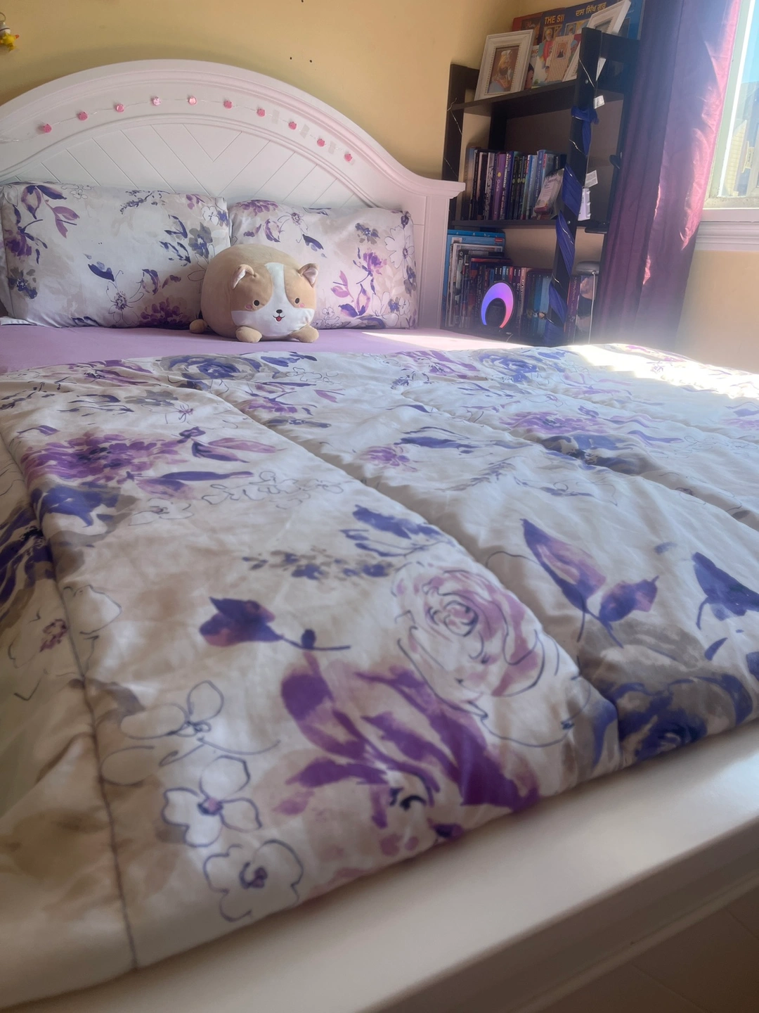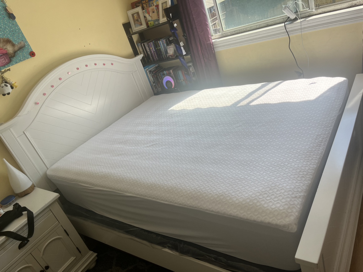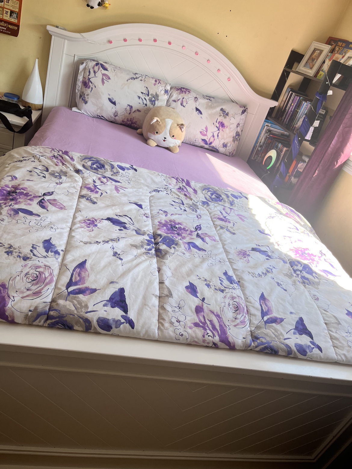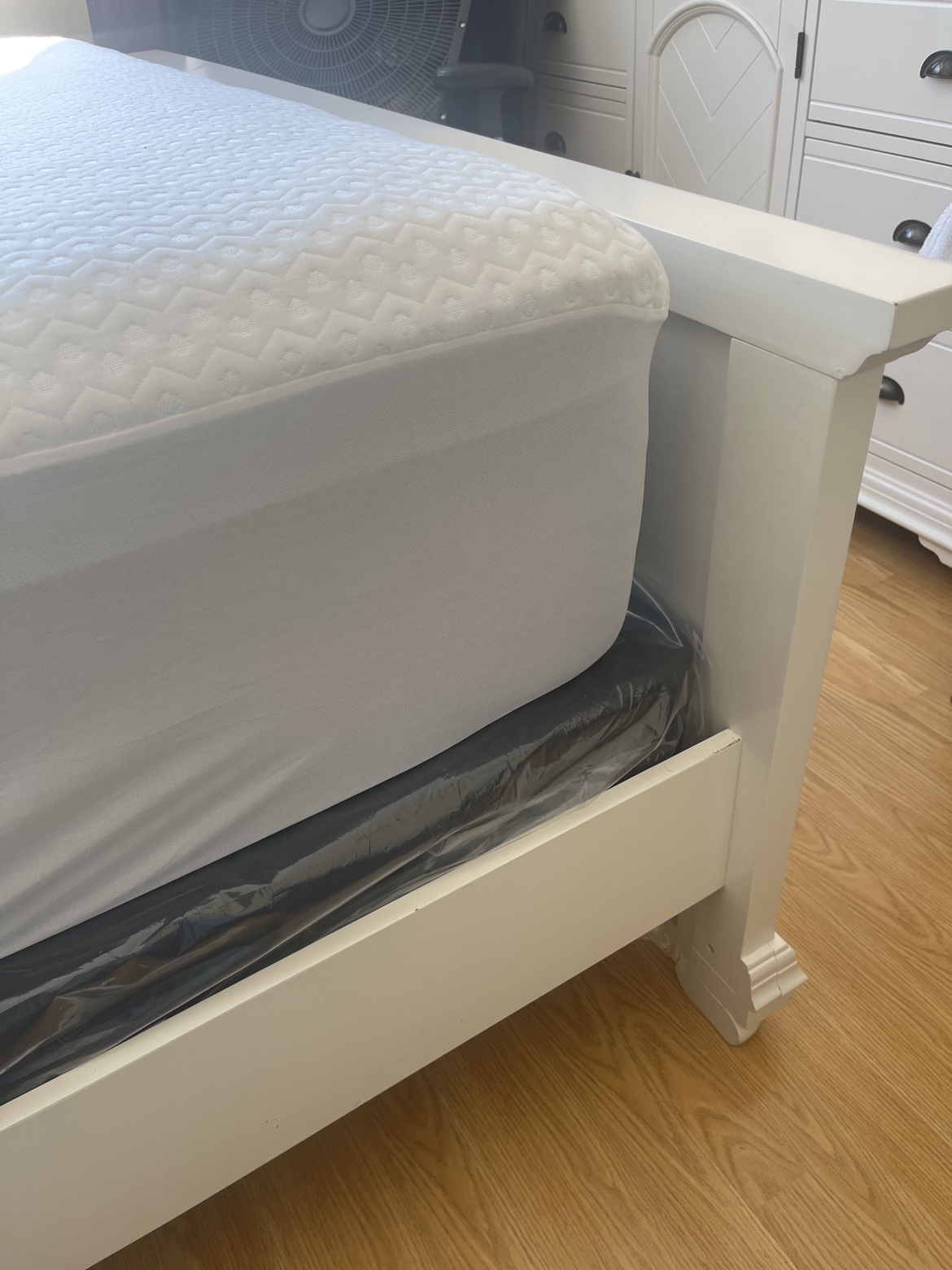 10This bed frame features a white finish and a headboard with a curved design. It is a queen size frame and includes a headboard and footboard. I am selling due to it being too big to fit or move around in my room. - Pink LED lights and Matteress not included