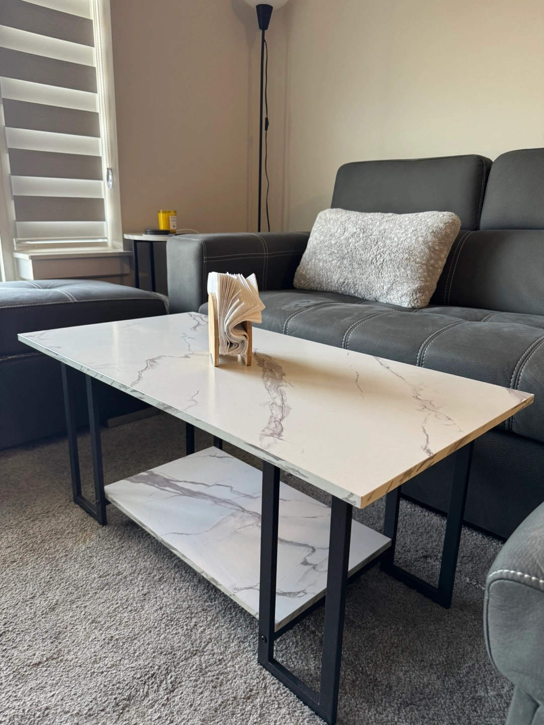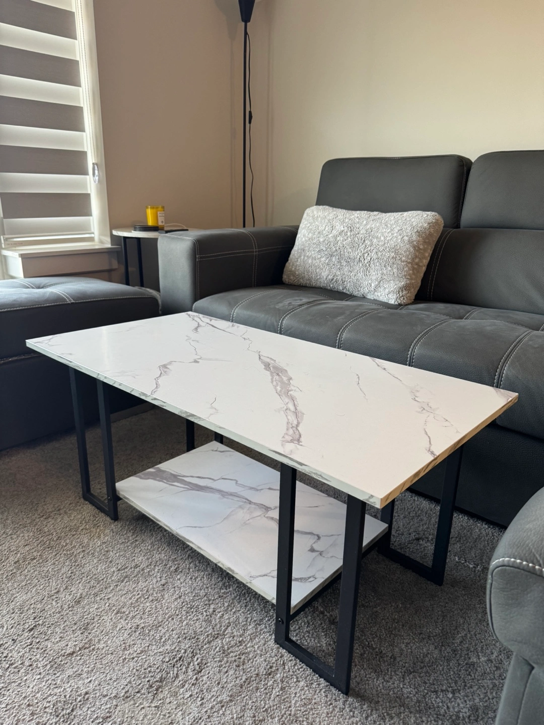 Stylish coffee table. Features a marble-look top and a lower shelf. Black metal frame. Great for living room. Also have the matching end-table if interested. (Sold separately) Pickup only from Oakville