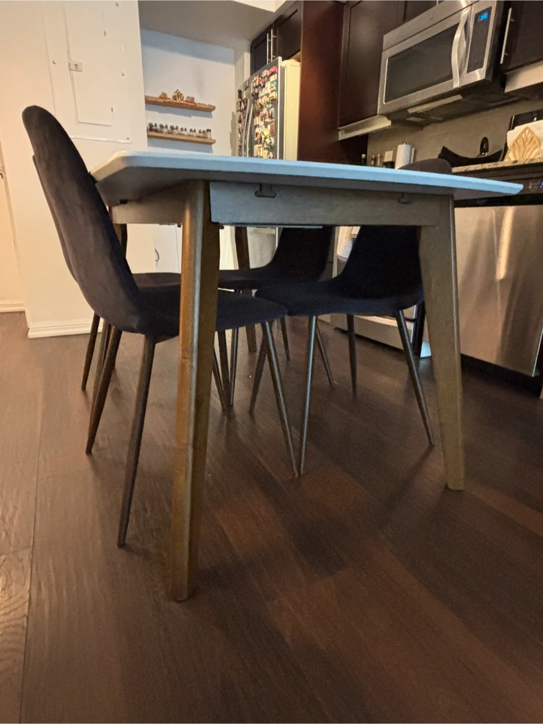 10Selling a modern dining table with chairs. The table has a white top and wooden legs (extendable). Very solid. The chairs are dark blue upholstery. The set is in great condition. Available in November.
