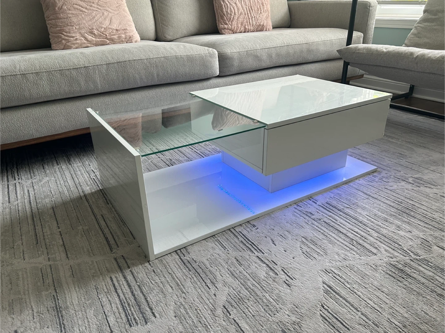 Looking to brighten up your living room? This modern coffee table features a sleek white finish and cool LED lighting. The glass top and unique design will definitely add a touch of style to your space. Perfect for entertaining or just relaxing at home!
