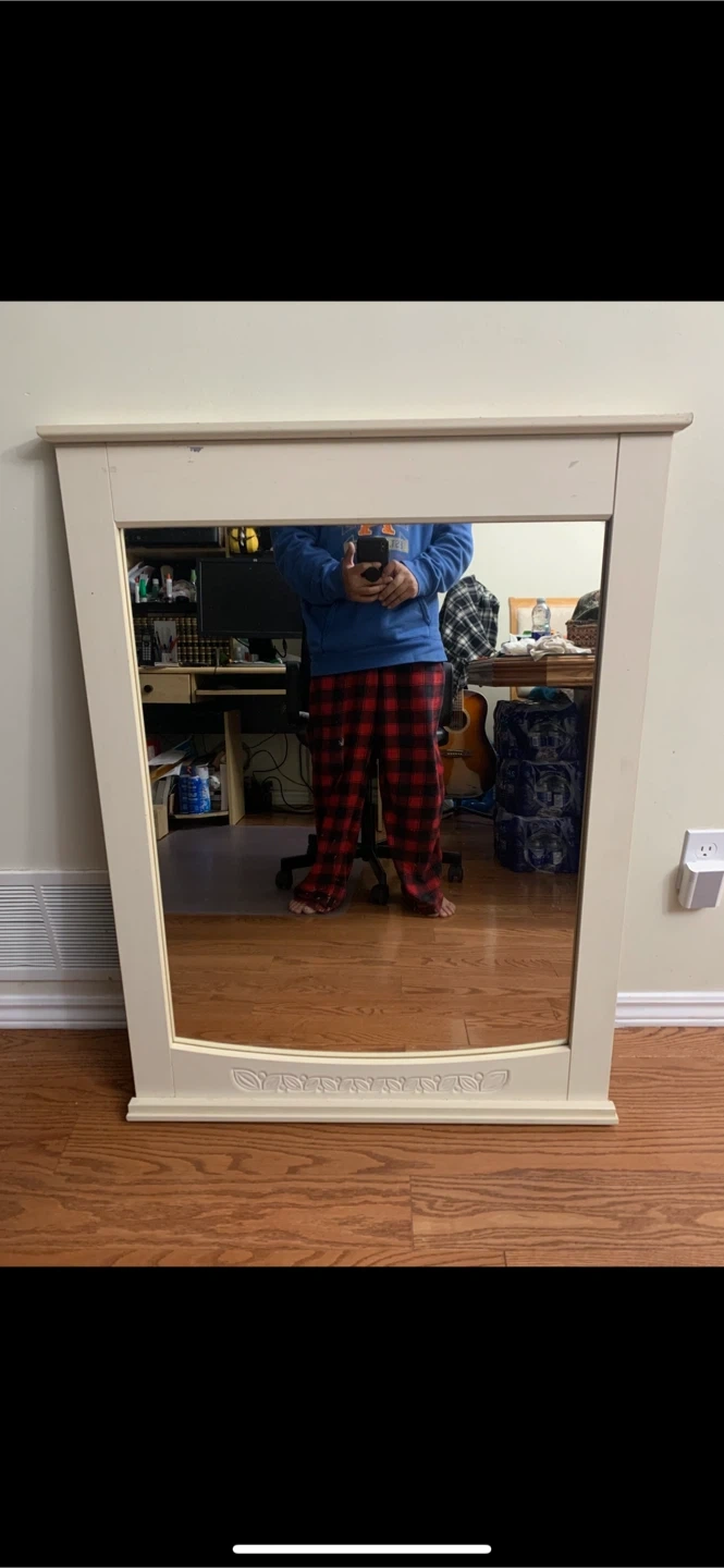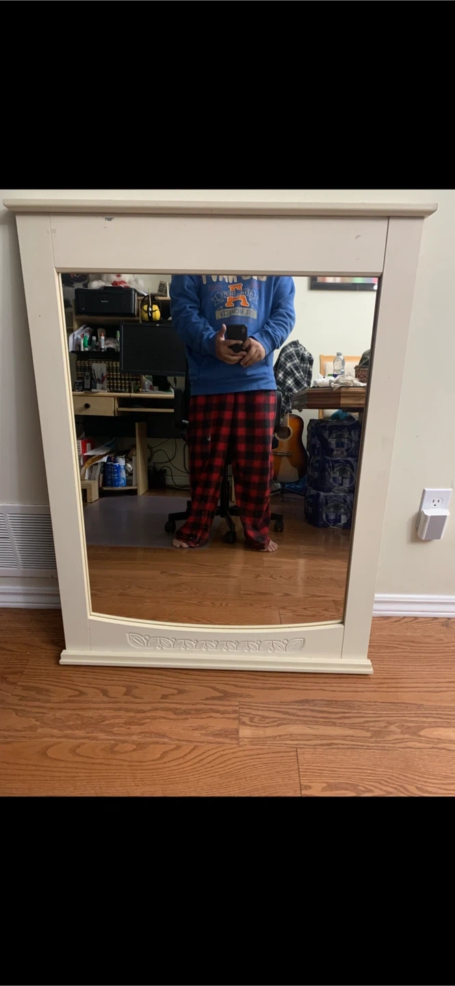 Modern White Mirror This mirror featuring high quality wood can be used for a long time. Can be hanged up on the wall or used as a floor mirror. Through the aesthetics and designs of this modern mirror your room will look more beautiful and will look more inviting and spacious. What's more, with its wall mounted design, it is space-saving and will fit in any rooms and will make it look better Features - Made of high quality materials, sturdy and durable -Will make any room look better -Very stylish -Mirror a must for getting ready to go out, work, school, party, etc. - Can fit any room or hallway, bathroom, Living room, kitchen, basement bedrooms, etc. or entryway Add elegance to any room with the stylish look of a White Classic Mirror. This white designer mirror has a simple frame and beautifully complements any décor. This chic mirror features a painted White finish. Can be picked up or delivered Cheap - message me