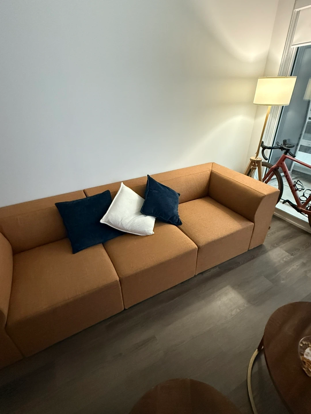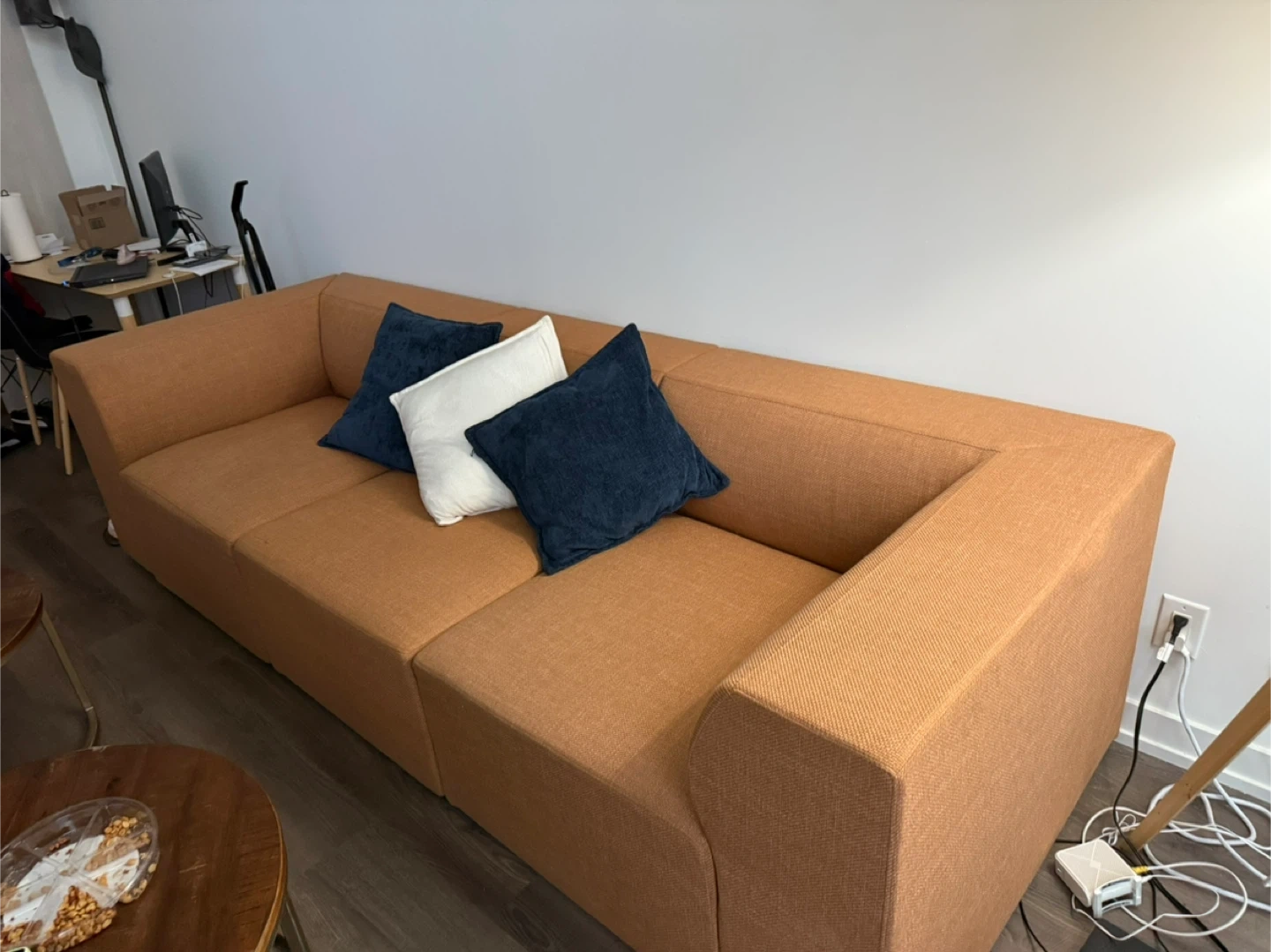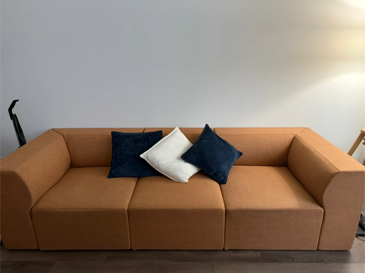 42Cozey 3-Seater Modular Sofa – Burnt Orange Beautiful and super comfortable Cozey modular sofa in excellent condition. The burnt orange fabric gives a warm, modern look that fits perfectly in any living room. The sofa has deep, supportive seats and a clean, boxy design that feels both stylish and cozy. Originally from Cozey, it’s easy to assemble and move thanks to its modular structure (each section clicks together securely). Condition: Excellent – no stains, rips, or damage Includes: 2 navy-blue velvet pillows + 1 white pillow Dimensions: • Width: 281 cm (110.6”) • Depth: 103 cm (40.6”) • Height: 72 cm (28.3”) • Seat height: 44.5 cm (17.5”) • Seat depth: 55 cm (21.7”) Pickup only (no delivery)