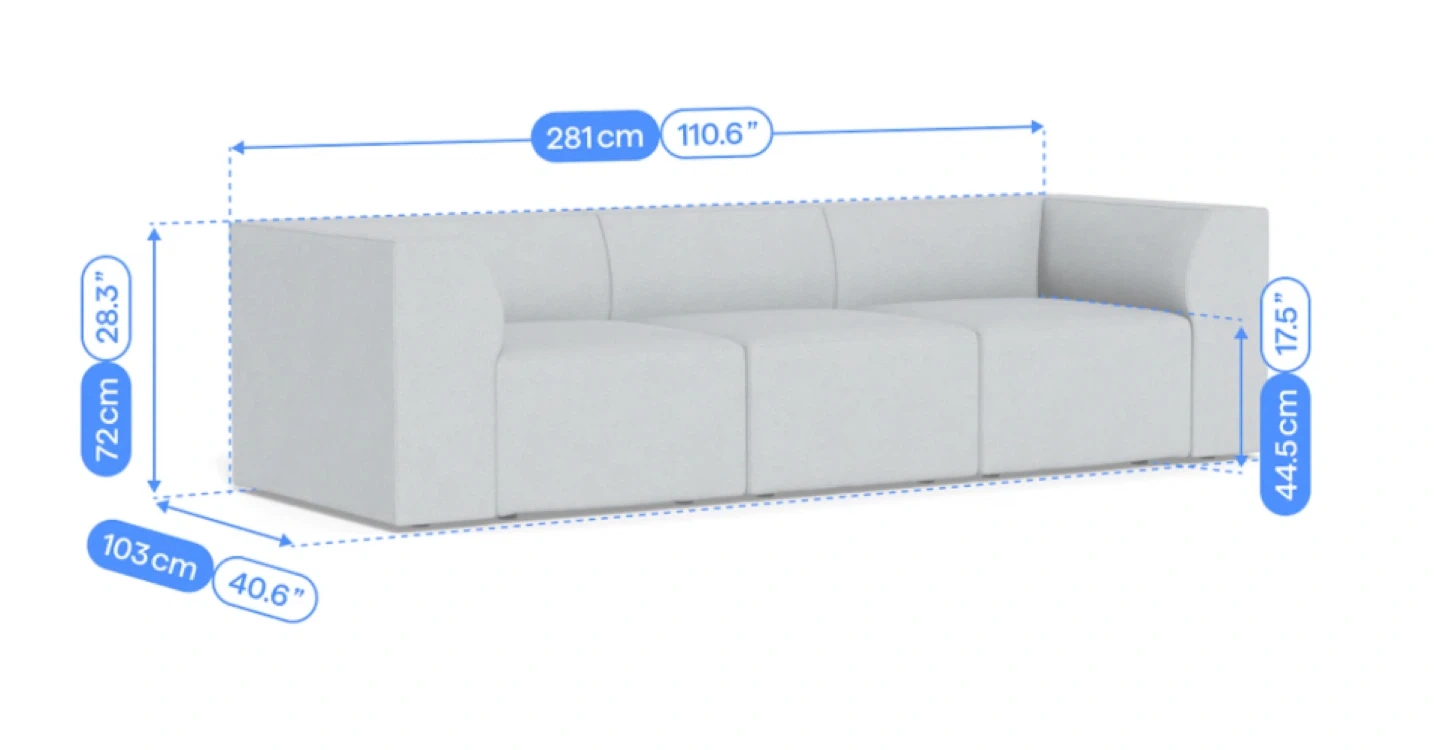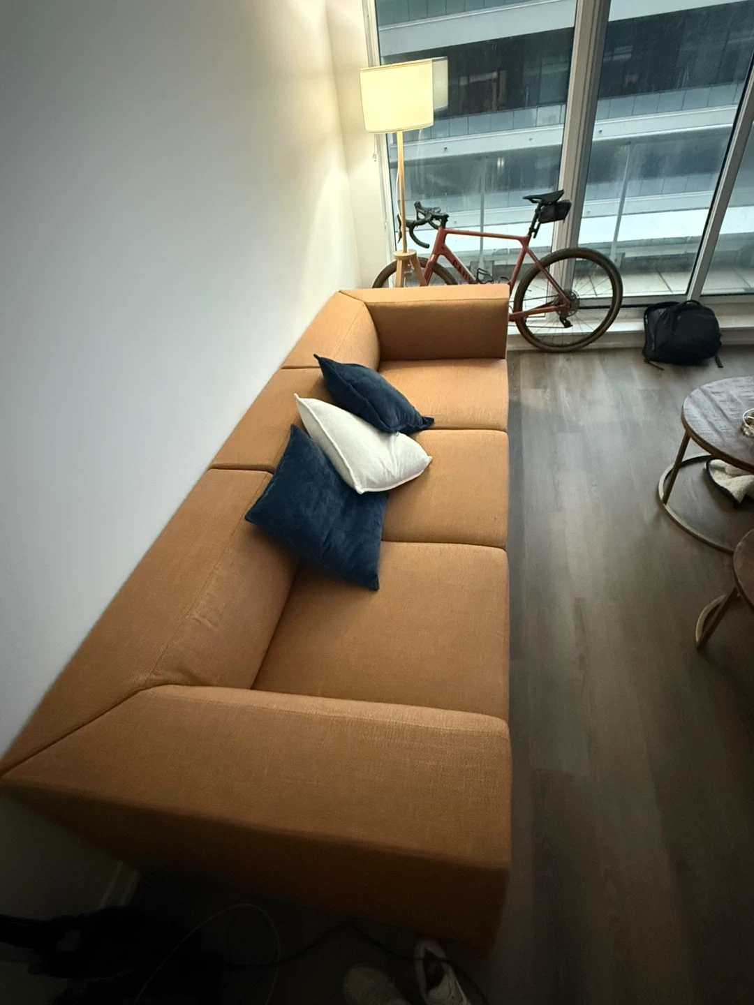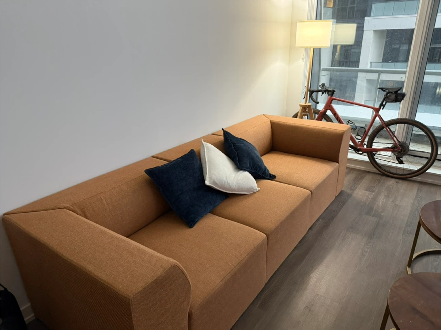 42Cozey 3-Seater Modular Sofa – Burnt Orange Beautiful and super comfortable Cozey modular sofa in excellent condition. The burnt orange fabric gives a warm, modern look that fits perfectly in any living room. The sofa has deep, supportive seats and a clean, boxy design that feels both stylish and cozy. Originally from Cozey, it’s easy to assemble and move thanks to its modular structure (each section clicks together securely). Condition: Excellent – no stains, rips, or damage Includes: 2 navy-blue velvet pillows + 1 white pillow Dimensions: • Width: 281 cm (110.6”) • Depth: 103 cm (40.6”) • Height: 72 cm (28.3”) • Seat height: 44.5 cm (17.5”) • Seat depth: 55 cm (21.7”) Pickup only (no delivery)