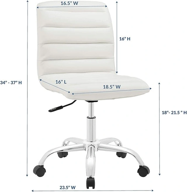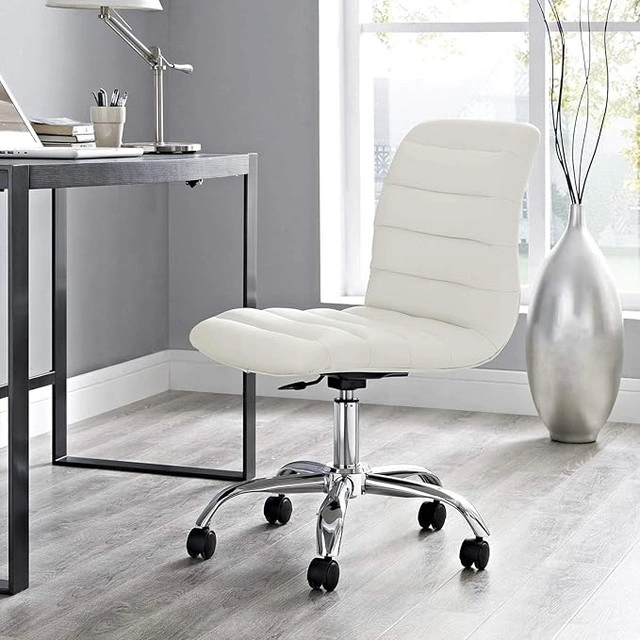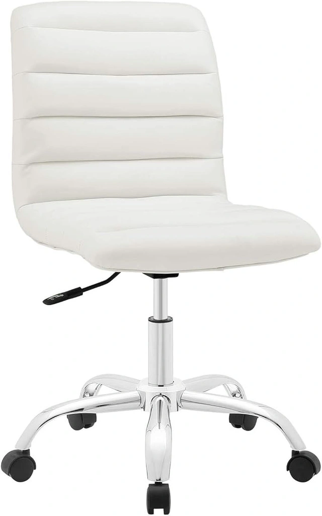 Bring contemporary flair and comfort to your workspace with the Modway Ripple Mid Back Office Chair in White. Its armless design, finely upholstered vinyl padding, and sleek chrome base offer a clean, modern aesthetic perfect for any home office or conference room. Enjoy effortless mobility with smooth-rolling casters and customize your comfort with a 360-degree swivel and one-touch height adjustment. The Ripple chair is ideal for those who value both form and function. It's a stylish, compact solution for workstations, providing a touch of sophistication without taking up too much space. Cash accepted.