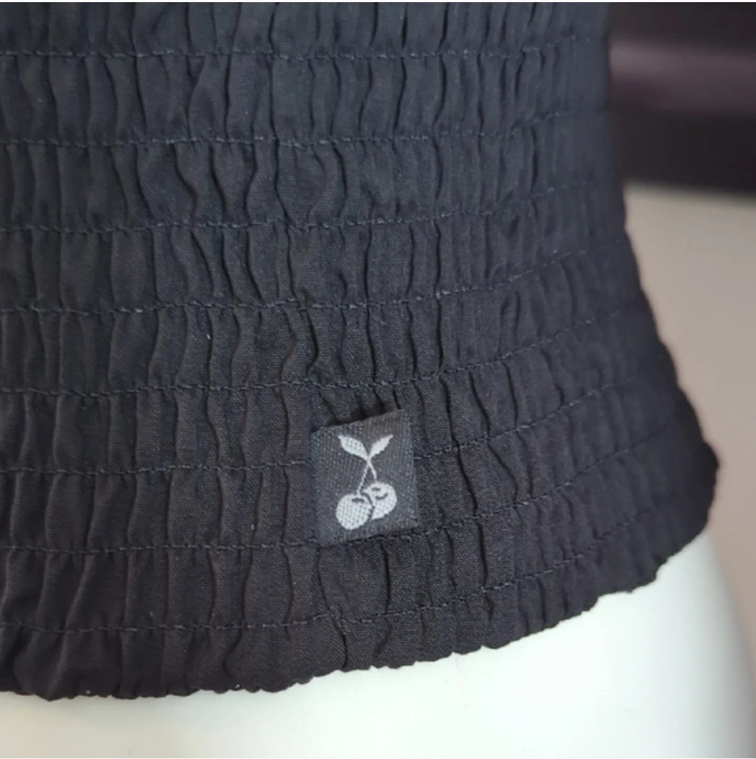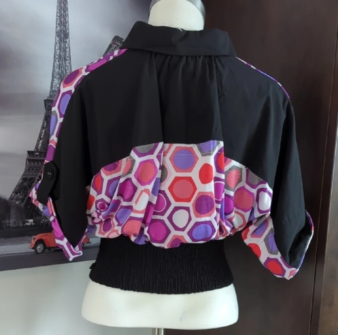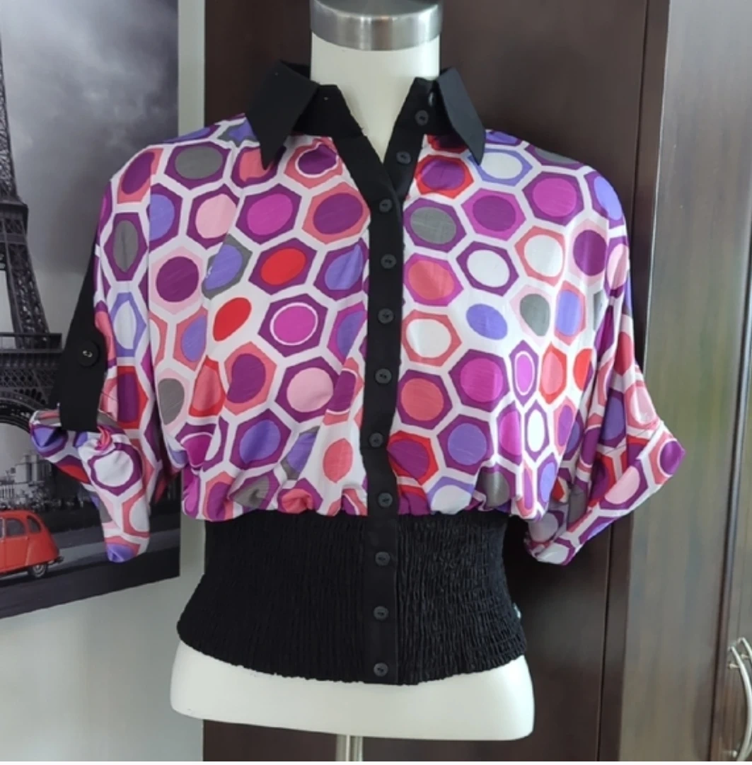 This Foxy Jeans blouse features a vibrant geometric print with a shirred black waistband and collar. It has cuffed short sleeves with button accents. Made from a lightweight fabric.