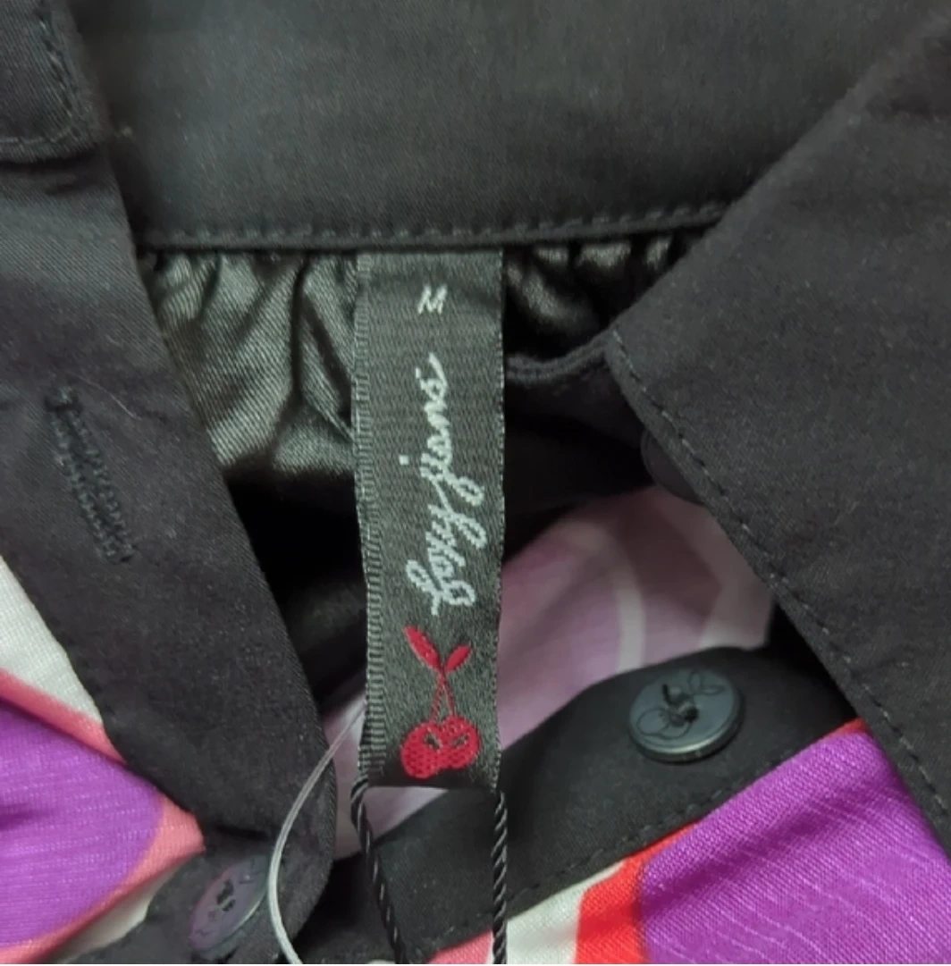 This Foxy Jeans blouse features a vibrant geometric print with a shirred black waistband and collar. It has cuffed short sleeves with button accents. Made from a lightweight fabric.