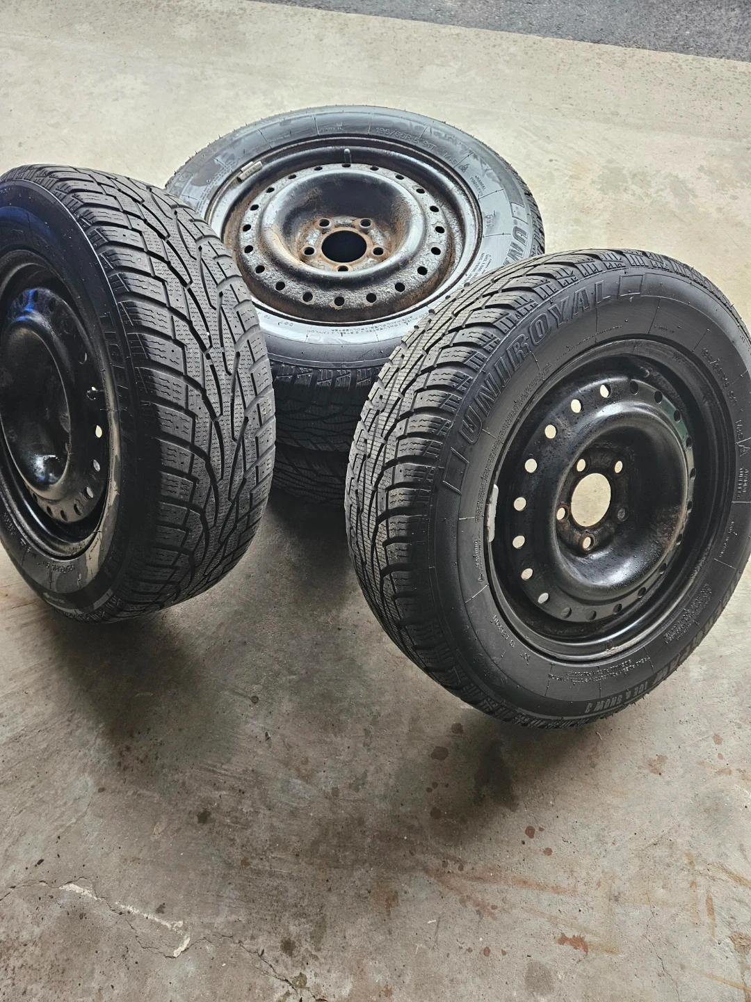 Four Uniroyal Tiger Paw snow tires mounted on steel rims. These tires are sized 195 65 15. They're a great option for Canadian winters! These tires should fit many vehicles with a 5x114.3mm bolt pattern.