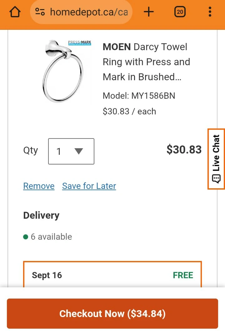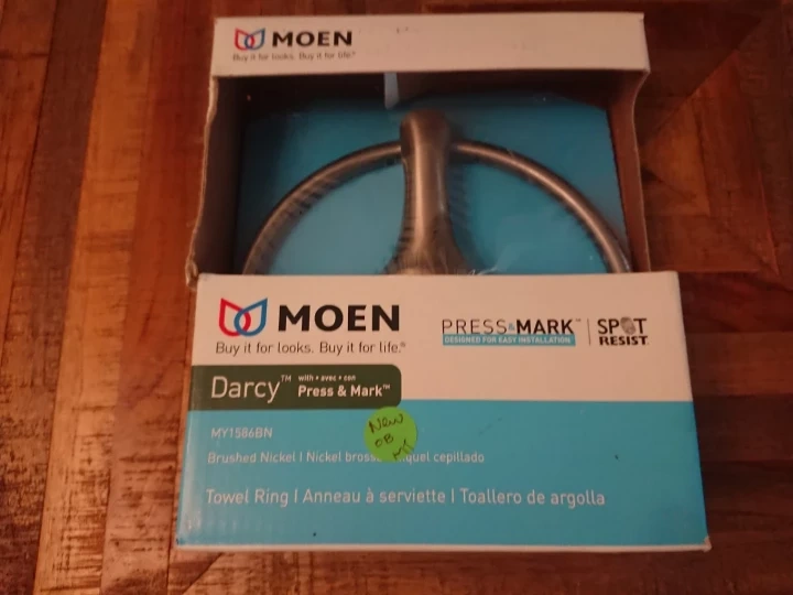 Selling a brand new Moen Darcy towel ring in brushed nickel! Model number is MY1586BN. Comes in the original box. $30.83+tax at the Home Depot.
