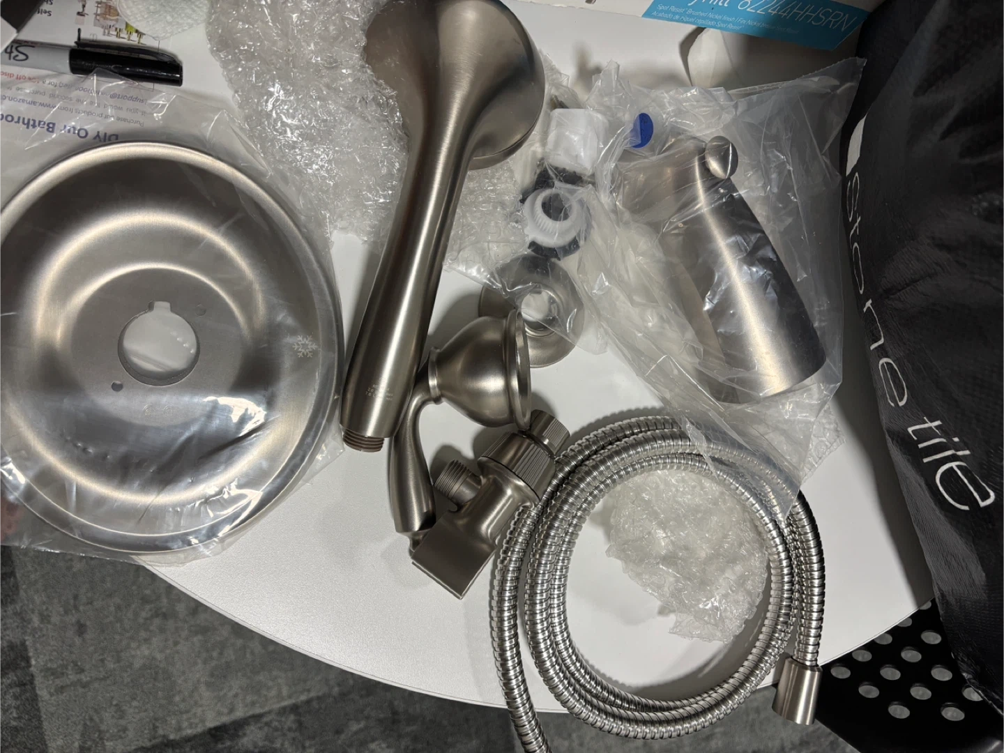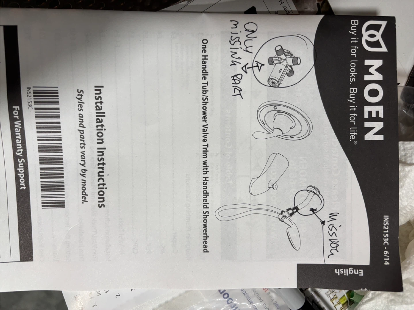 Selling parts of this Moen One Handle Tub/Shower Valve Trim with Handheld Showerhead. Please note that teo parts are missing, as indicated in the photos. Otherwise, it's in good condition and ready Only parts pictured available
