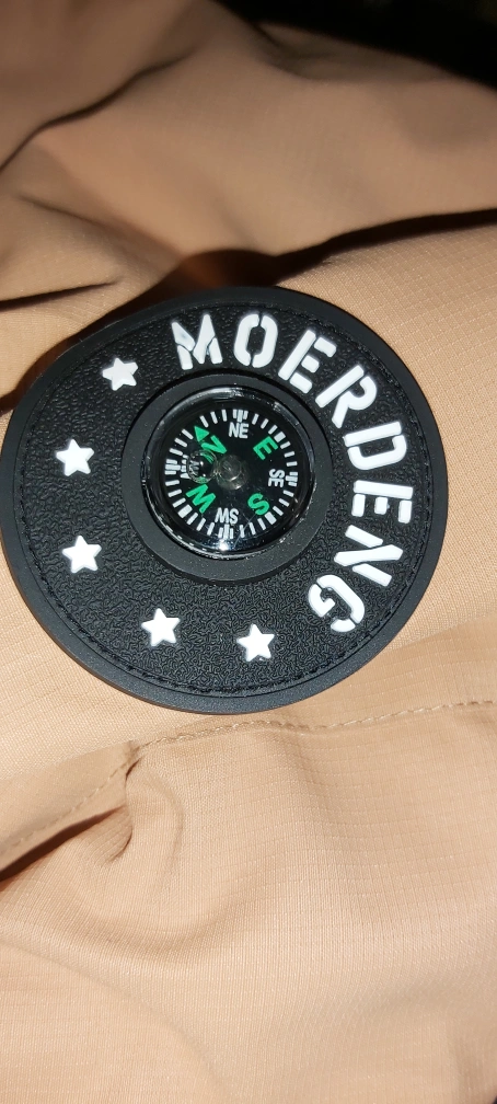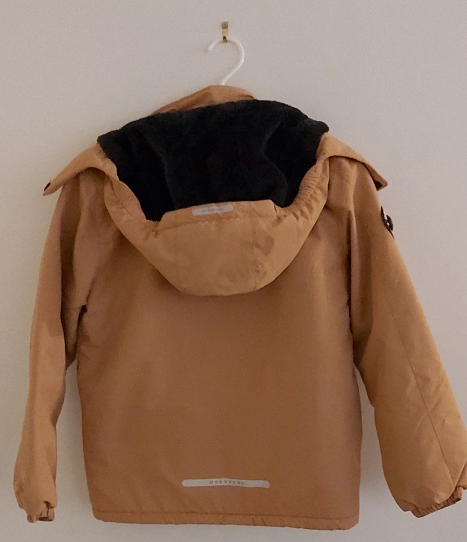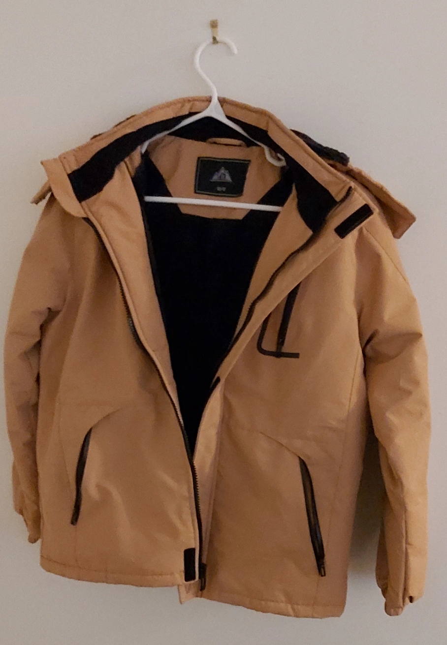 Tan winter jacket with a fleece lining and hood. Has zipper closure and multiple pockets. Features a compass