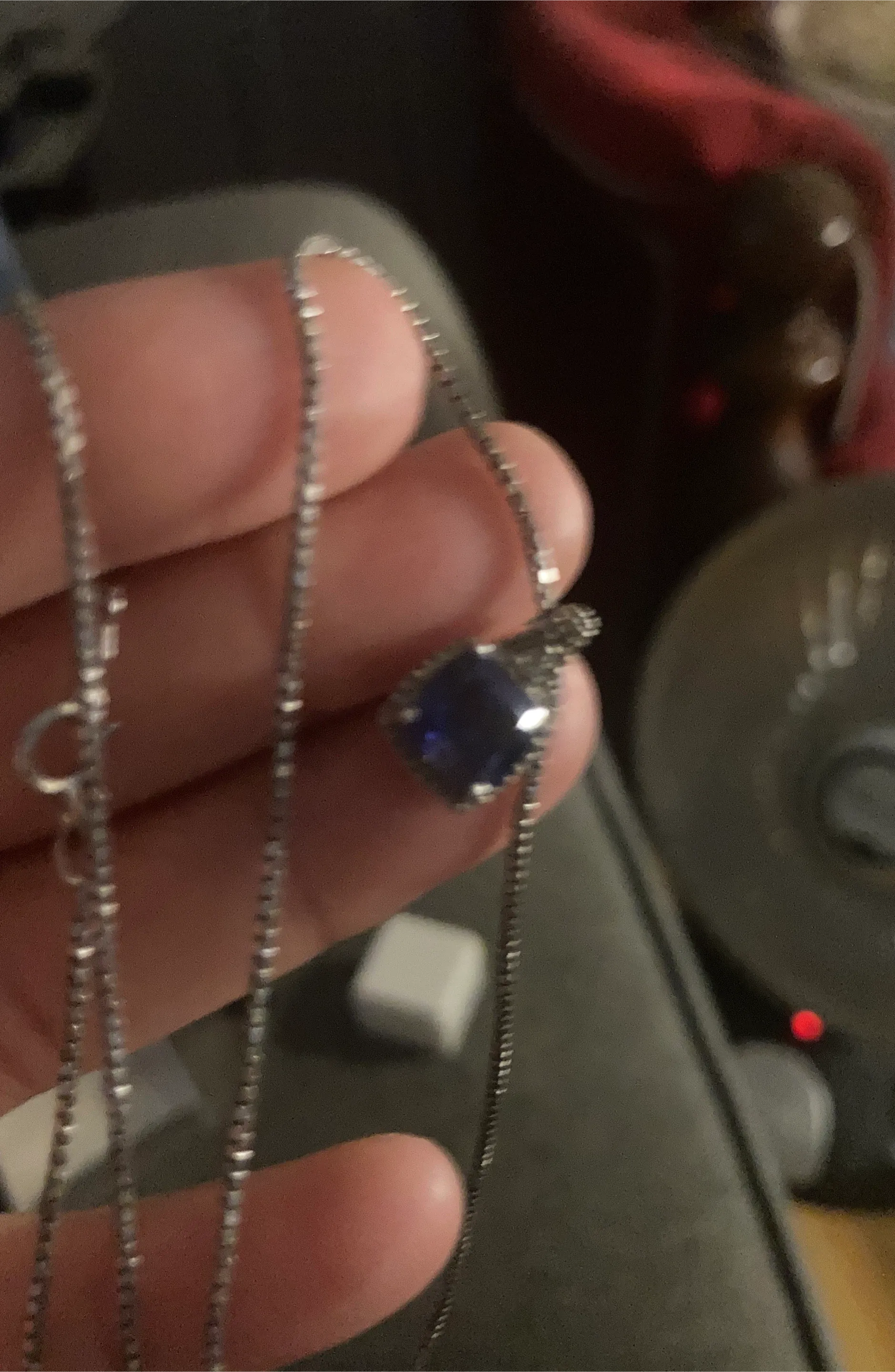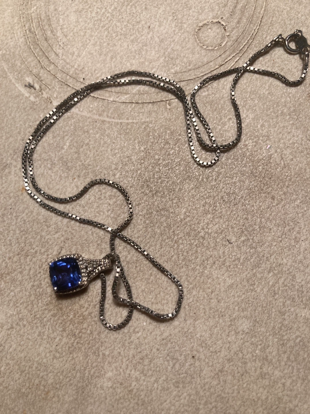 A pretty pendant necklace featuring a blue gemstone . The chain is silver-toned and has a box link style. It's a nice accessory for a nice occasion.