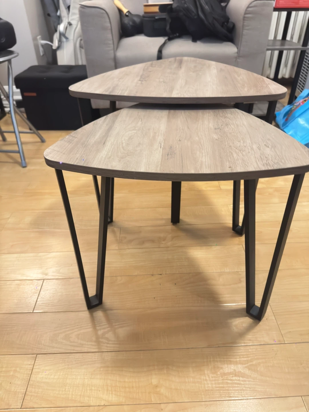 Set of two nesting coffee tables with a wood-grain finish. The tables have triangular tops and black metal legs. They can be used together or separately for convenience.