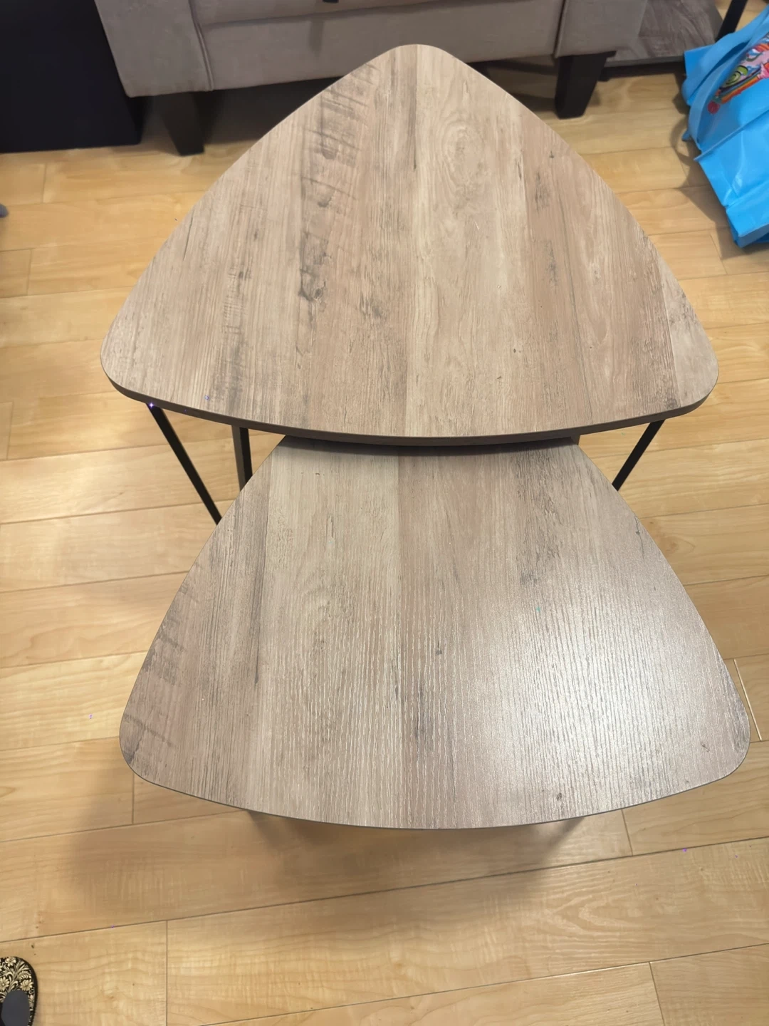 Set of two nesting coffee tables with a wood-grain finish. The tables have triangular tops and black metal legs. They can be used together or separately for convenience.