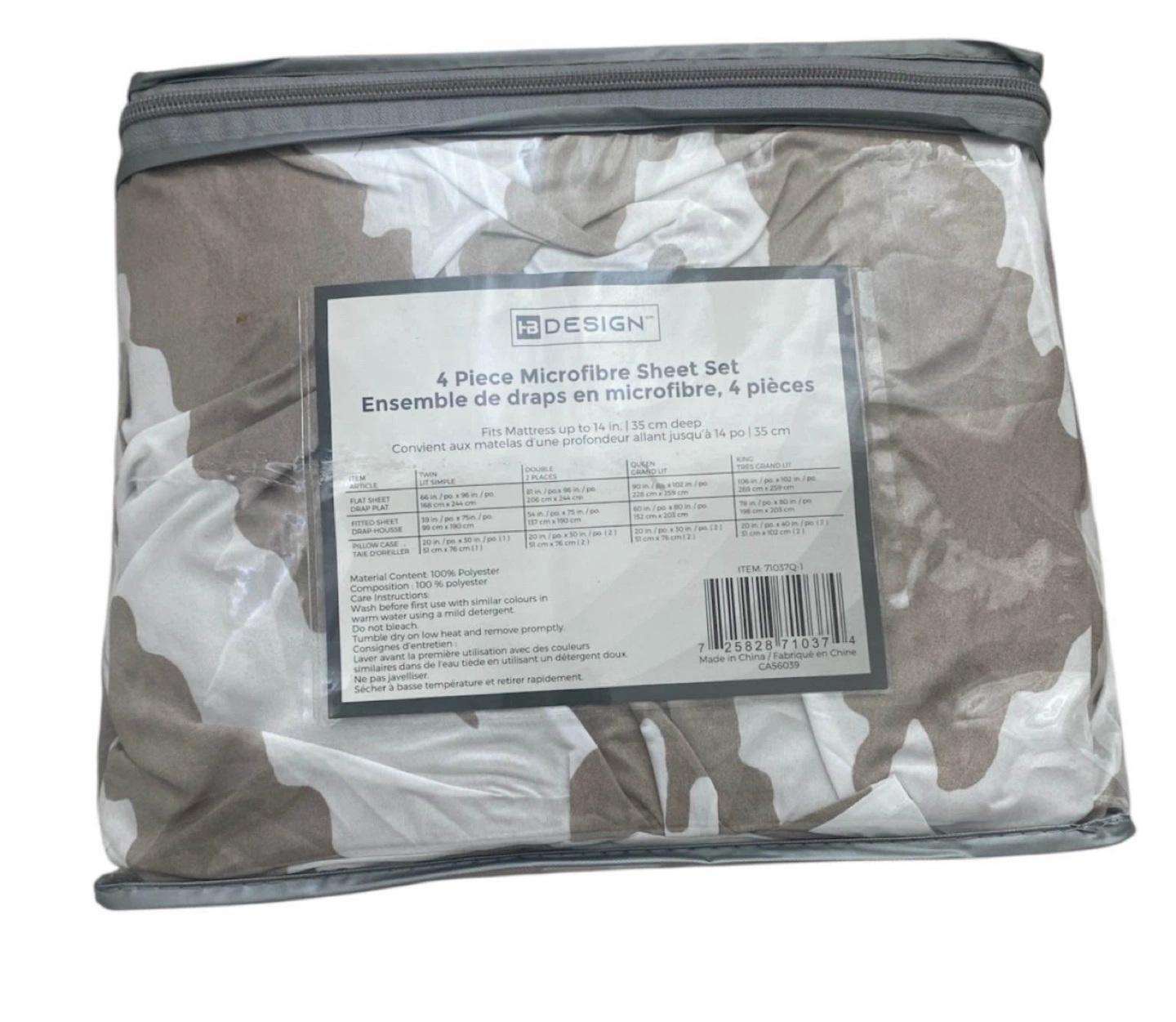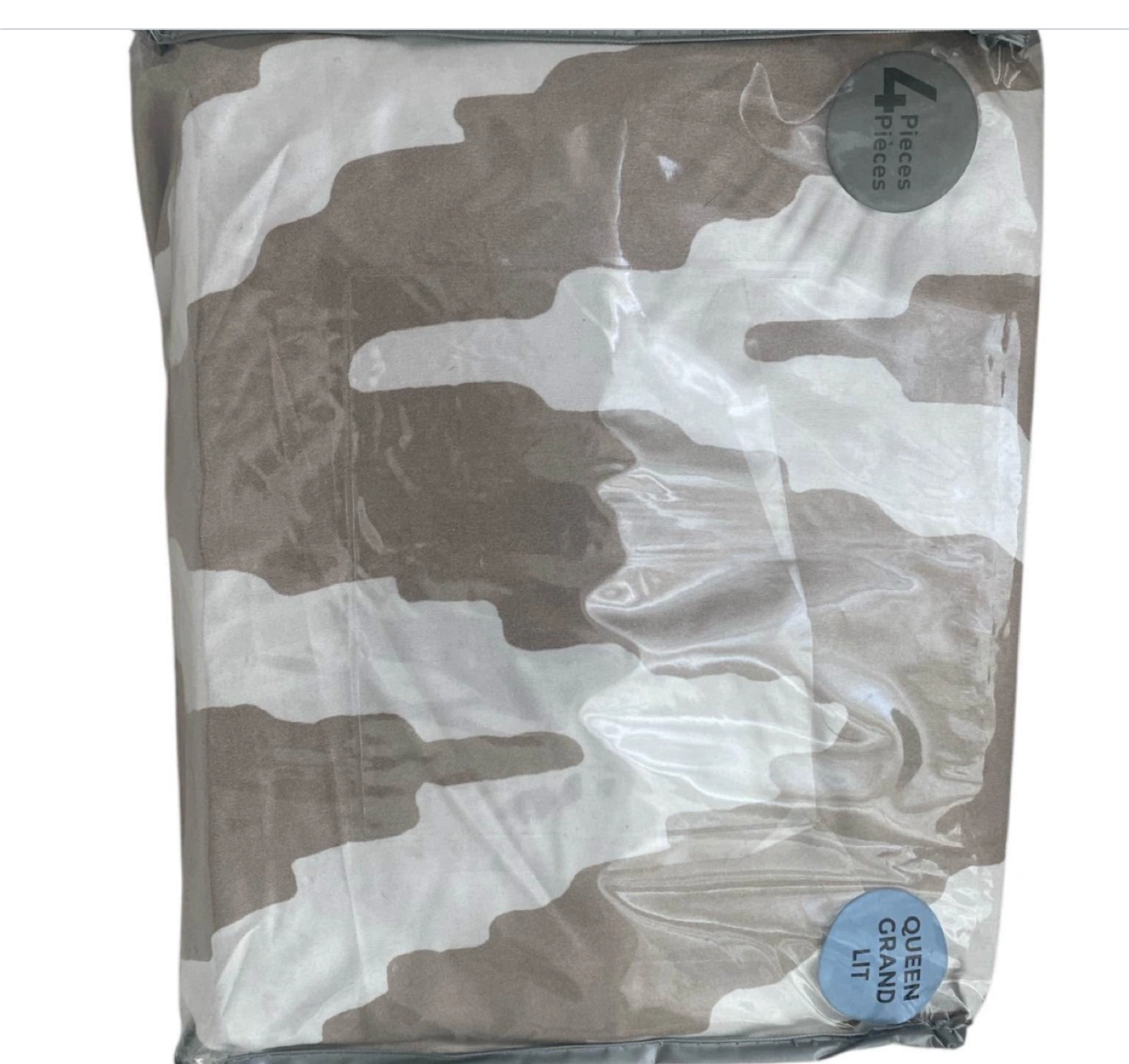 Brand new sheet set in a neutral camo print. The set includes a flat sheet, fitted sheet, and pillowcases. Consider using it for a peaceful and comfortable sleep.