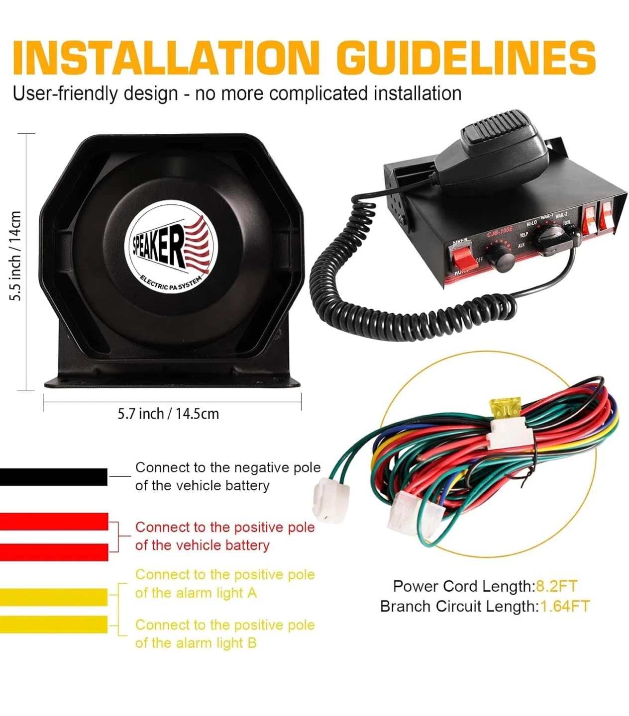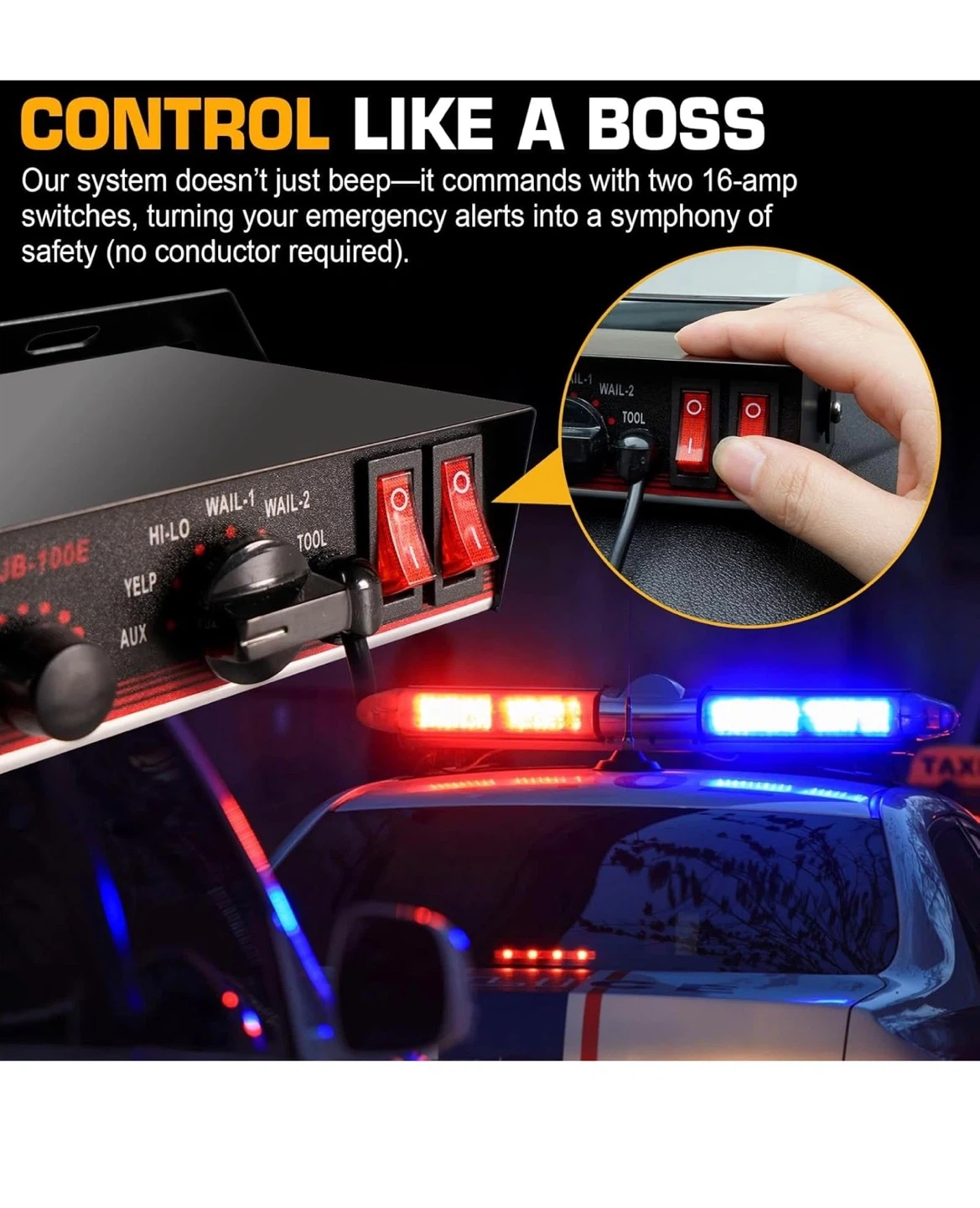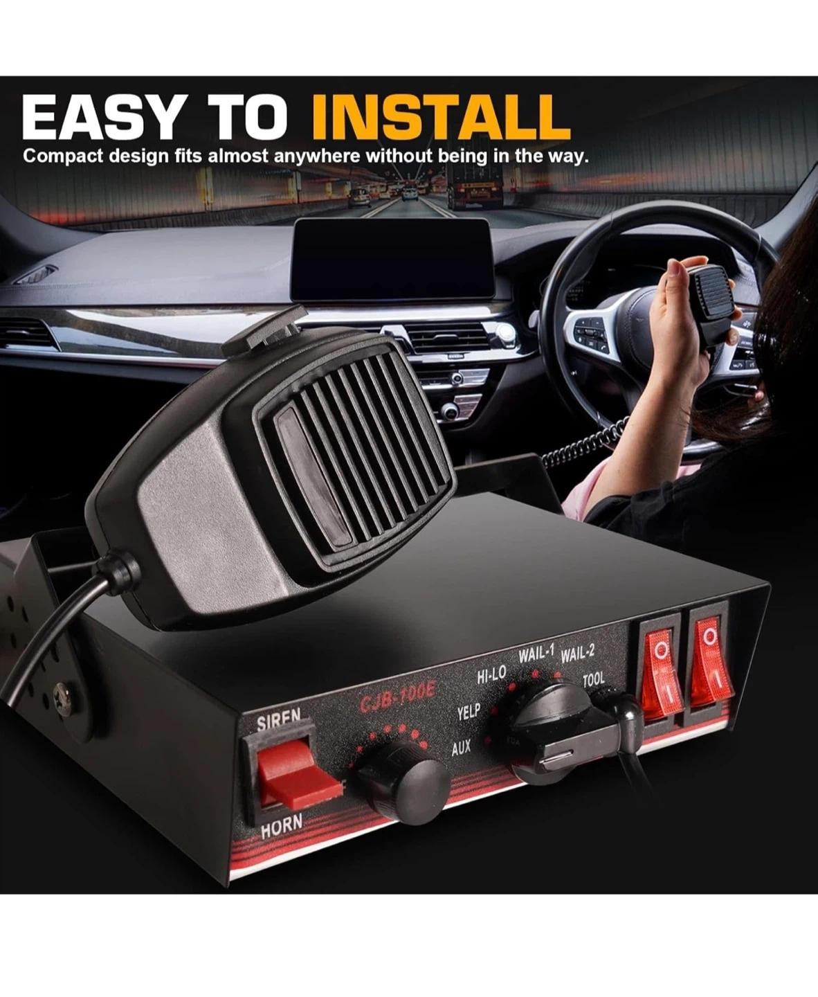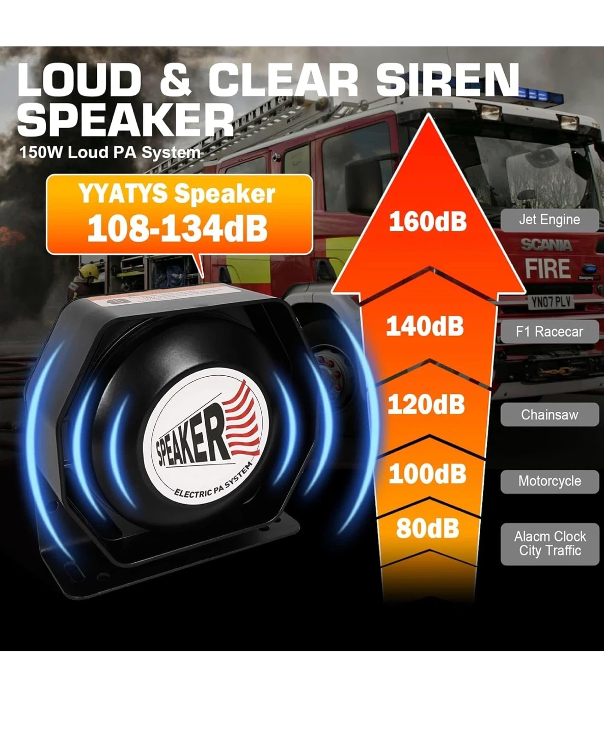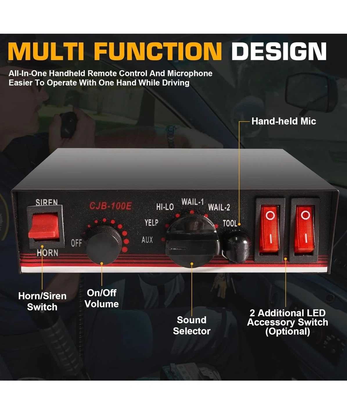 This is a YYATYS CJB-100E 150W emergency vehicle PA system. It includes a handheld microphone and has siren, horn, and multiple sound selector modes like Wail-1, Wail-2, Hi-Lo, Yelp, and Aux. Features two additional accessory switches. It's designed for easy operation and installation.