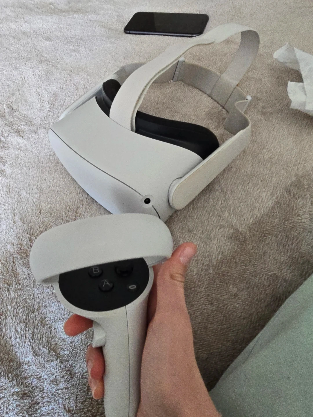 Meta Quest 2 virtual reality headset in white. It comes with two controllers. This headset is great for immersive gaming and experiences!Also cimes with a charger