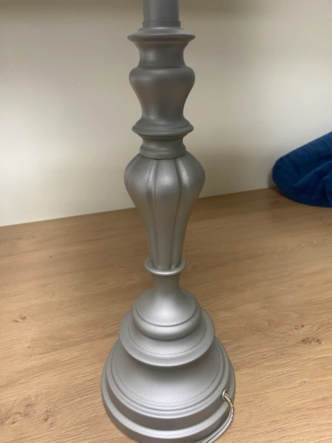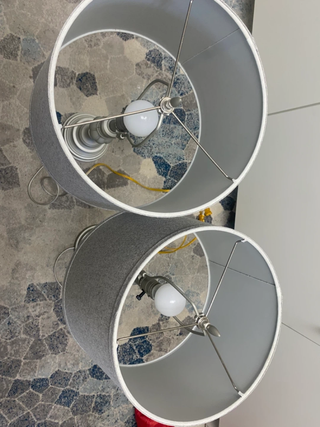 These table lamps have a grey fabric shade and a decorative base. They are a classic design that'll fit most rooms. There's a small crack on one of the base, but it's otherwise in excellent condition. .
