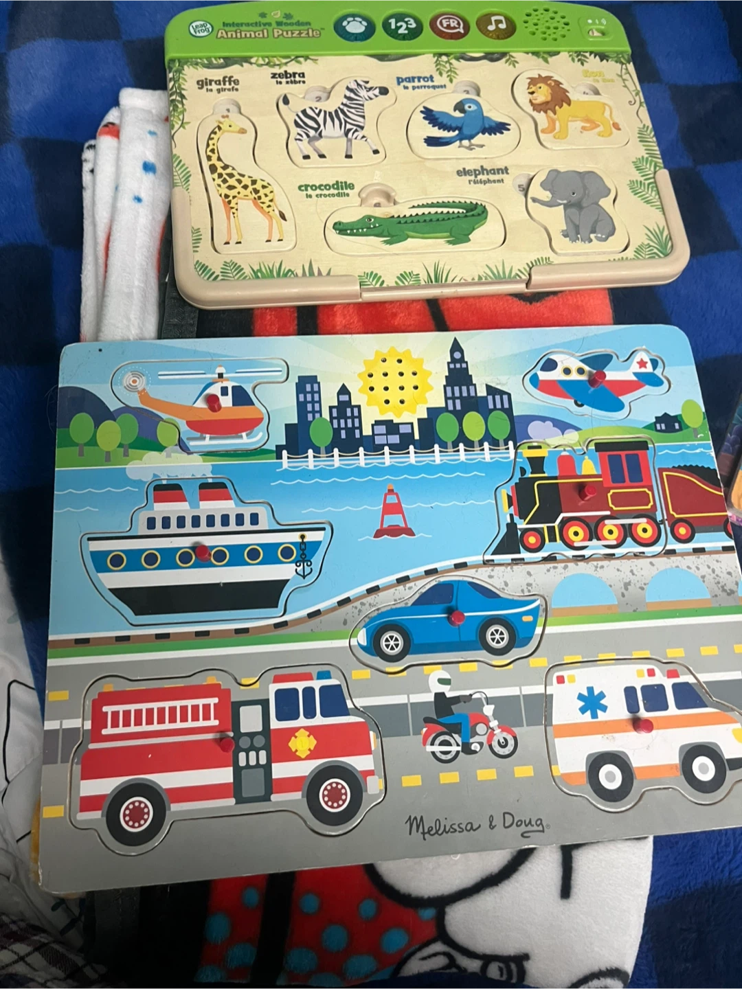 Kids puzzles in good condition. The animal puzzle is in French and English, the vehicles one makes noise.