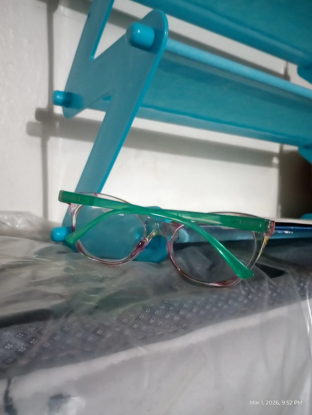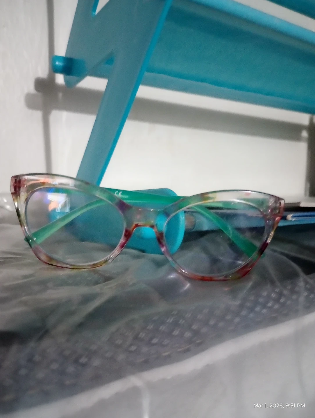 Stylish cat-eye glasses with clear frames and green arms. These glasses are ready for your prescription lenses. They're a fun accessory for everyday wear! (As It Is, No Refunds)