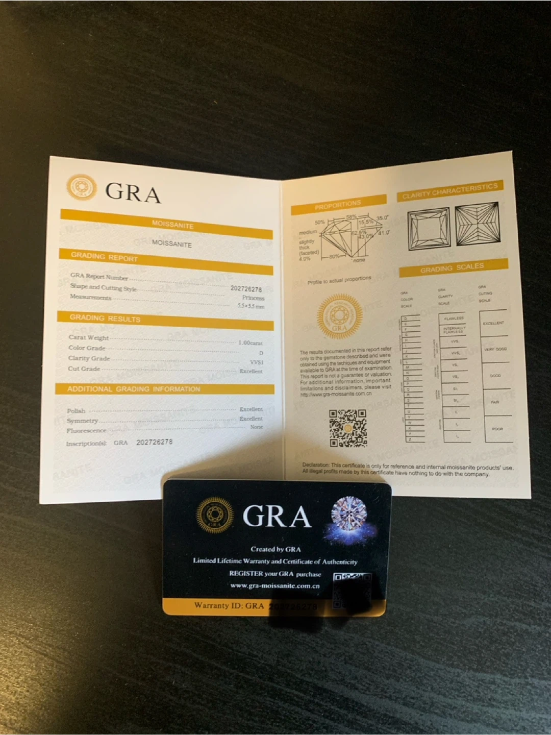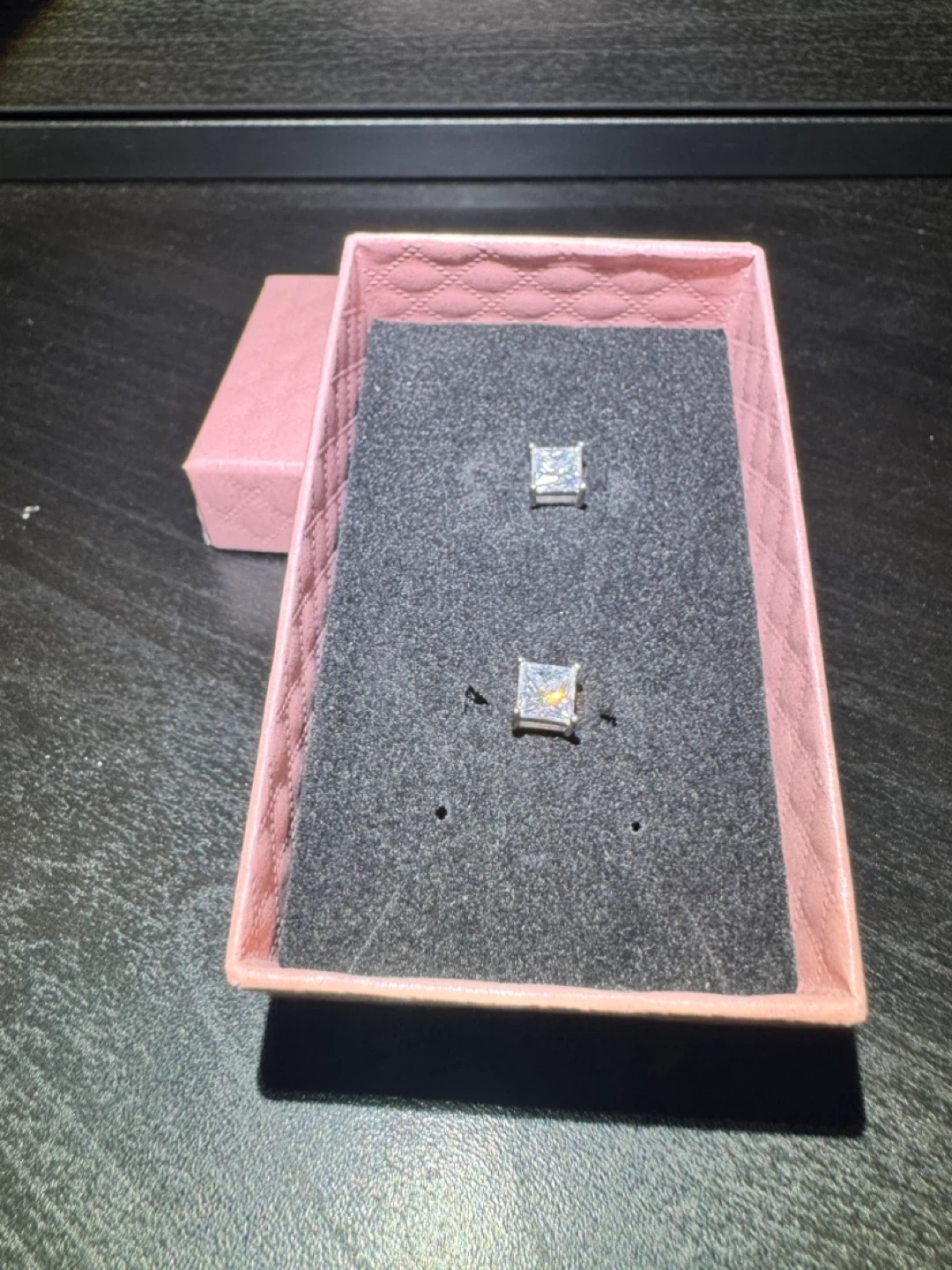 15VVS1 Moissanite (Lab-Grown Diamond) 5x5mm 1.0 CT each (2.0 CT total) 925 Sterling Silver Passes Diamond Tester Brand New, Never Worn. Comes with GRA certificate and box. Limited lifetime warranty. Shiny and Sparkly. Feel free to shoot any offers or questions! I can meet wherever is most convenient for you!