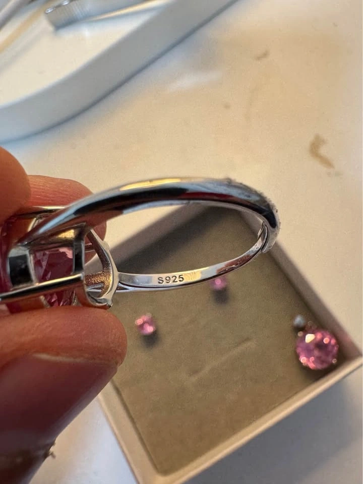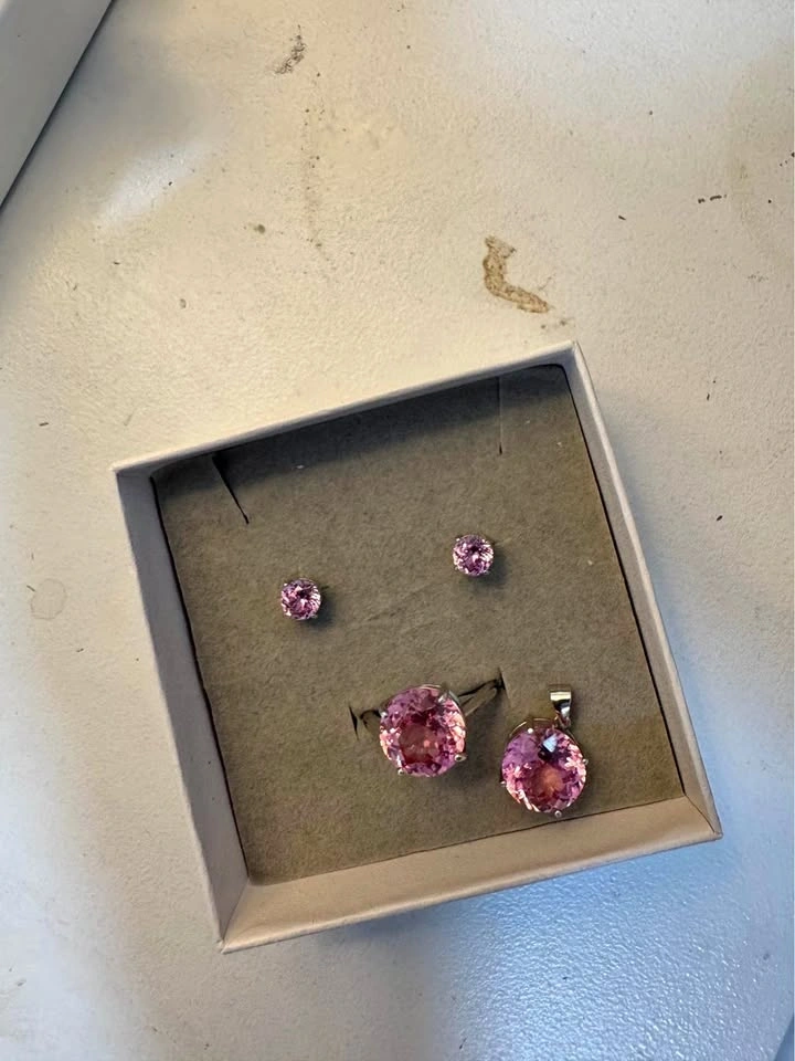 Beautiful Sterling Silver jewelry set featuring a matching pendant, stud earrings, and ring with sparkling pink stones. Sterling silver setting, pink crystal-style stones. Includes pendant, studs, and ring. Elegant matching set. Great for gifting, special occasions, or everyday wear. Excellent condition. A pretty, eye-catching set that looks lovely together. Pick up in Maple Ridge area or I can deliver to nearby area.