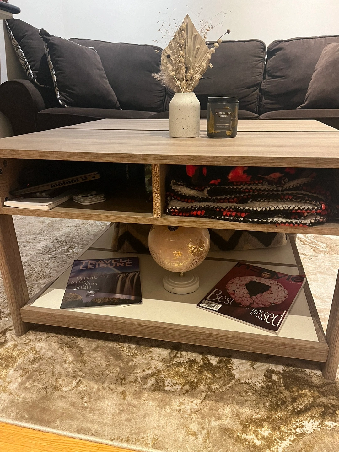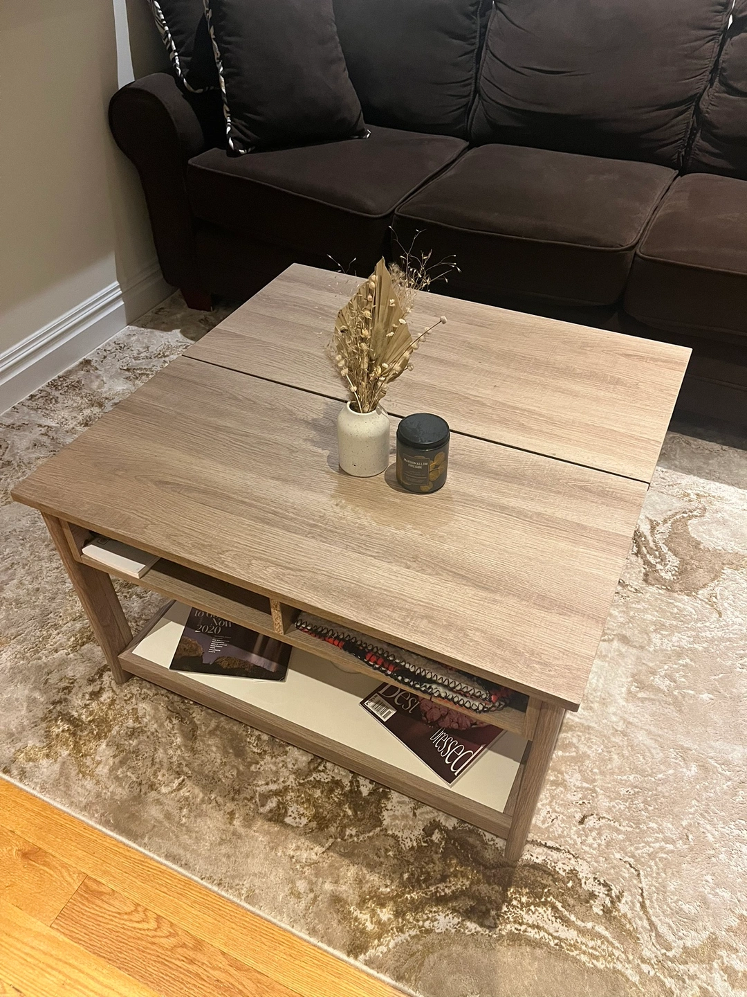 Light brown wood coffee table with lift top on one side. Storage under lift top and two compartments in front. Bottom shelf underneath with white finish. 2 years old - originally purchased for $350.
