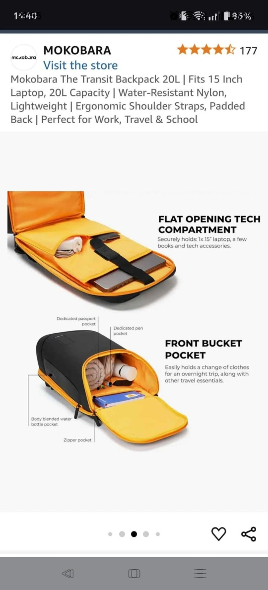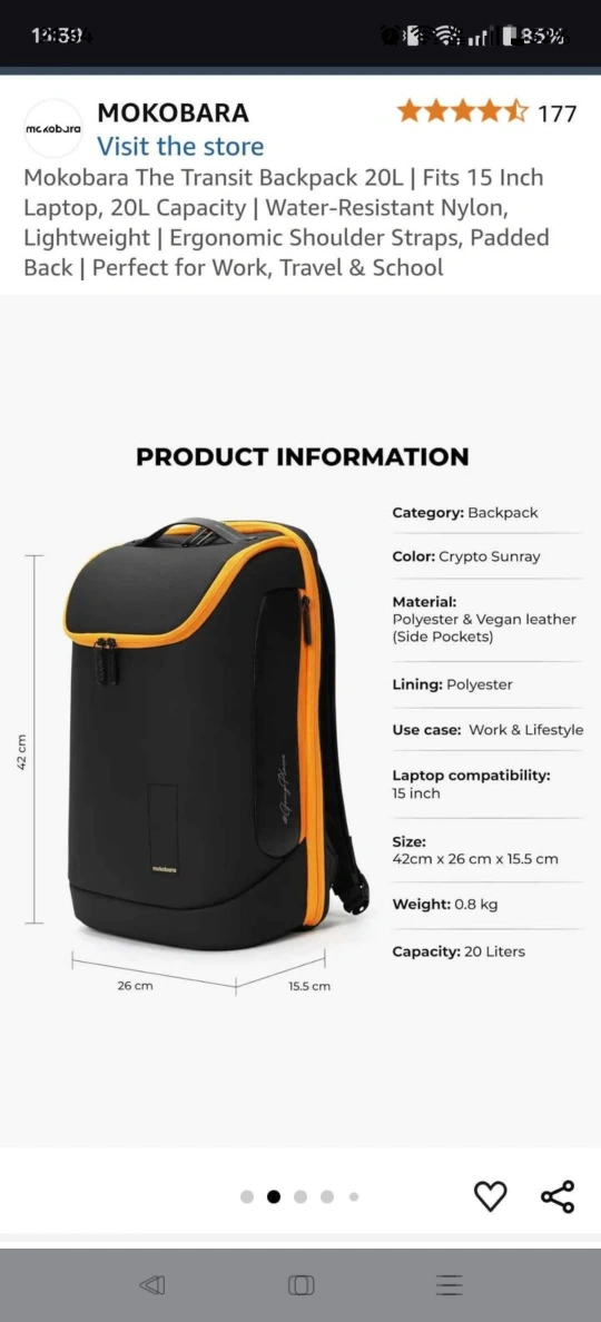65Looking to sell my Mokobara Transit Backpack in Crypto Sunray colour. It's a 20L backpack perfect for work, travel, and school. It fits a 15-inch laptop and is made with water-resistant nylon. Features include ergonomic shoulder straps and a padded back for extra comfort. The backpack is made of polyester and vegan leather with a polyester lining. Dimensions are 42cm x 26cm x 15.5cm