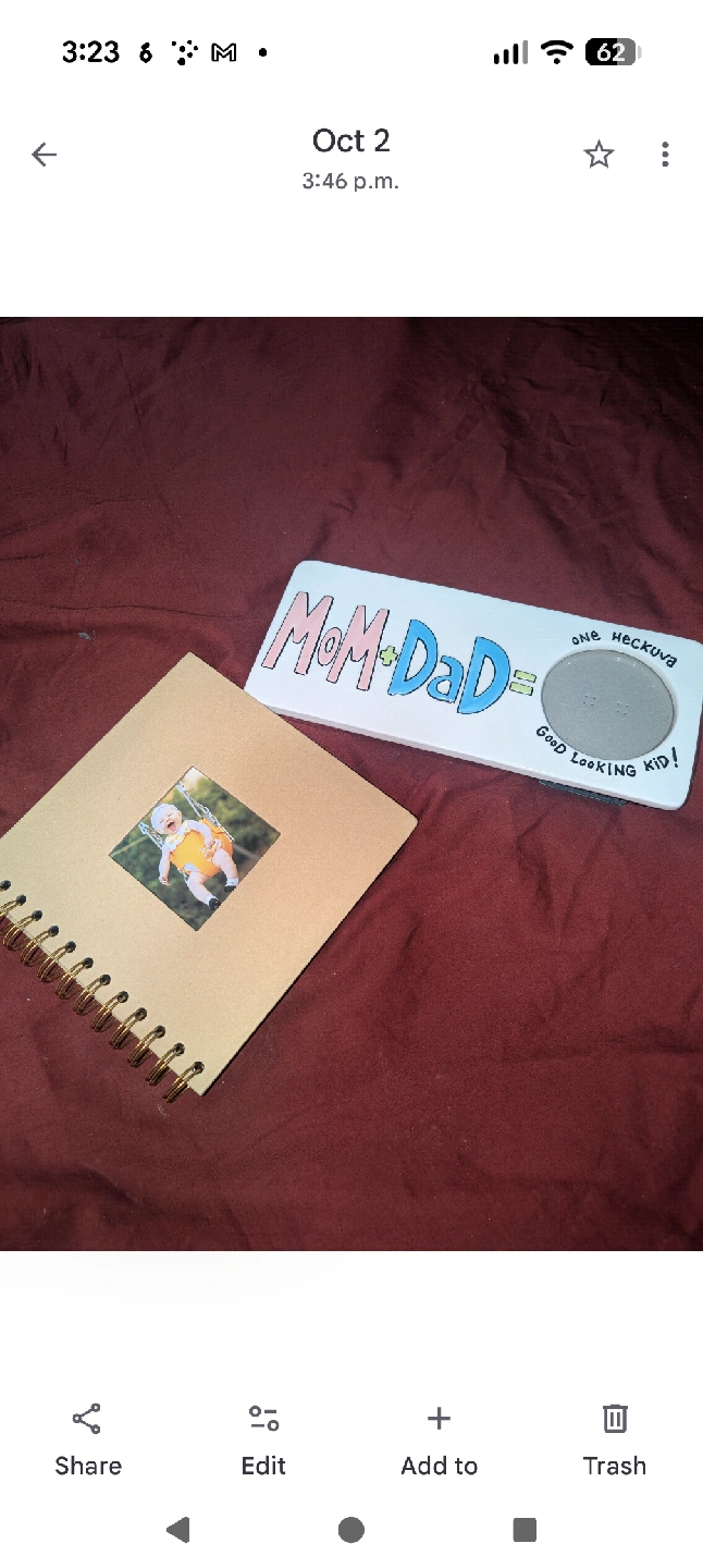 78Selling a cute picture frame that says "Mom & Dad = One Heckuva Good Looking Kid!" along with a baby album. Both are in great condition and ready for a new home