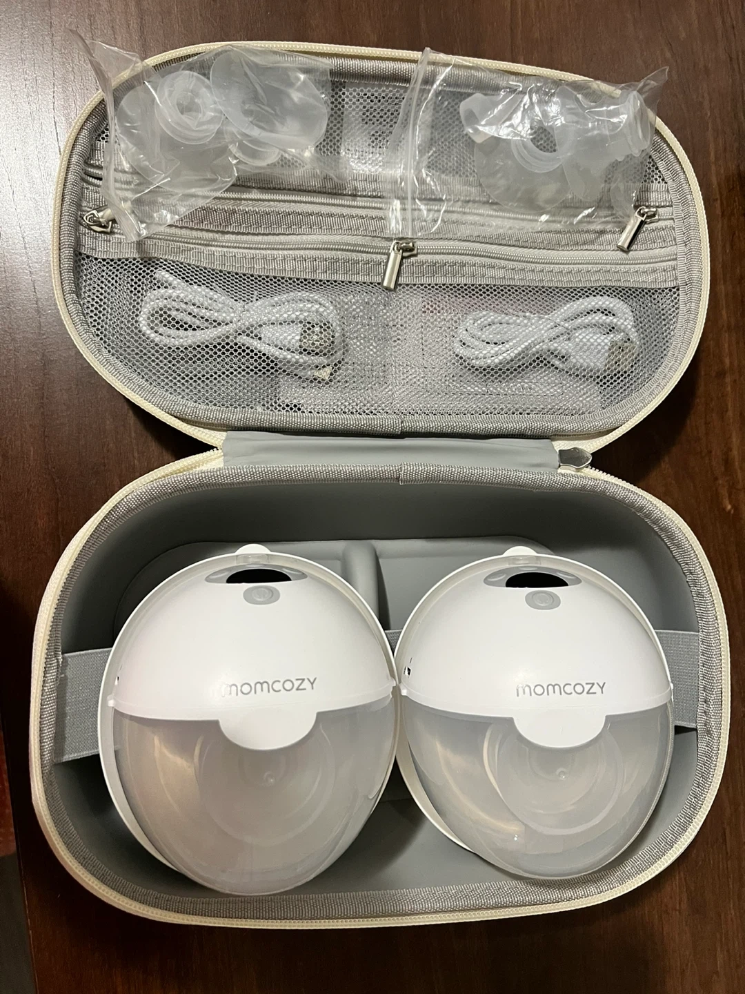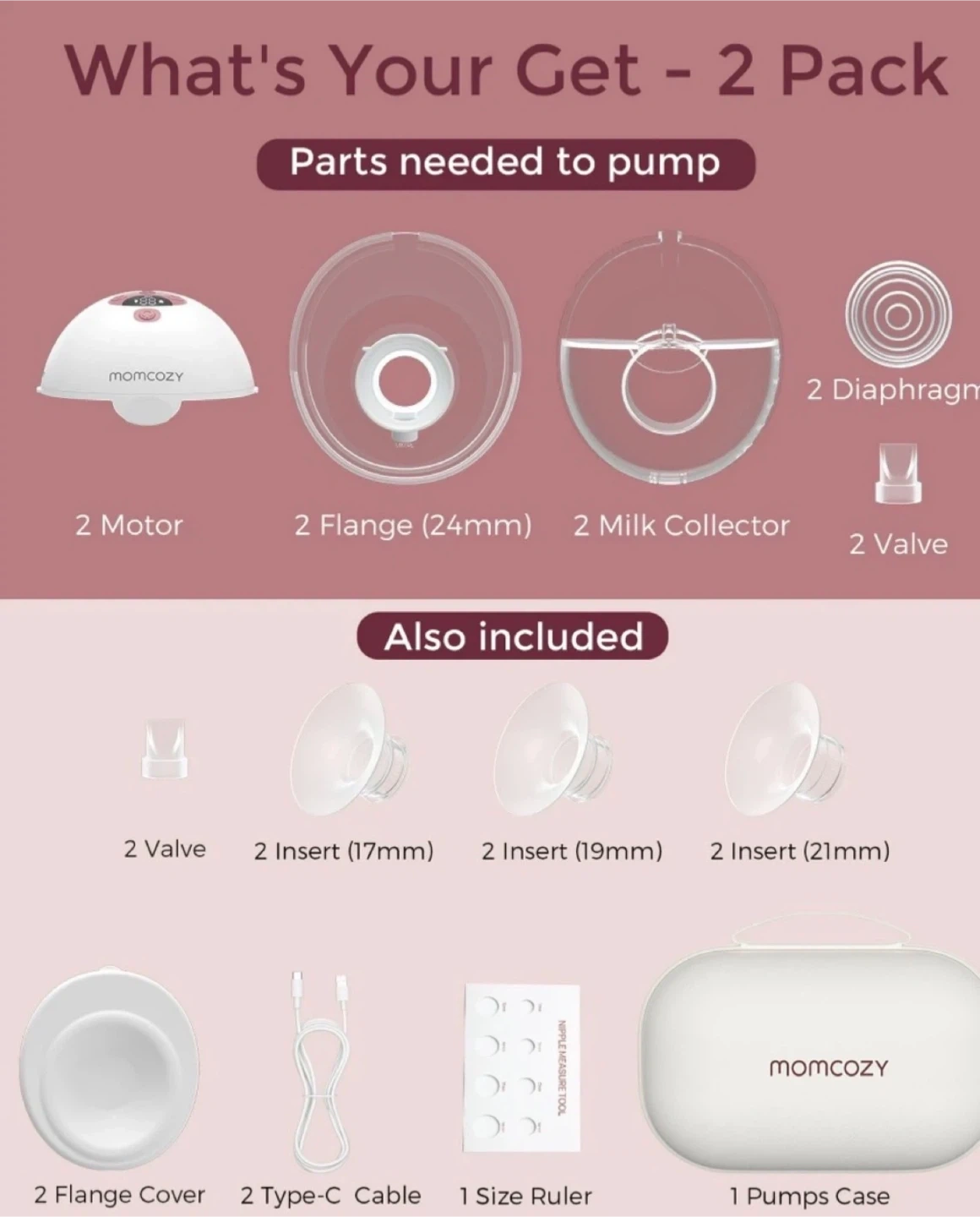 Selling a Momcozy M5 wearable breast pump that is a convenient and hands-free solution for pumping on the go. It includes a 2-pack with two motors, flanges (24mm), milk collectors, diaphragms, valves, valve inserts (17mm, 19mm, 21mm), flange covers, Type-C cables, a size ruler, and a pump case It has a Double-Sealed Flange for Baby-Like Comfort, 3 Modes & 9 Suction Levels, Portable Electric Pump – 24mm, 2-Pack In great condition - As good as new - Used only once