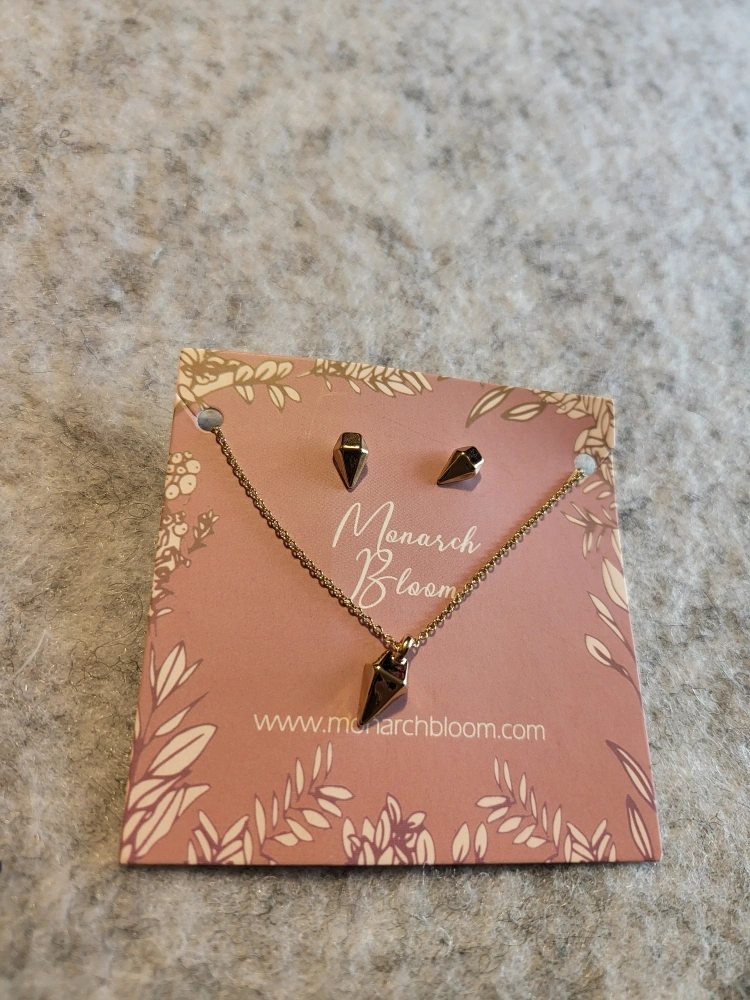 82Selling a cute Monarch Bloom necklace and earring set! The set features a matching necklace and stud earrings with a unique geometric design. Perfect for adding a touch of modern elegance to any outfit. Please message to arrange pick up in Marda Loop. See my other ads, open to deals for multiple purchases.
