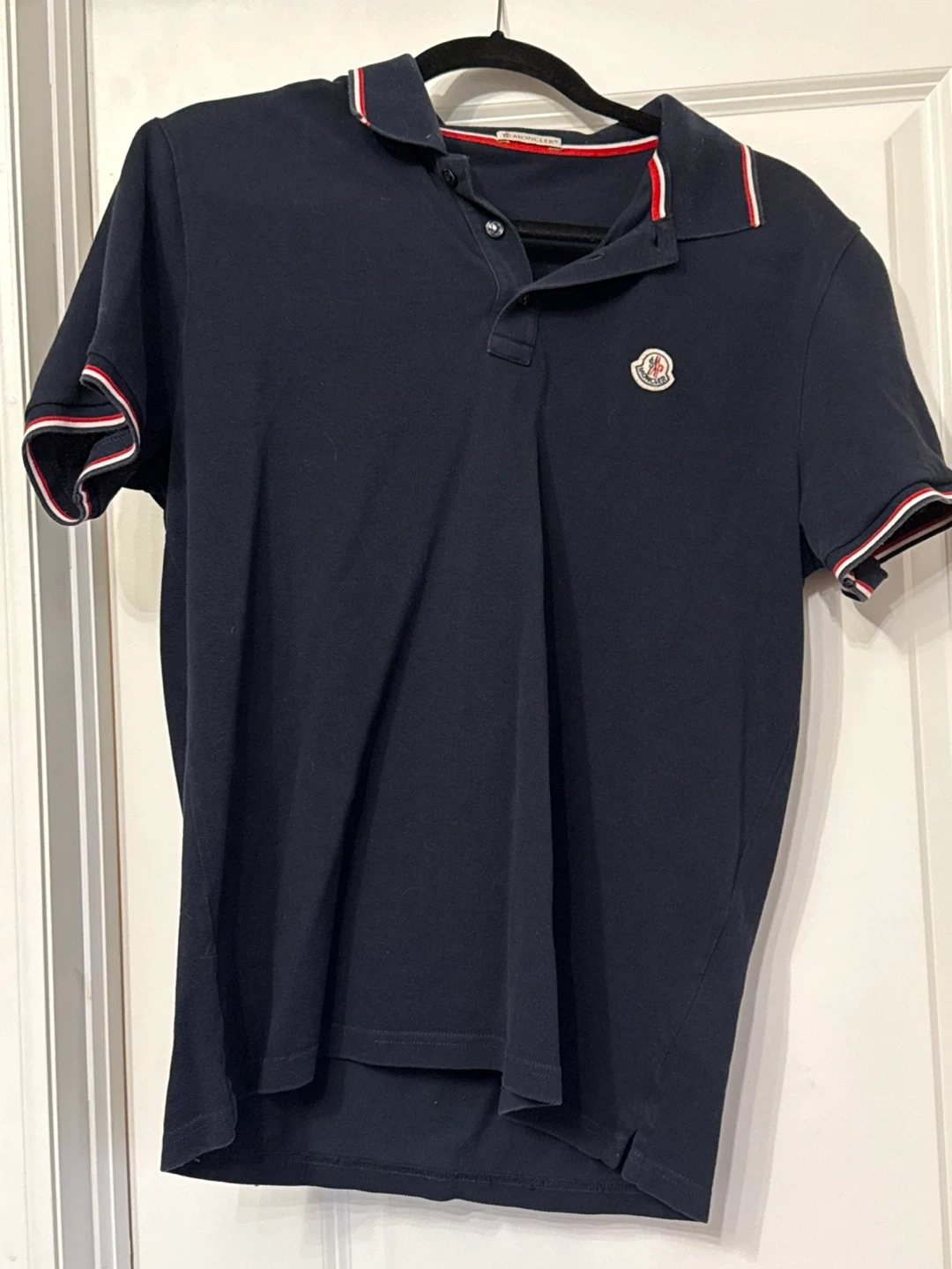 90Selling a Moncler polo shirt in navy. It features a classic design with red and white detailing on the collar and sleeves. The Moncler logo is subtly placed on the chest. A great addition to any wardrobe!
