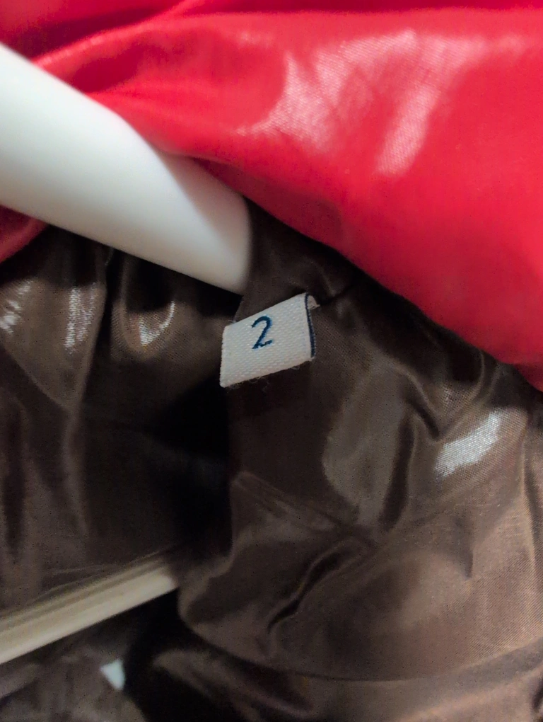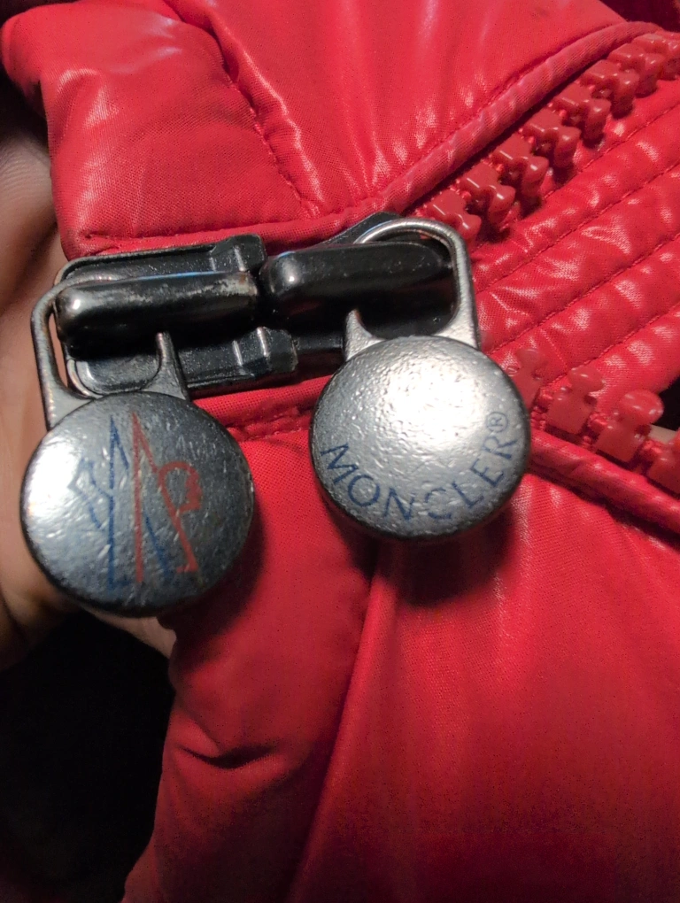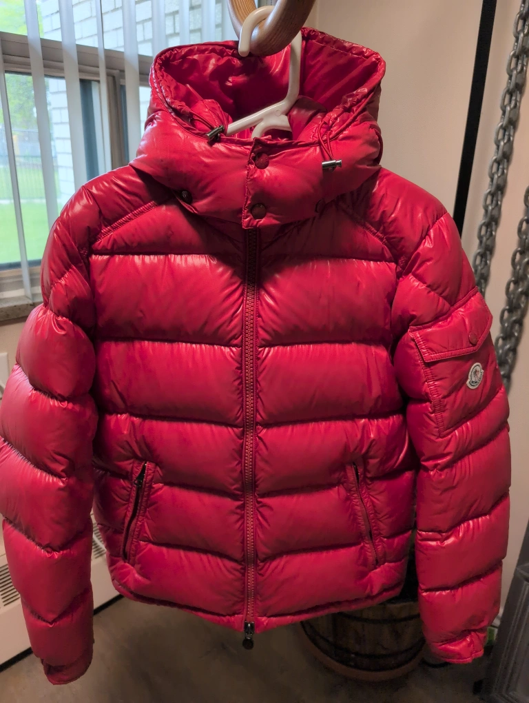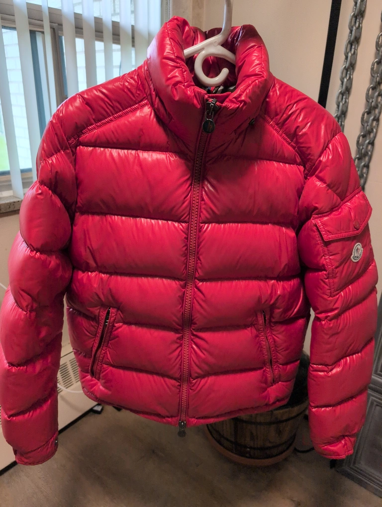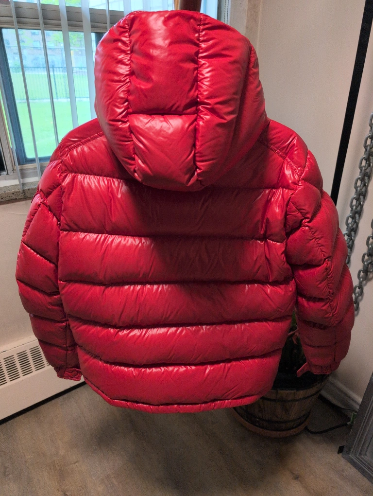 A vibrant red puffer jacket. It has a zip closure, a high collar, and pockets. Buttons feature the brand's logo. This puffer jacket is perfect for keeping you cozy on a chilly day.