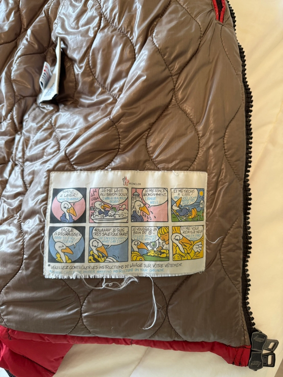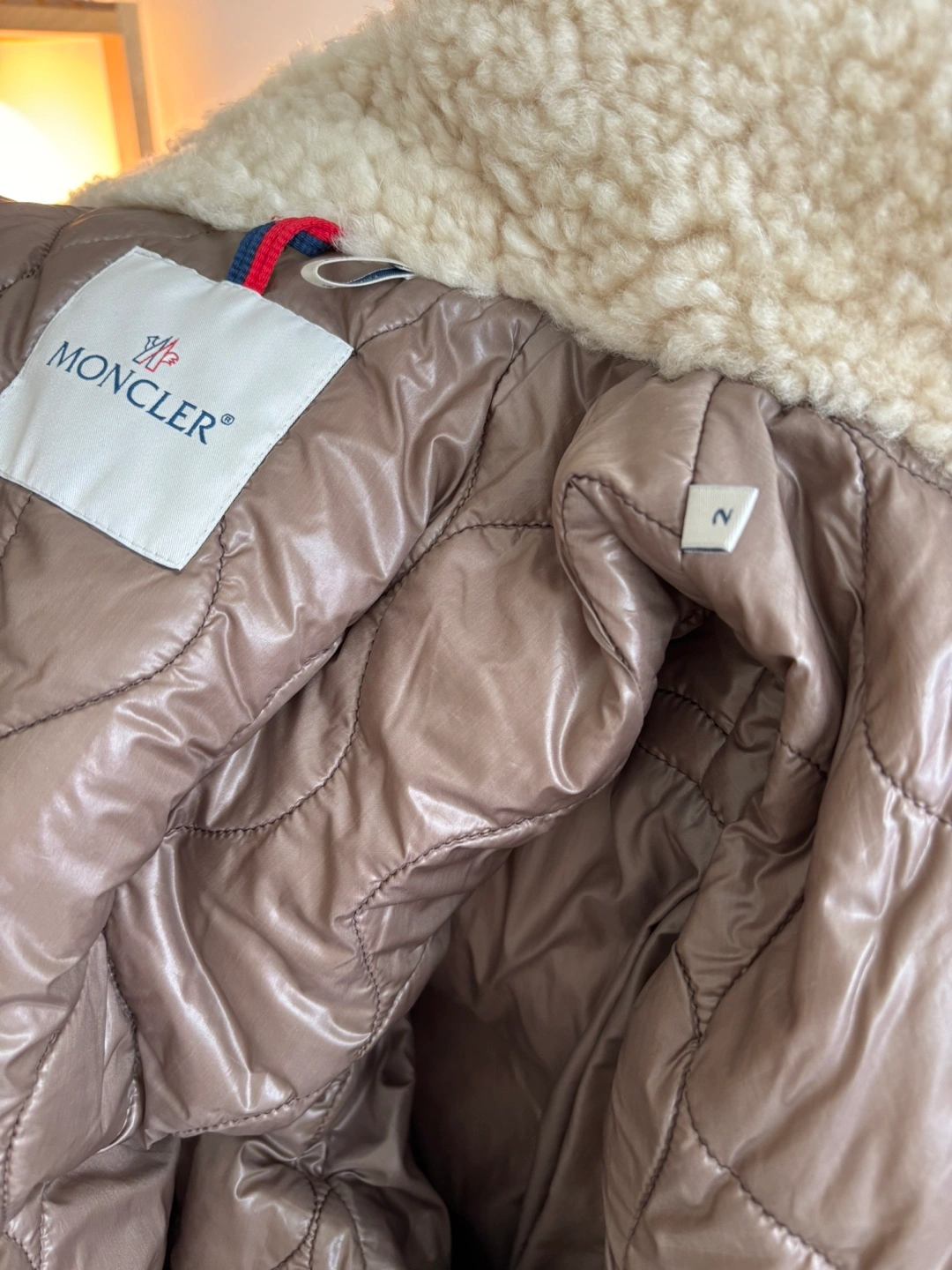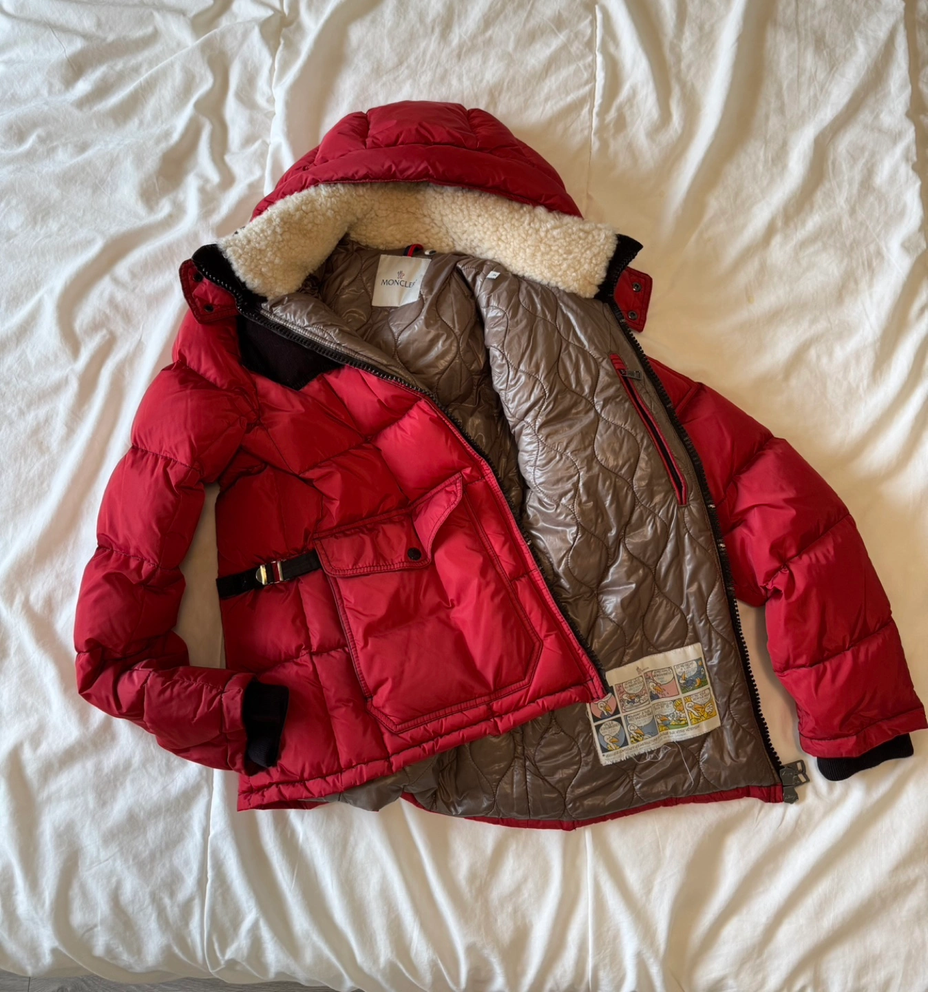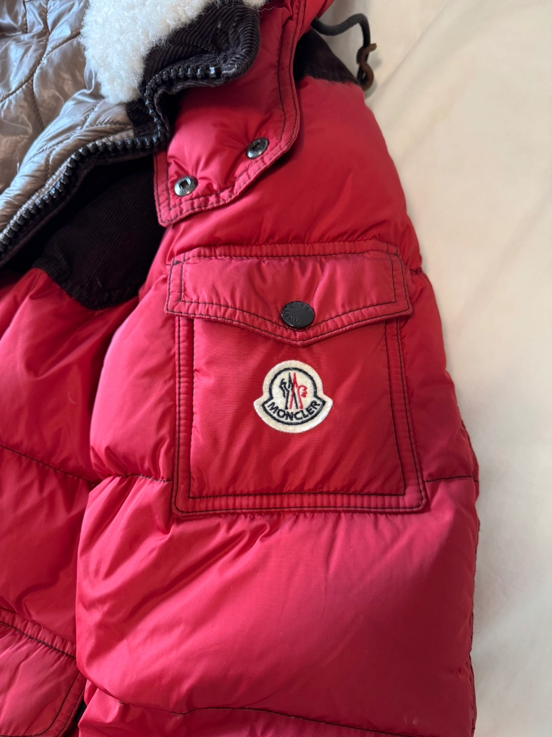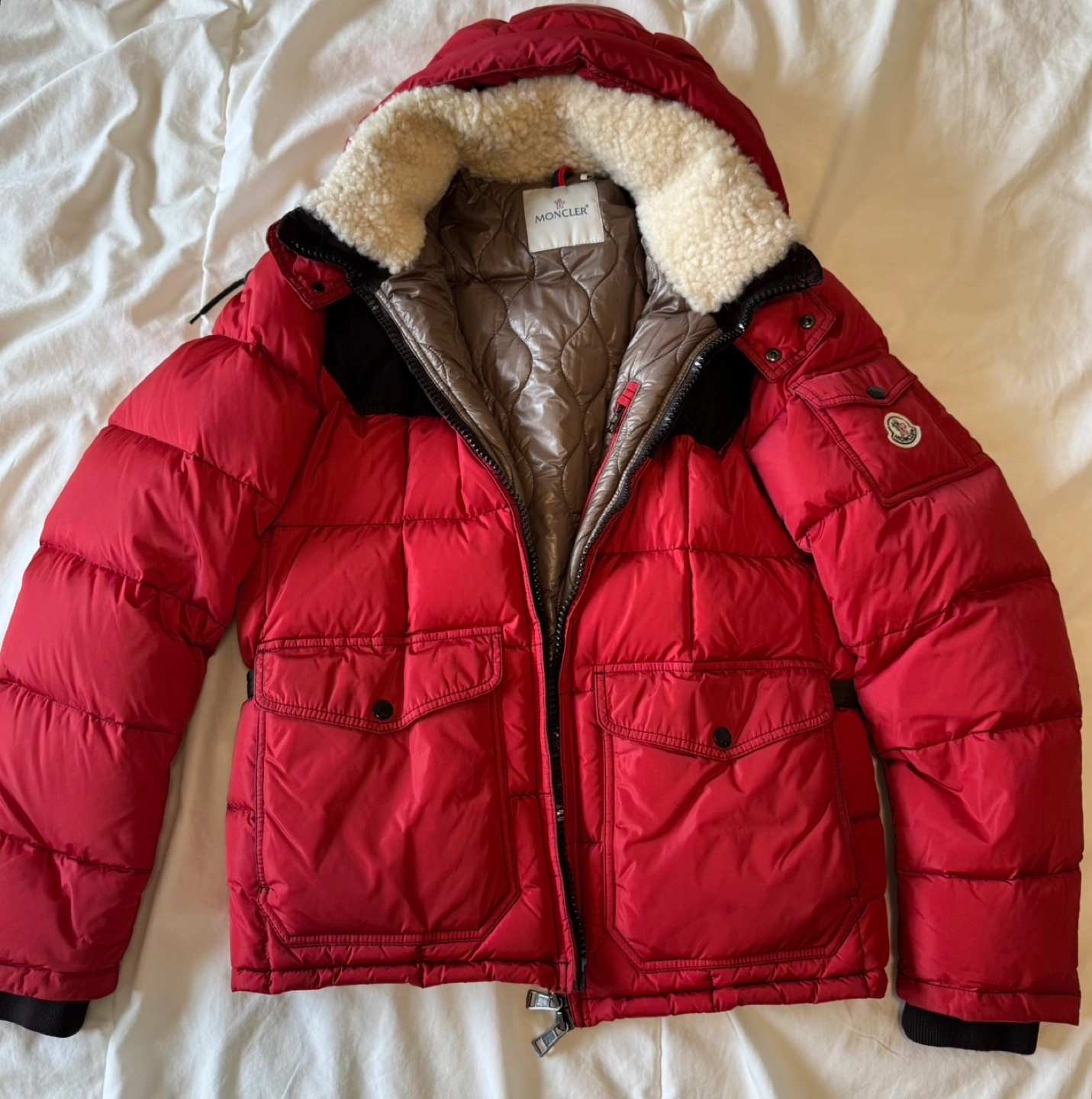 17Moncler authentic Red down jacket for men with a fleece hood. Size 2.