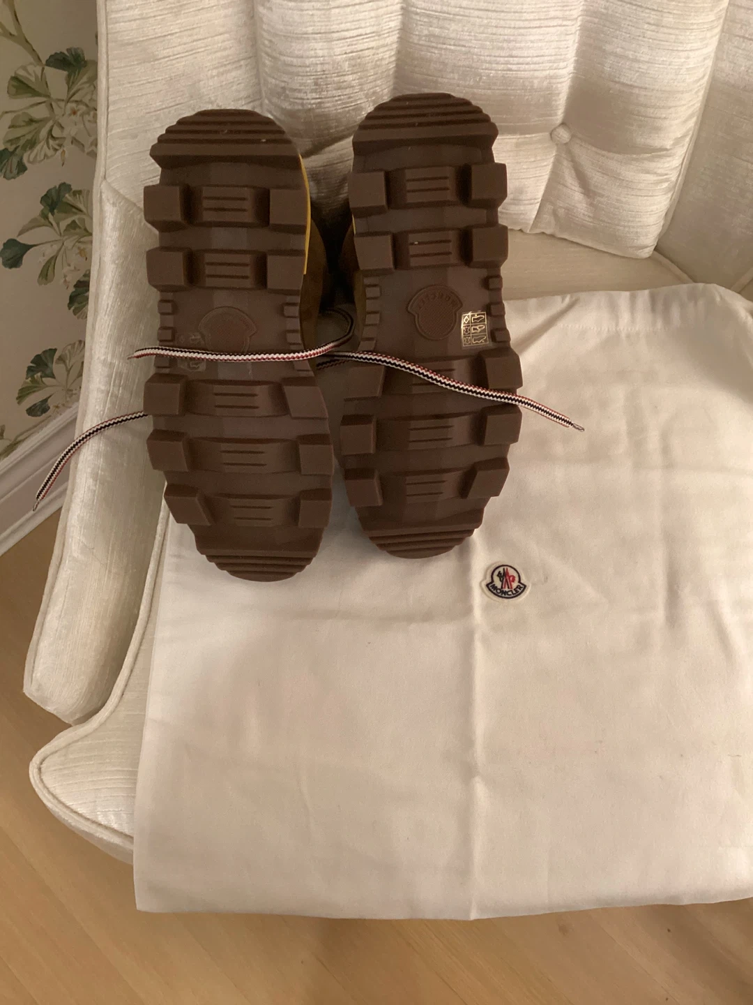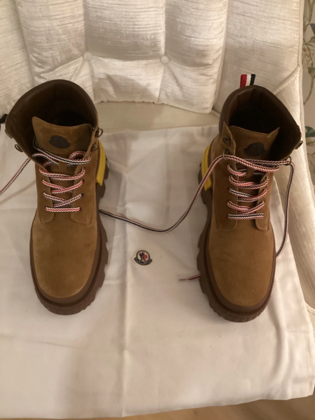60Selling a pair of Moncler ankle boots in size 42.5. These stylish boots feature a suede exterior and a rugged sole, perfect for adding a touch of luxury to your everyday look. They are in great condition and come with the original dust bag.